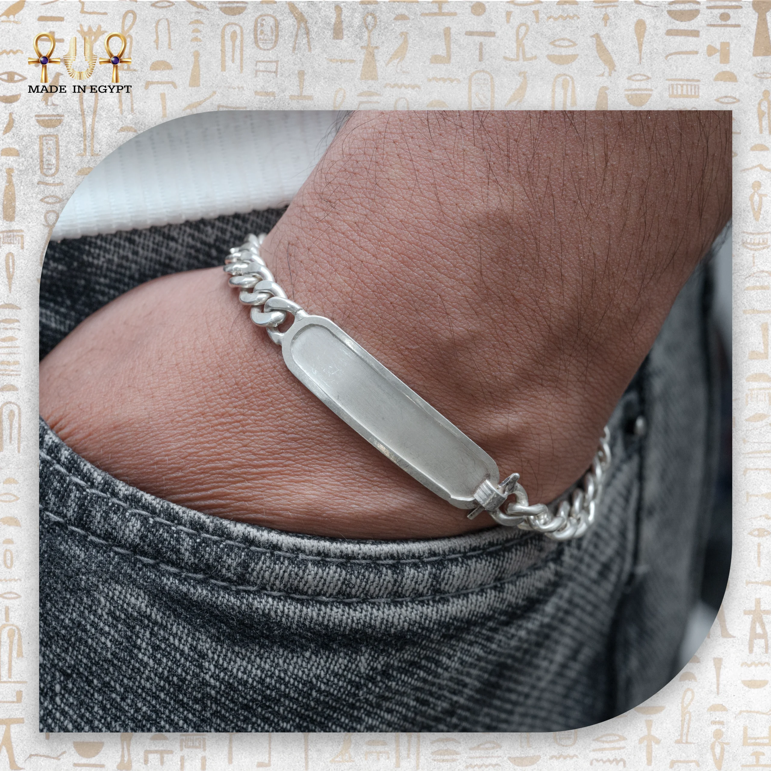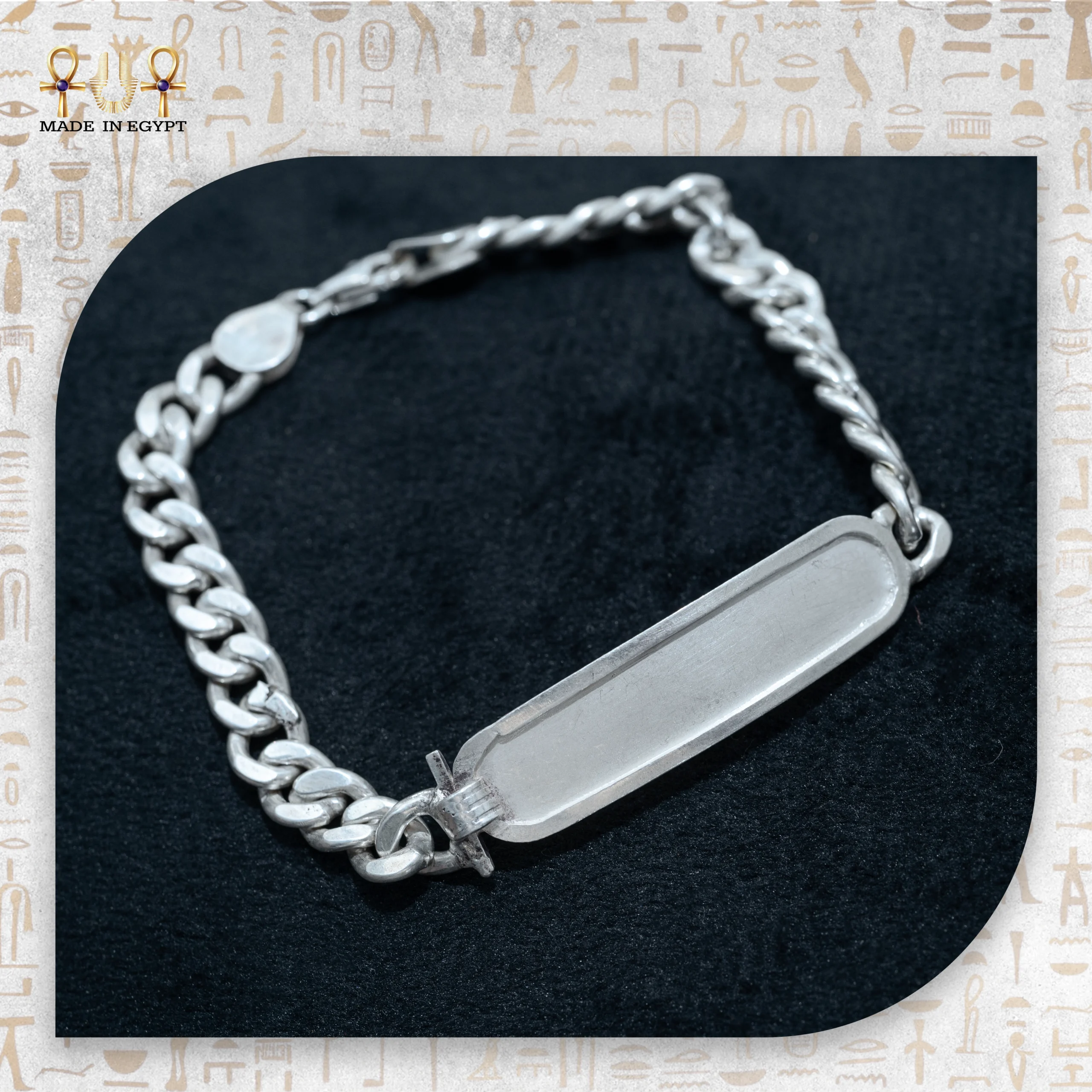 صُمم السوار على شكل كارتوش مستطيل أنيق. وهو الشكل الذي كان يُنقش بداخله اسم الفرعون. لم يكن هذا الشكل مجرد زخرفة، بل رمزًا للحماية من النسيان. واليوم، يمكن تخصيص سوار كارتوش فضي بنقش اسمك أو رمز هيروغليفي يعكس شخصيتك وهويتك.