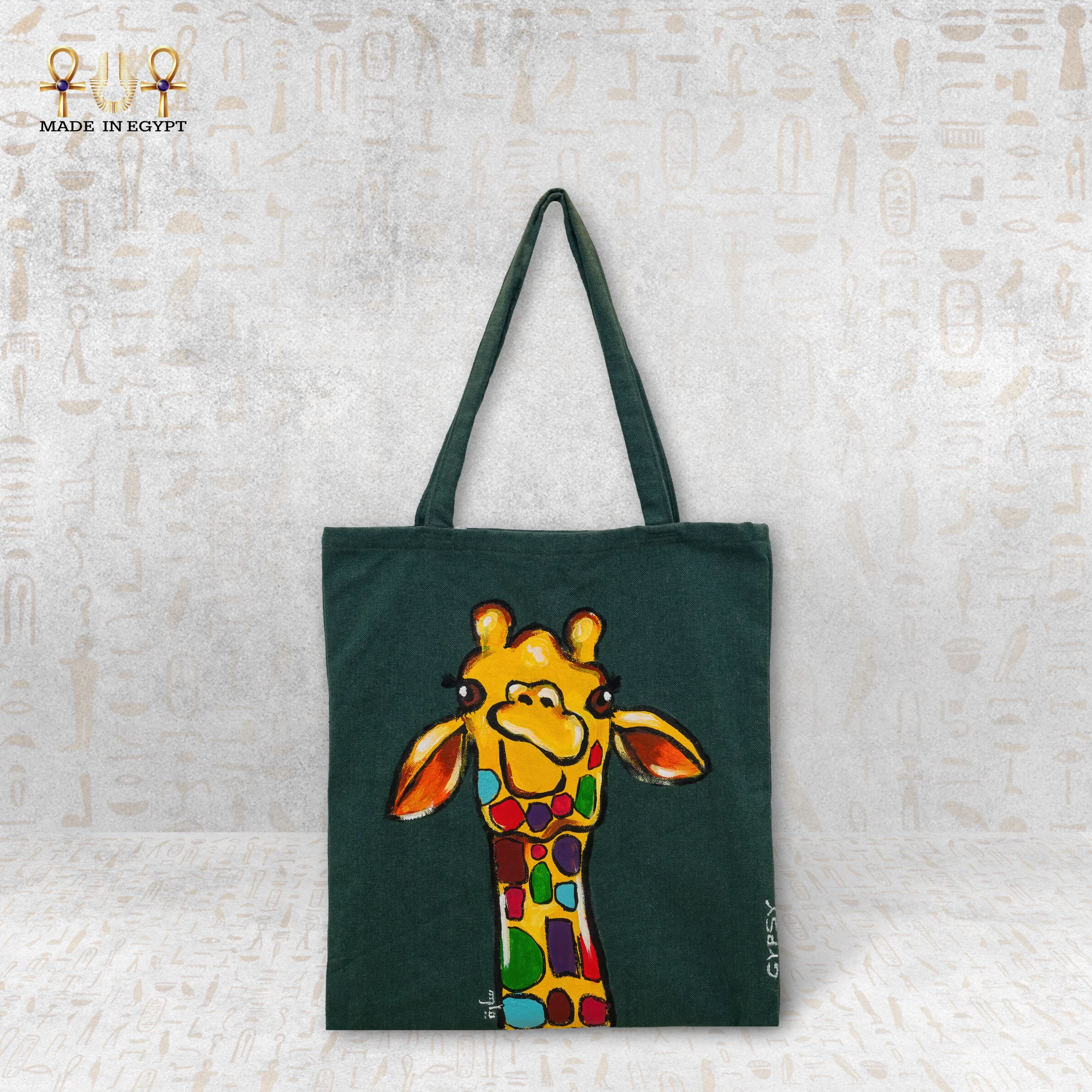 شنطة فنية مرسومة يدويًا بتصميم زرافة مبهج وألوان نابضة بالحياة تضيف روح مرحة لأي إطلالة.