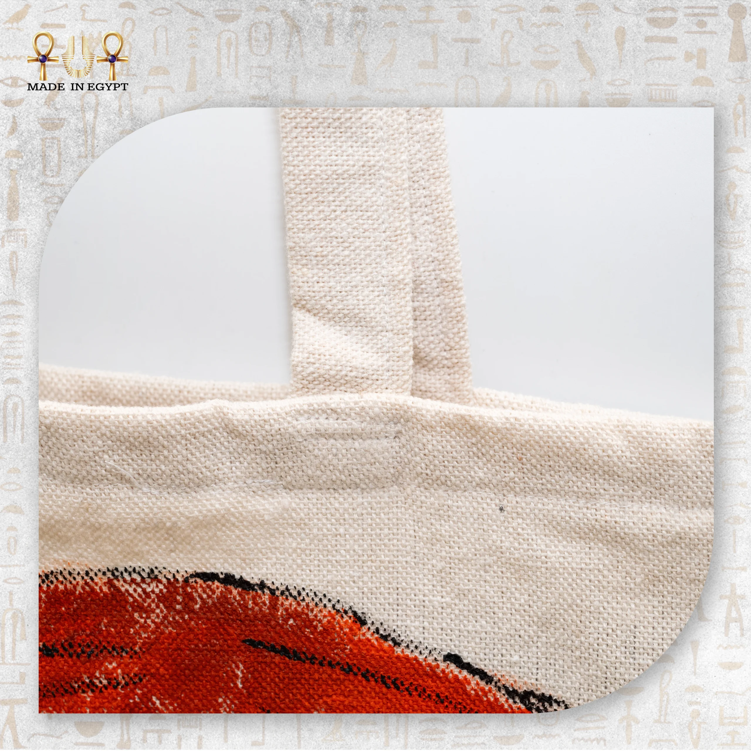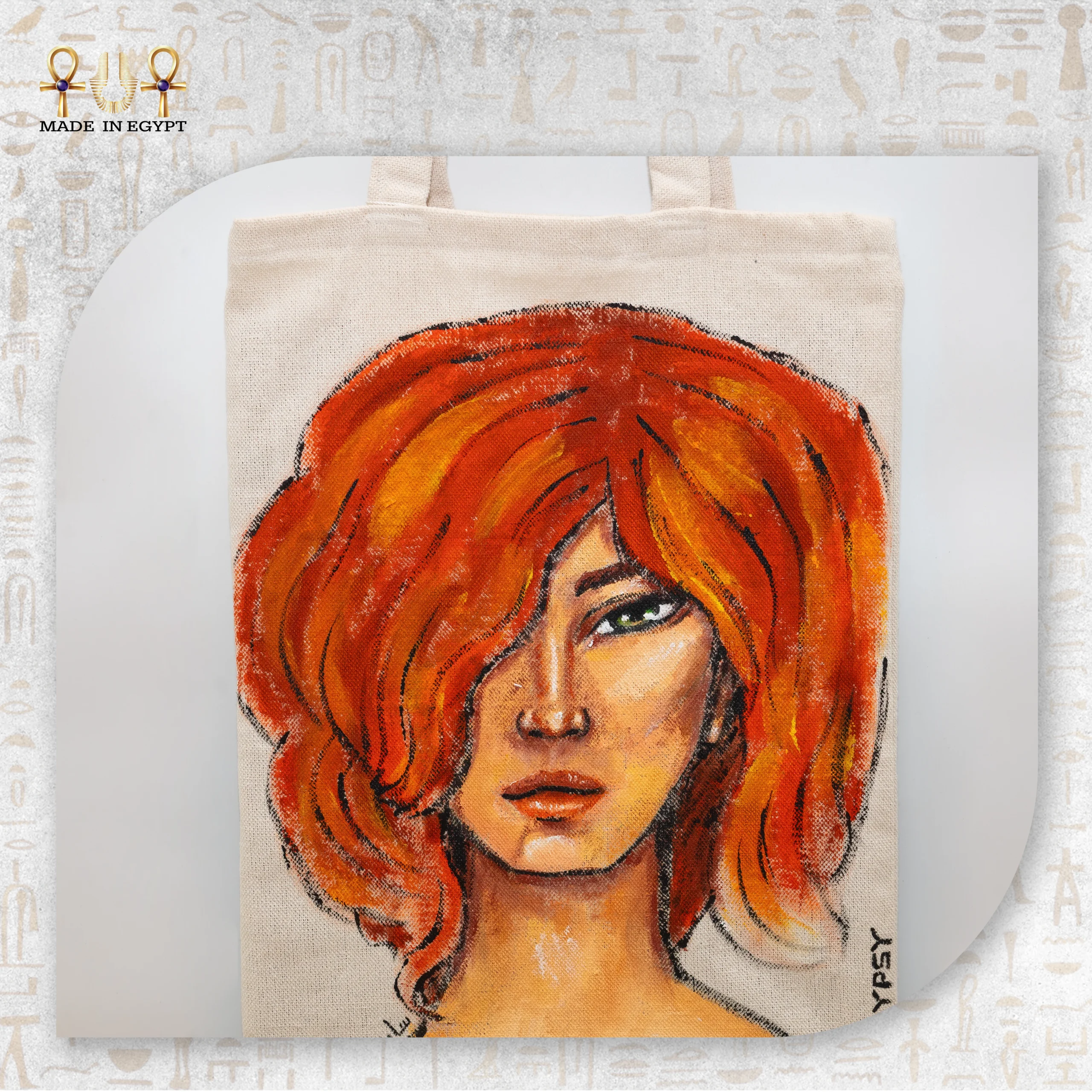 شنطة قماش مرسومة يدويًا بملامح امرأة جريئة وشعر أحمر نابض بالحياة، تعكس القوة والثقة وتناسب الاستخدام اليومي. يتم تنفيذها يدويًا وتستغرق 3 أيام حتى تكتمل