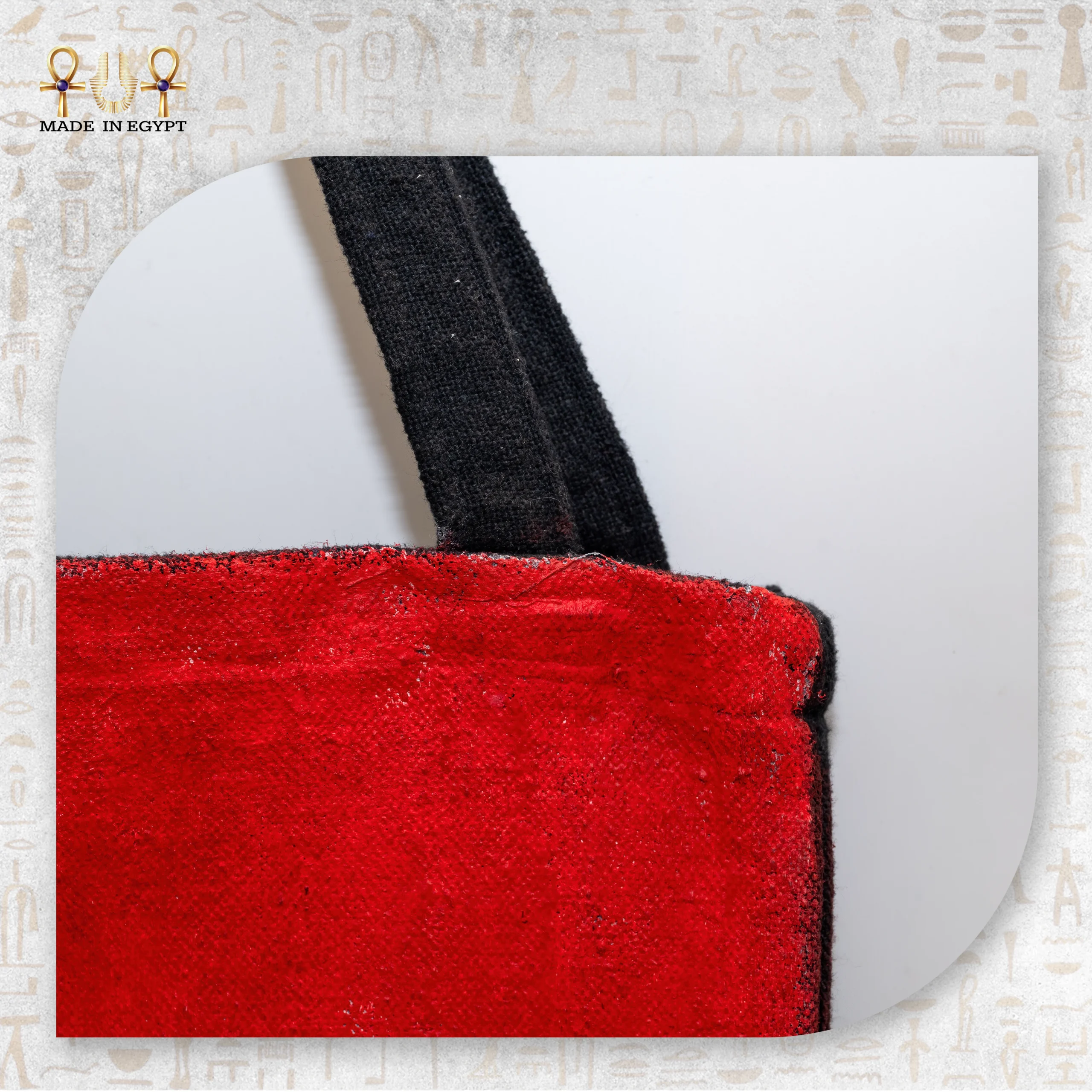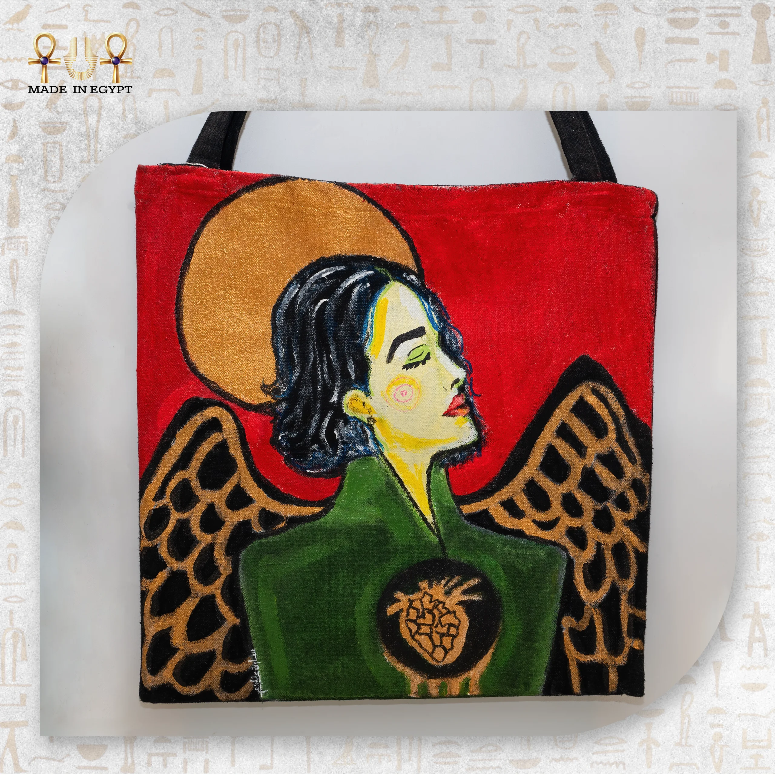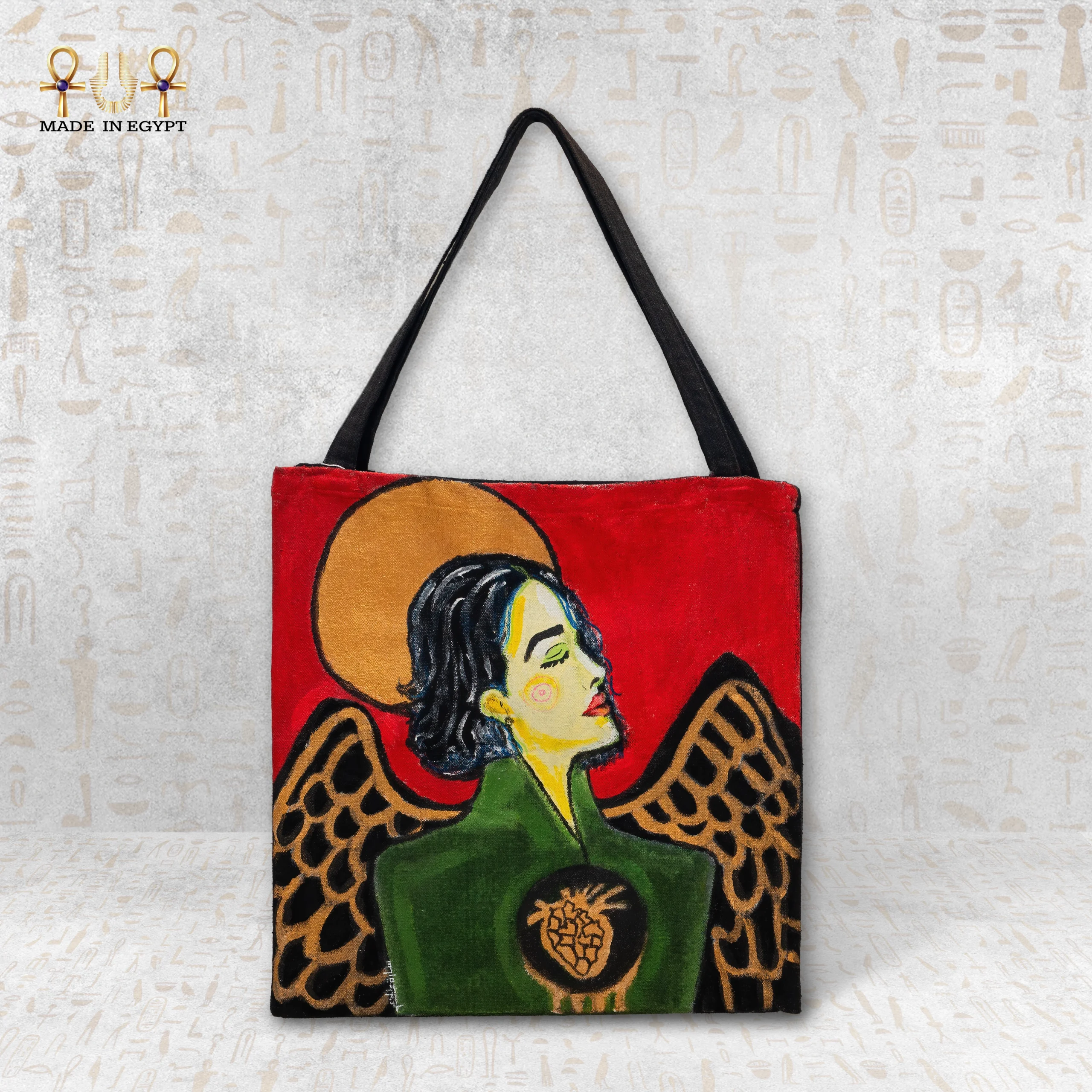 كل شنطة يتم تنفيذها ورسمها يدويًا بعناية فائقة، مما يجعل كل قطعة فريدة ولا يوجد اثنتان متطابقتان تمامًا. الألوان المستخدمة قوية ومتوازنة، تجمع بين الأحمر، الأخضر، الذهبي، والأسود، لتعكس عمق المشاعر وقوة الرمز دون مبالغة. تفاصيل القلب في منتصف التصميم تضيف بعدًا إنسانيًا يرمز للحب، الحماية، والصدق.