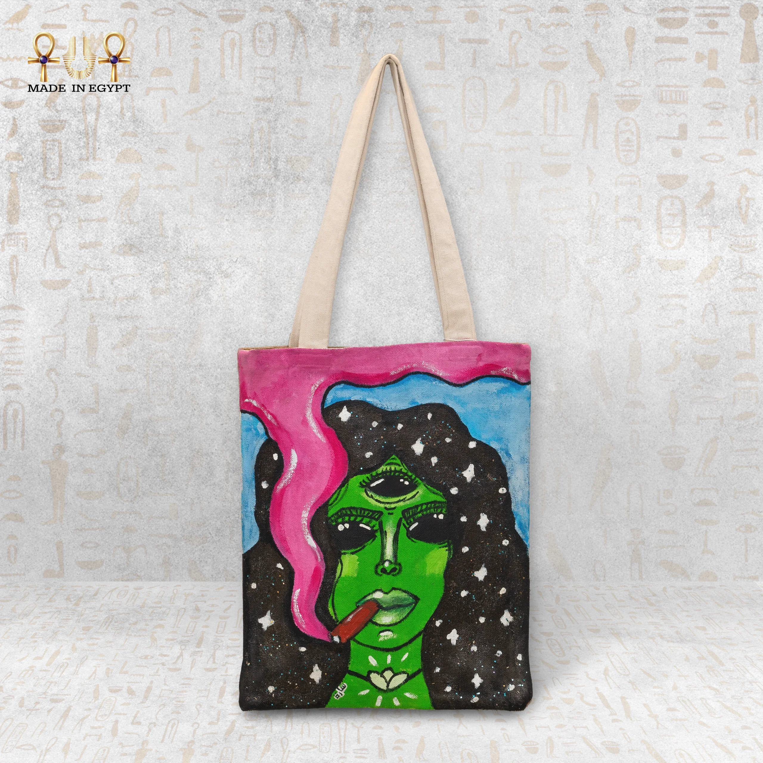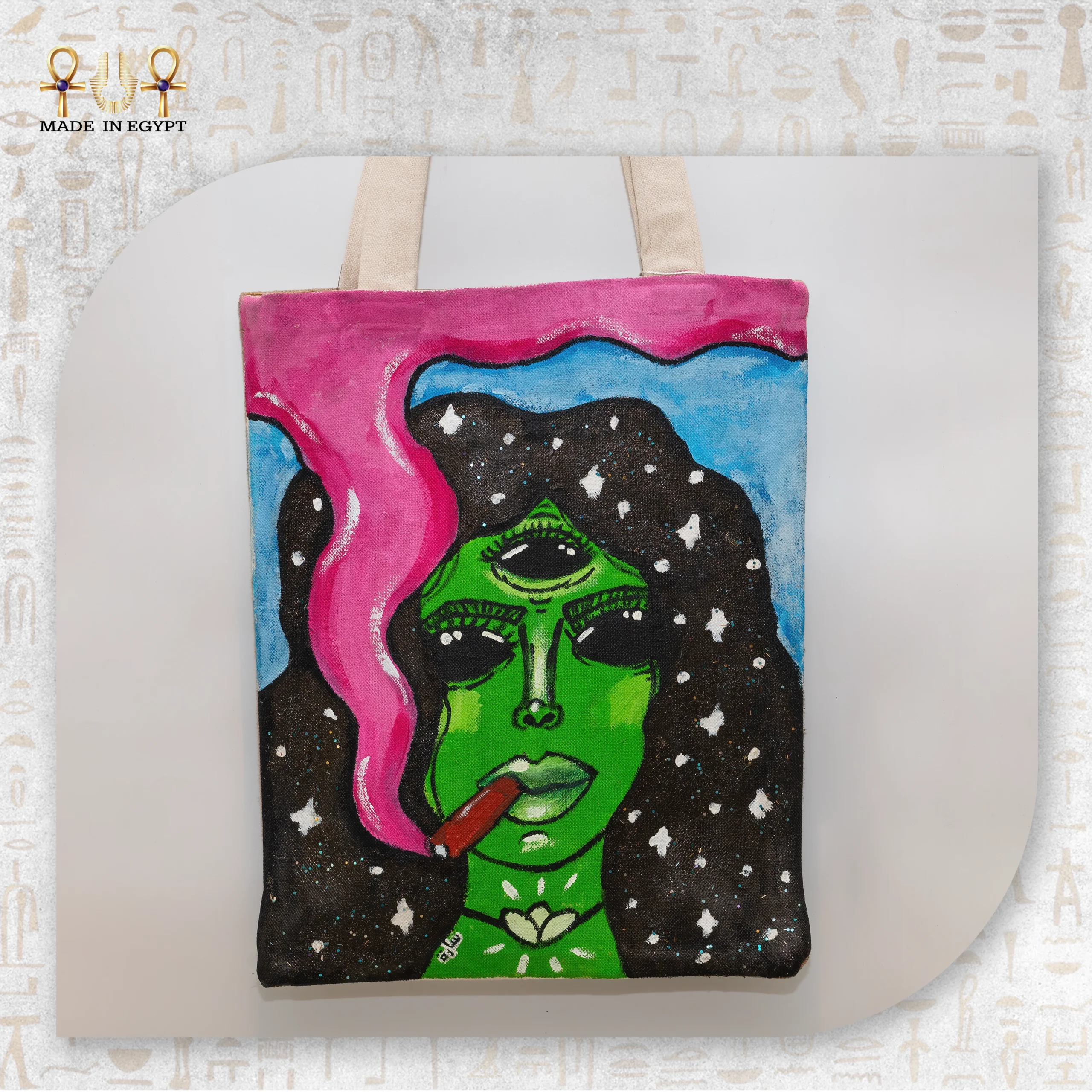 شنطة بتصميم مميز يعكس الفن العصري والرمزية الروحية، إضافة رائعة لإطلالتك اليومية. تستغرق 4 أيام لإتمام العمل عليها.