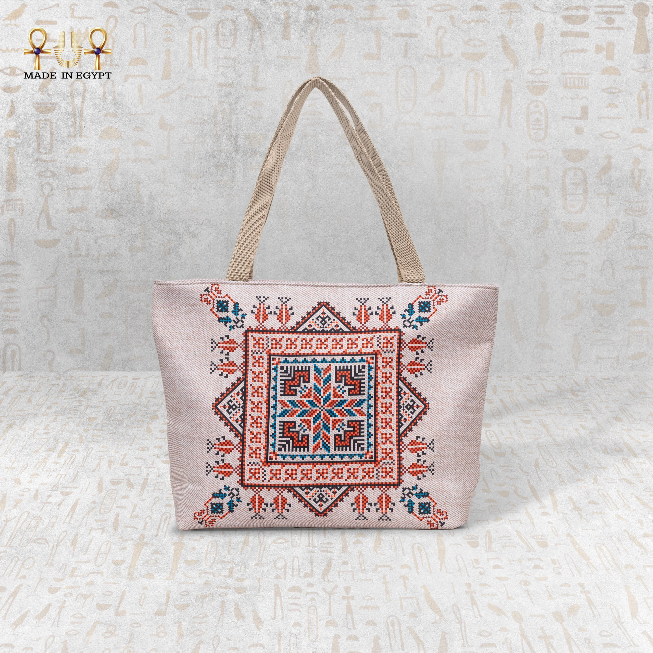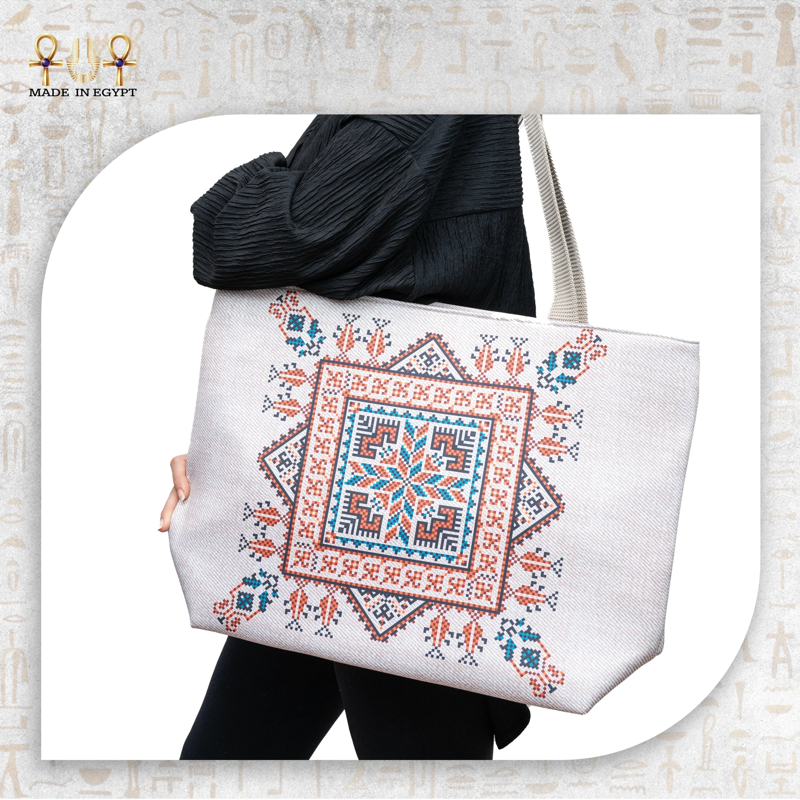 حقيبة التراث الفرعوني هي قطعة فنية مميزة تمزج بين الأناقة العصرية والهوية التاريخية العريقة. صُممت هذه الحقيبة برسومات مستوحاة من النقوش والرموز الهيروغليفية المصرية القديمة، لتمنحك إحساسًا بالفخامة والأصالة في آنٍ واحد. تتميز الحقيبة بتصميم واسع يجعلها مثالية للاستخدام اليومي سواء للتسوق، العمل أو حتى للرحلات القصيرة. خامة الحقيبة مصنوعة من قماش عالي الجودة يجمع بين المتانة والخفة، مما يجعلها عملية وسهلة الحمل طوال اليوم. الألوان الطبيعية المستخدمة في التصميم تعزز من طابعها الكلاسيكي، وتسمح بمطابقتها مع مختلف الإطلالات سواء الكاجوال أو الرسمية.