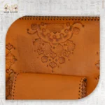 واجهة شنطة جلد تراثية مزخرفة بنقوش يدوية محفورة بأدوات تقليدية، لا بطباعة أو ليزر.