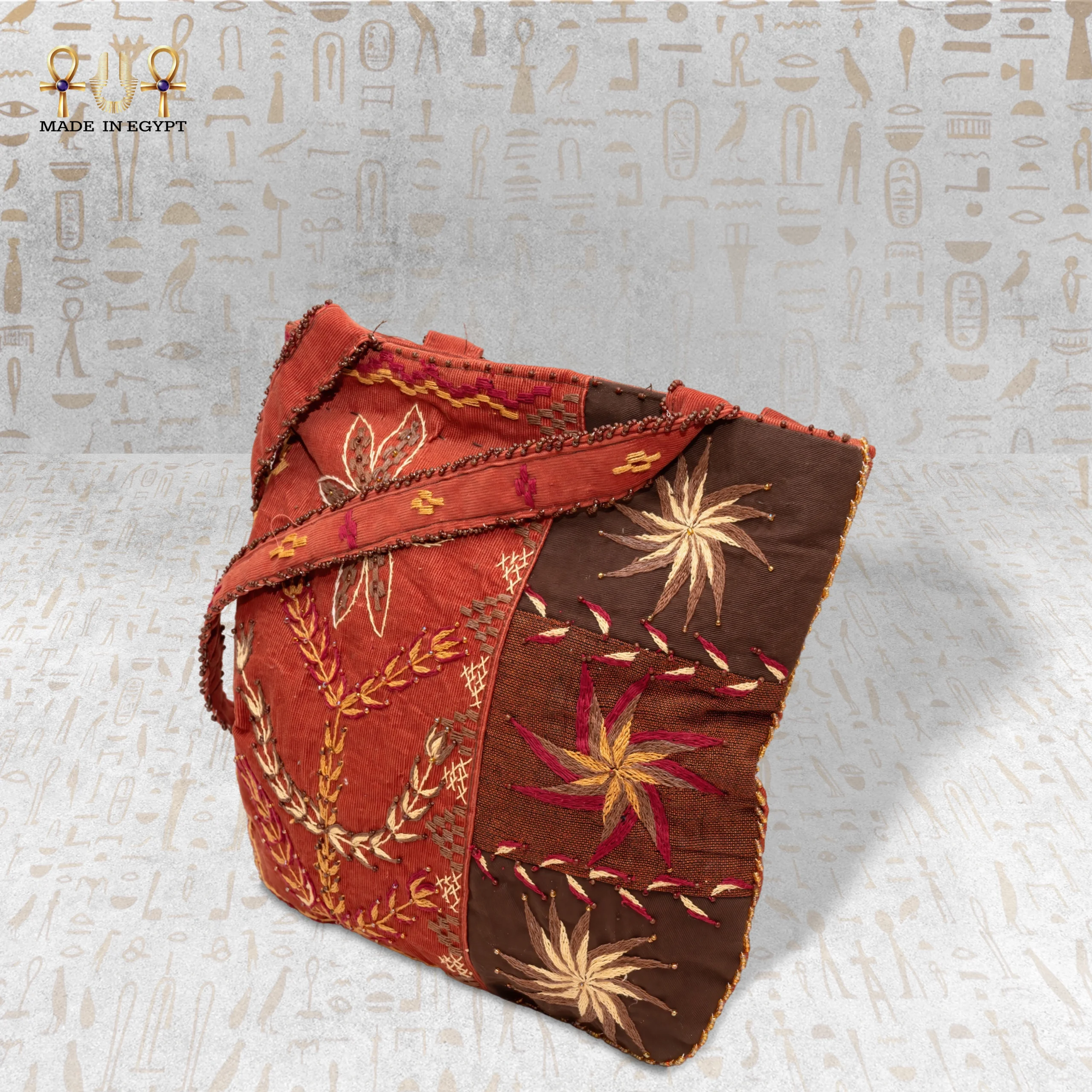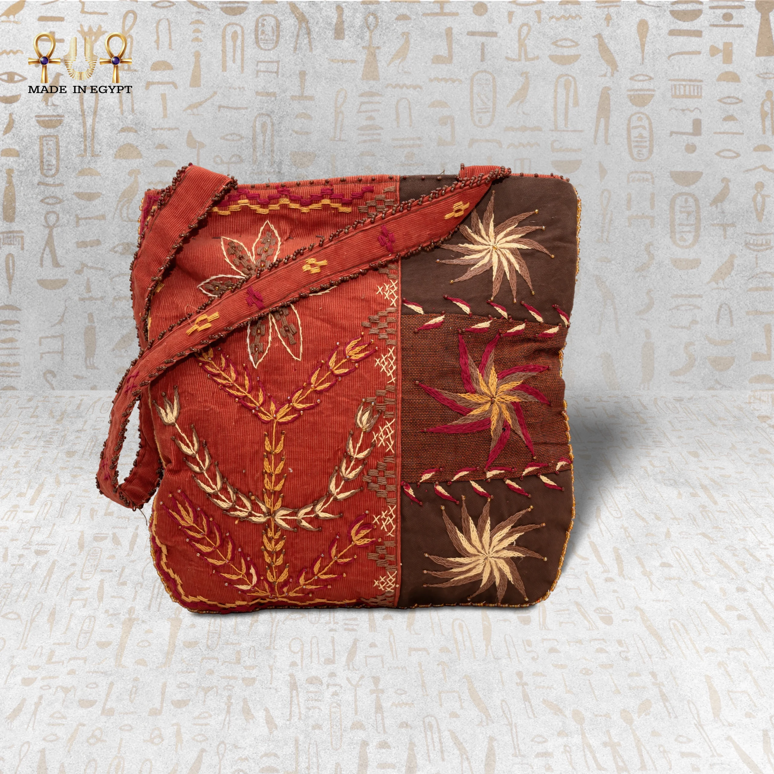 Front view of the City Pearl handwoven bag with floral and geometric embroidery in red and brown tones.