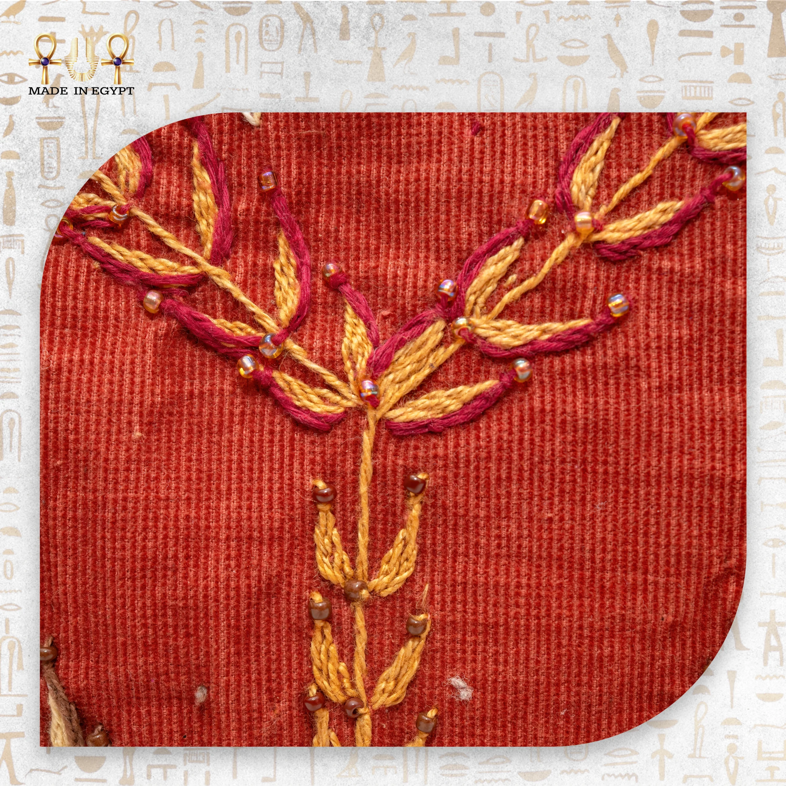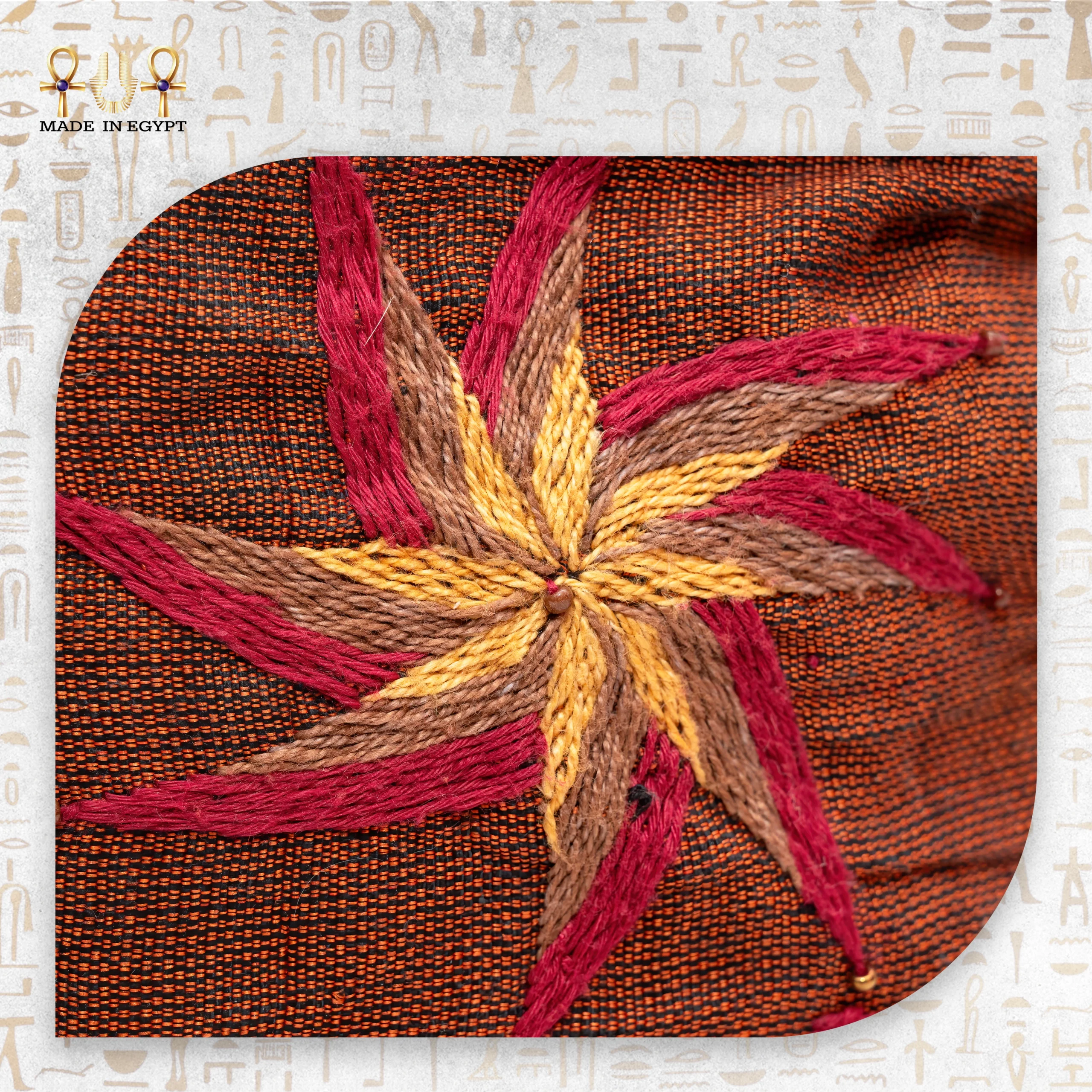 Close-up of the geometric star-shaped embroidery on the City Pearl bag, in rich red, brown, and yellow threads.