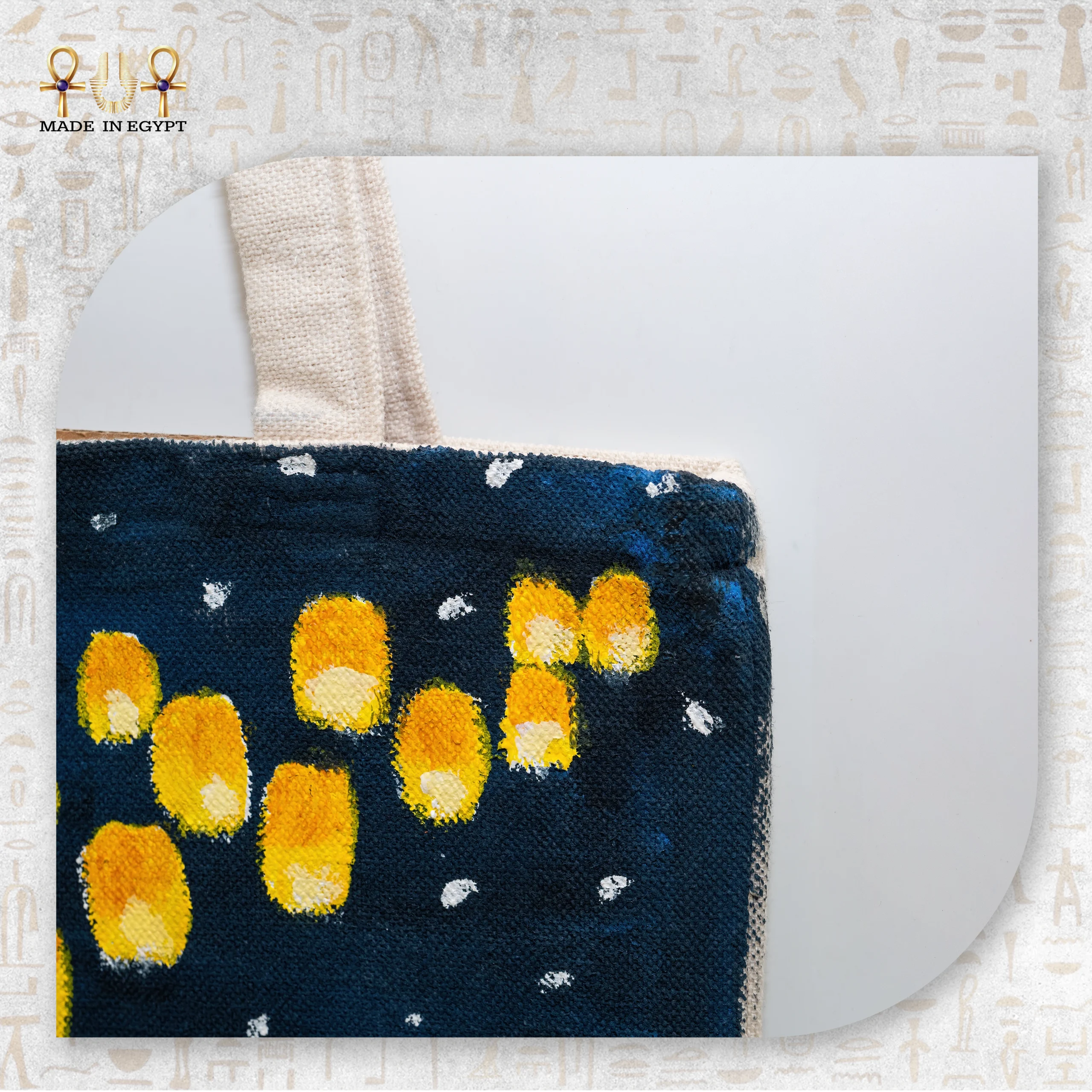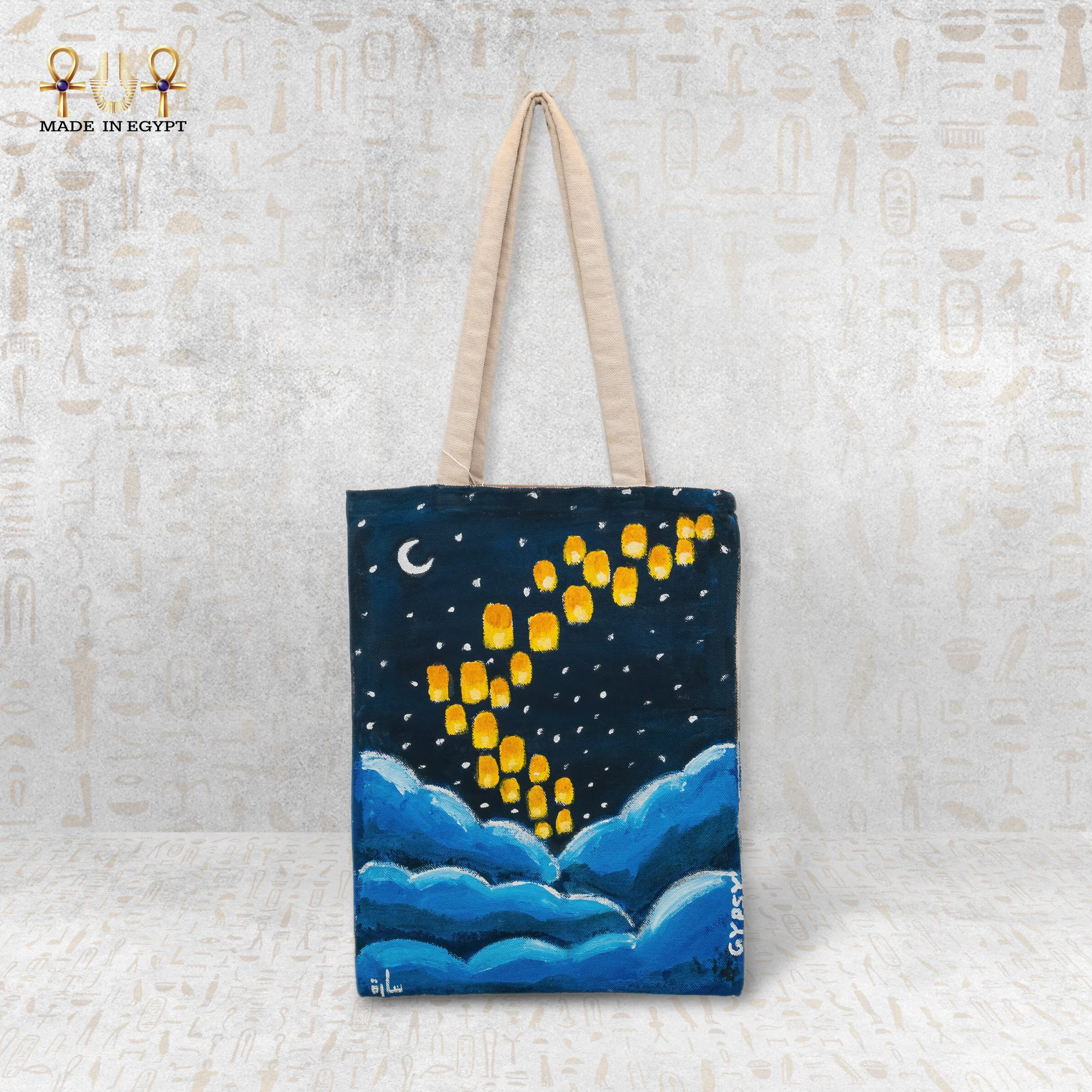 تم تنفيذ العمل بأسلوب فني يدوي غني بالتدرجات اللونية، حيث تمتزج درجات الأزرق الداكن مع الأصفر الدافئ للفوانيس، مما يمنح التصميم توازنًا بصريًا مريحًا للنظر. التفاصيل الدقيقة في الغيوم والنجوم تضيف عمقًا وجاذبية تجعل الشنطة لافتة ومميزة في أي استخدام يومي.