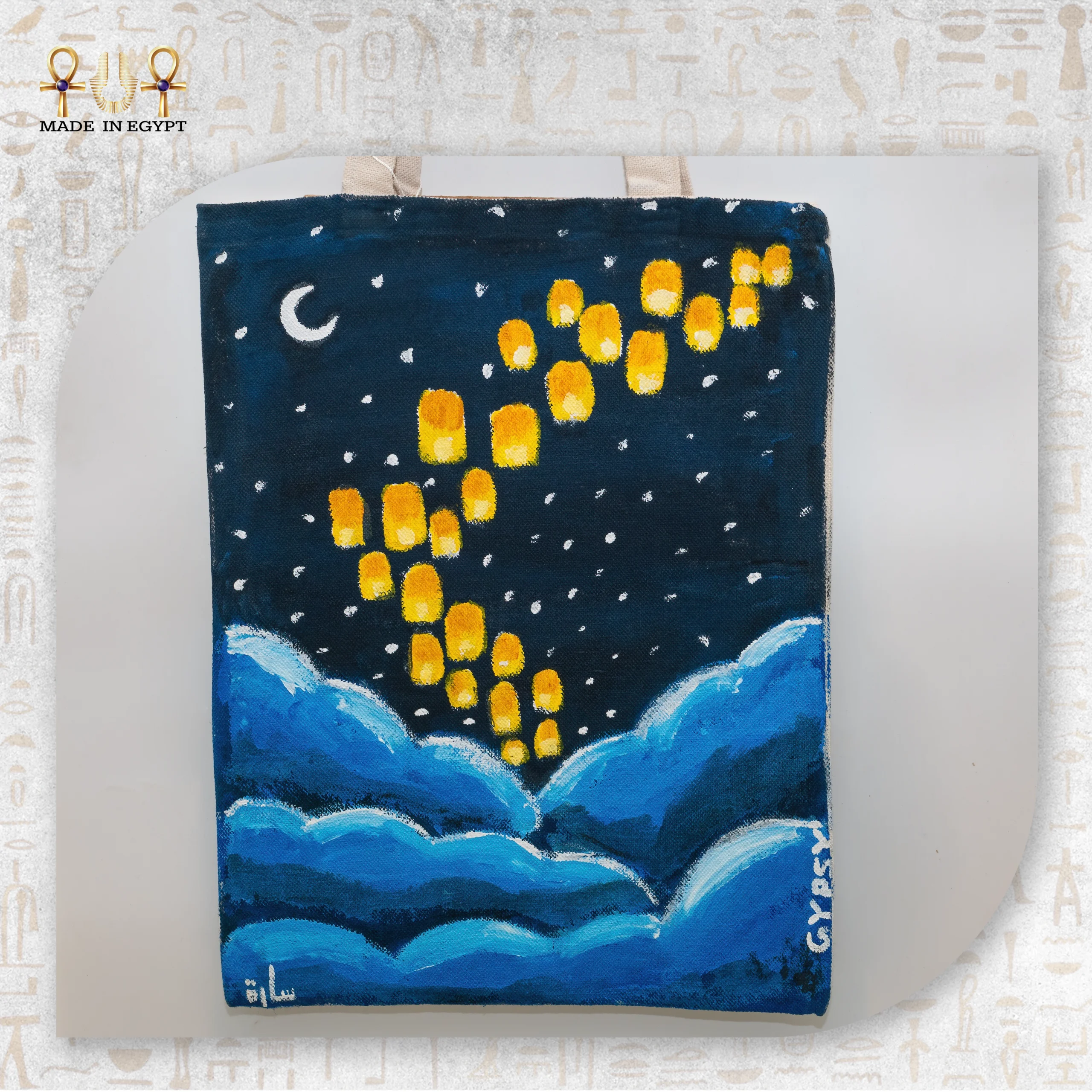 شنطة فنية مستوحاة من هدوء الليل وفوانيس مضيئة تملأ السماء بالأمل والدفء.