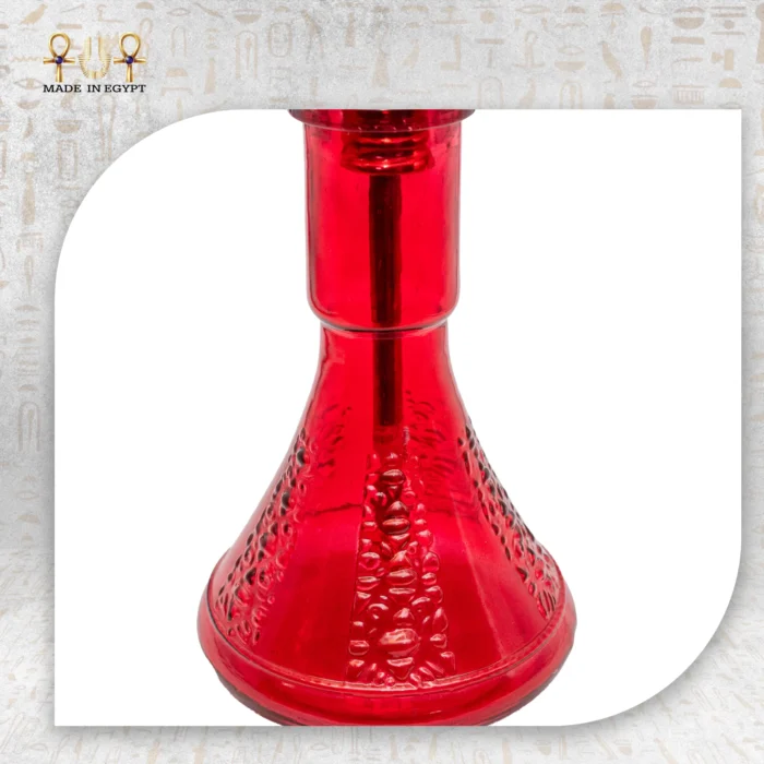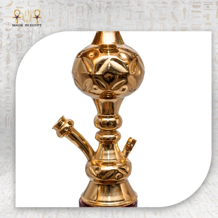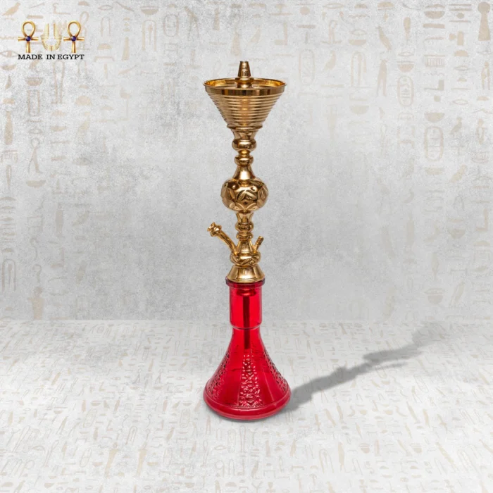 تأتي شيشة الهرم الكلاسيكية بتصميم فريد يجمع بين القاعدة الزجاجية الحمراء اللامعة والجسم النحاسي الذهبي، مما يخلق تباينًا بصريًا رائعًا يخطف الأنظار. كما أن الشكل الهرمي مستوحى من العمارة الفرعونية، ليمنحها طابعًا تراثيًا أصيلًا يعبر عن الحرفية المصرية المتوارثة عبر الأجيال.