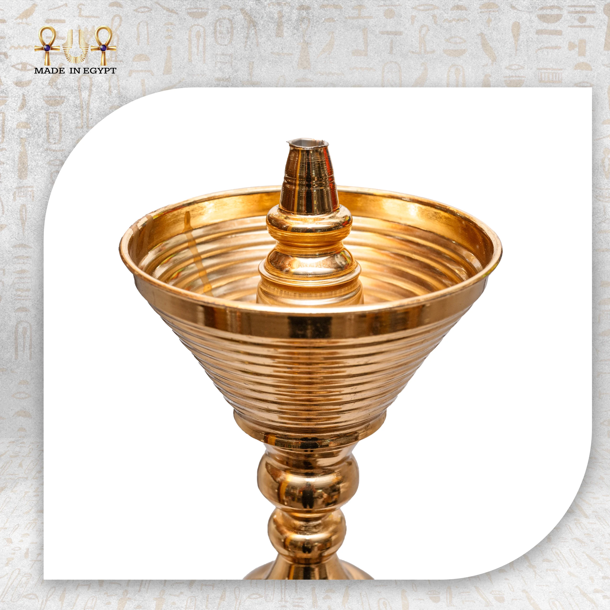 النقوش والزخارف اليدوية التي تزين الجسم النحاسي تضيف لمسة من الرقي والترف، بينما يعكس اللون الذهبي بريقًا ملكيًا يجعلها قطعة ديكور شرقية مميزة. كما أن خامة النحاس المستخدمة مقاومة للحرارة وتدوم طويلاً دون أن تفقد بريقها.