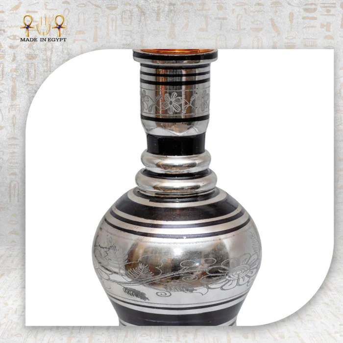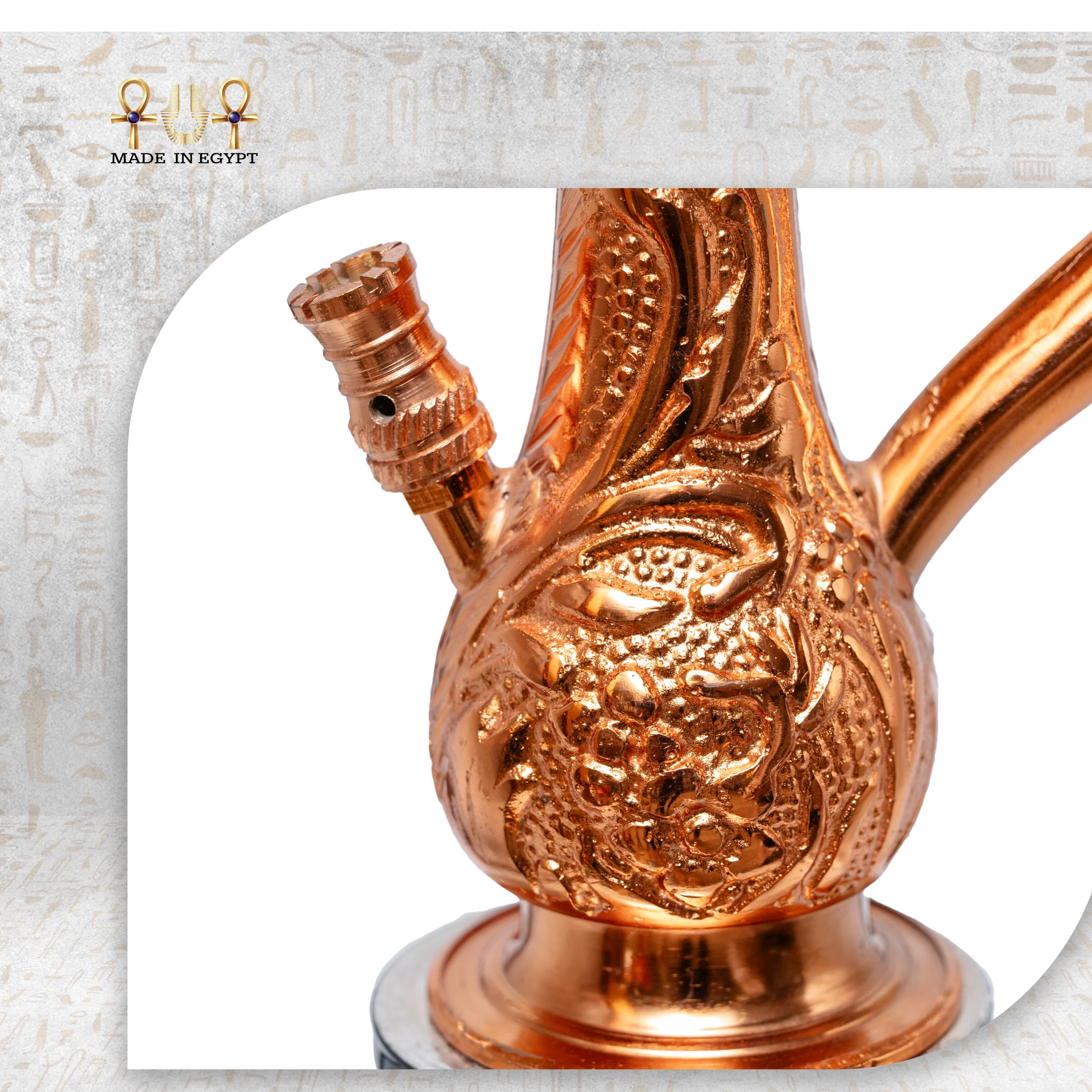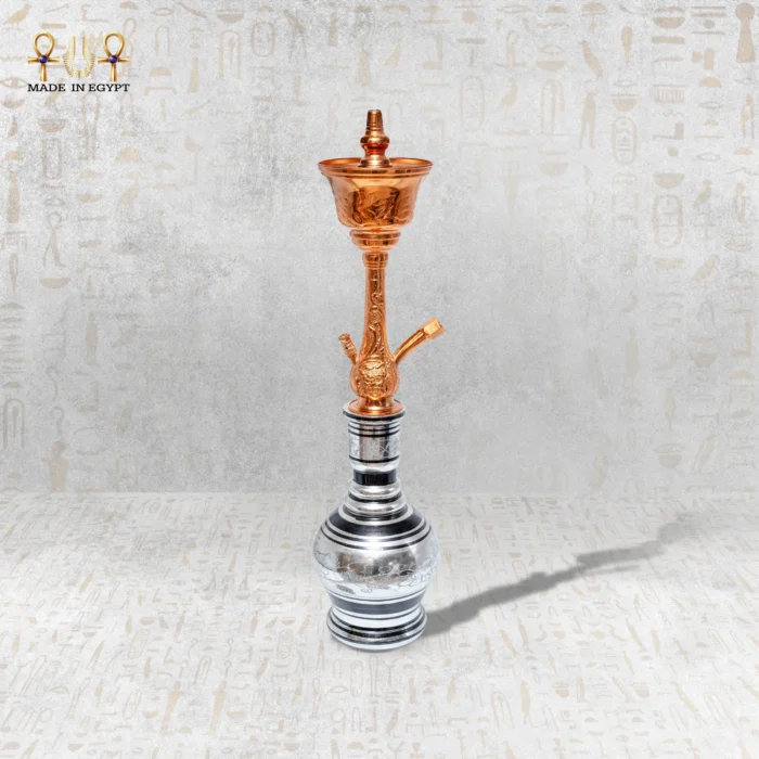 الهيكل النحاسي اللامع هو قلب الشيشة، وقد زُخرف بنقوش محفورة يدويًا بدقة عالية، ما يجعل كل قطعة فريدة من نوعها. هذه التفاصيل الدقيقة تجسد التراث المصري الأصيل وتُبرز مهارة الصناع المصريين الذين نقلوا فنهم عبر الأجيال.