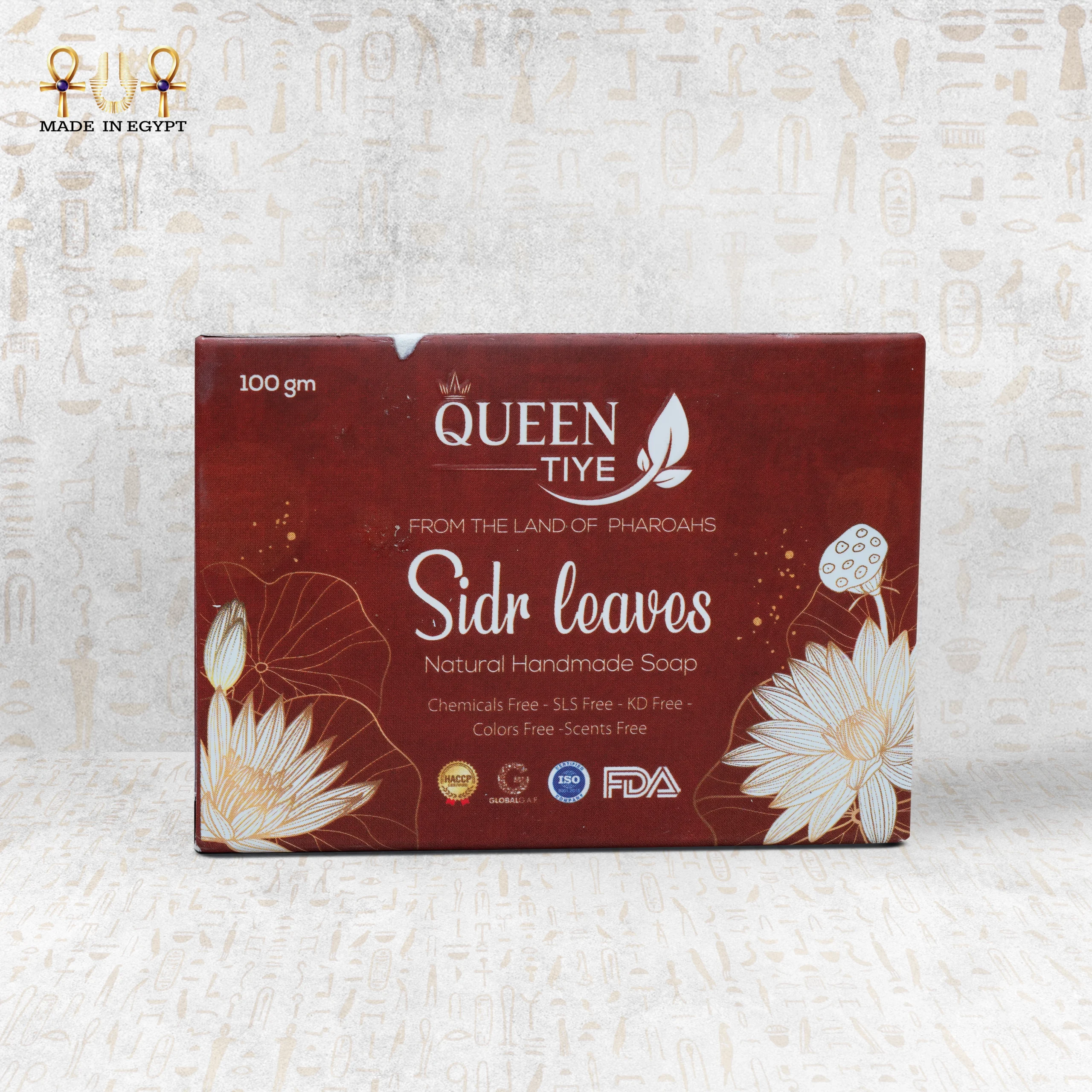 Front view of Sidr Leaves natural handmade soap red Queen box packaging.