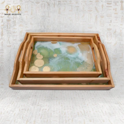 كل قطعة من هذه الصينية تُصنع بشكل فردي، مما يجعل كل واحدة منها فريدة من نوعها. تَوزيع الألوان ولمعان الرّيزن يخلق بصمة فنية خاصة في كل تصميم. أما الإطار الخشبي، فيضيف إحساسًا بالدفء والفخامة، ويوازن بين متانة الخامة ونعومة التفاصيل.