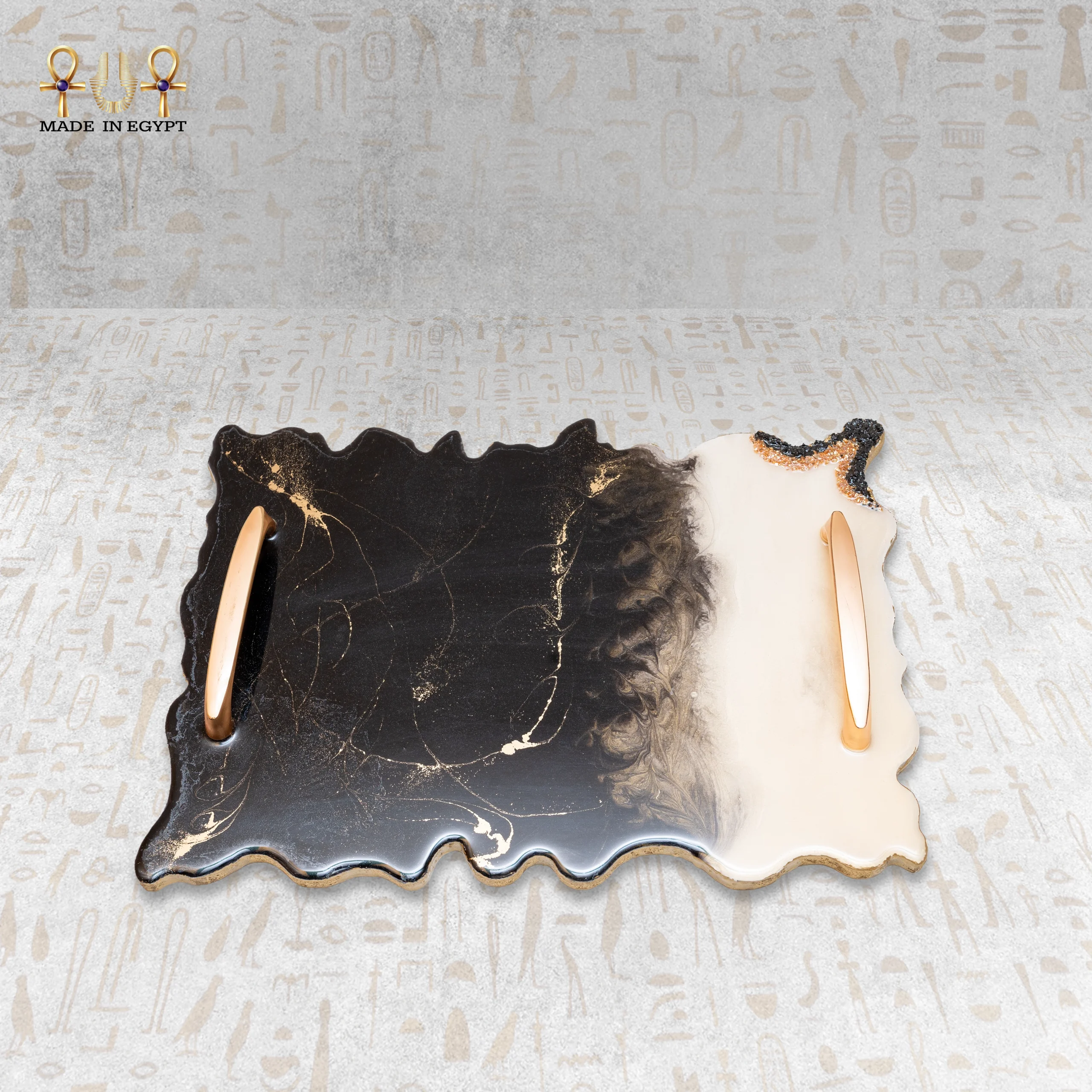 صينية تباين ذهبي قطعة أنيقة تجمع بين اللونين الأسود والأبيض مع لمسات ذهبية فاخرة، مصممة يدويًا لتضيف لمسة راقية لأي مساحة. مثالية للتقديم أو للاستخدام كقطعة ديكور مميزة تعكس الذوق العصري والفخامة الهادئة.