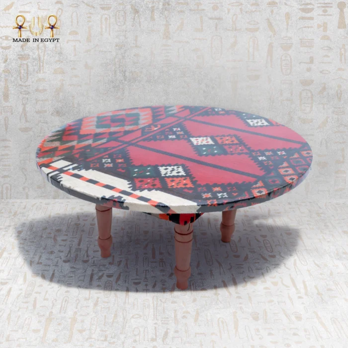 صُنعت هذه الطاولة باستخدام قماش الكليم اليدوي. يعتمد التصميم على ألوان نابضة بالحياة مثل الأحمر، الأخضر، البرتقالي، والأسود. بالإضافة إلى ذلك، أضيفت لمسات من البيج لخلق توازن بصري هادئ. كل لون يحمل رمزية خاصة: الأحمر يعبّر عن الطاقة، الأخضر يشير إلى الخصوبة، والبرتقالي يعكس وهج الشمس المصرية.