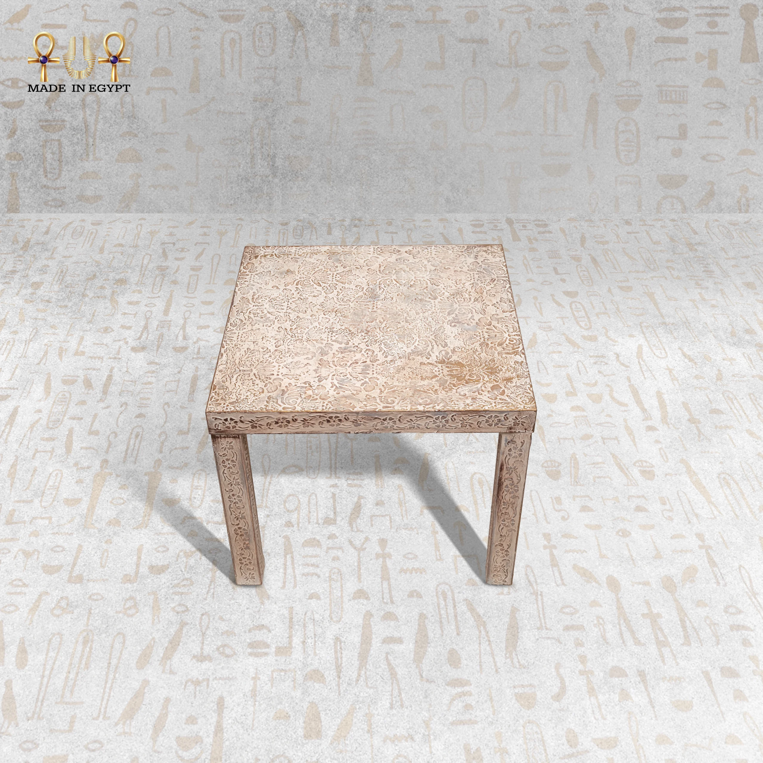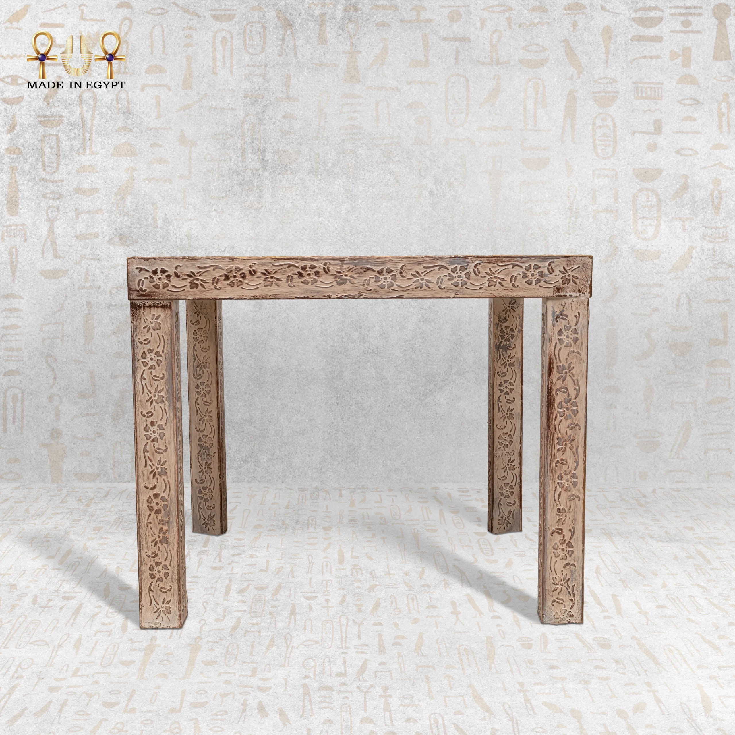 يتميّز تصميم الطاولة بخطوط بسيطة ومتوازنة. يأتي السطح مستويًا ومتينًا ليكون مناسبًا للاستخدام اليومي. كما تدعم الأرجل القوية الطاولة وتمنحها ثباتًا جيدًا. النقوش المحفورة على الجوانب والأرجل لا تضيف جمالًا فقط، بل تعكس مهارة الصانع ودقته في التفاصيل.