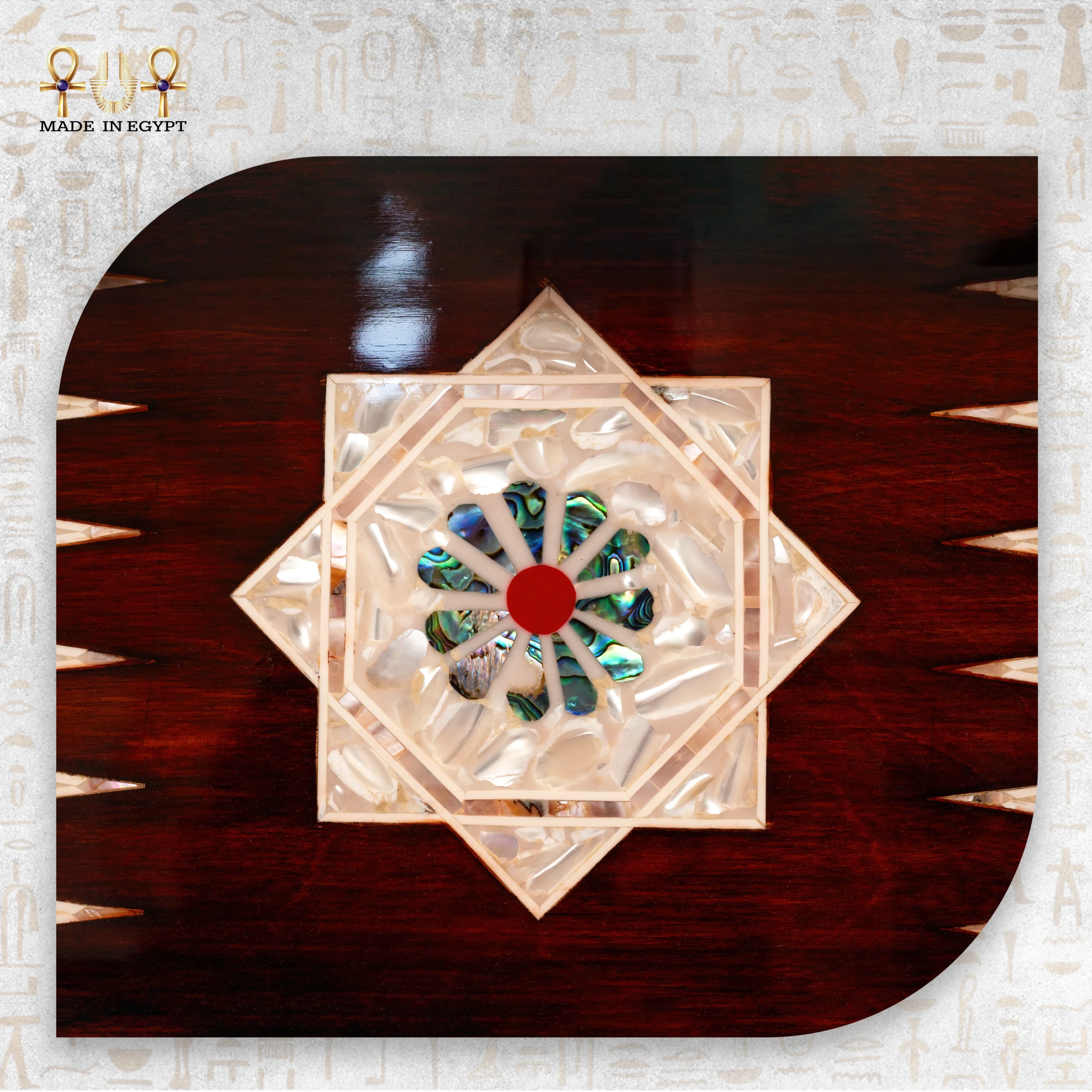 يجعل التصميم الداخلي للطاولة قطعة مثالية لمحبي لعبة النرد، بينما يقدّم سطحها الخارجي لوحة شطرنج فريدة مزينة بمربعات من الصدف المُشكّل بعناية. هذه الطاولة ليست مجرد لعبة، بل قطعة ديكور راقية تضيف جمالًا لأي منزل أو مكتب، وتُعد هدية فخمة لكل محبّ للفن اليدوي والتراث الشرقي. صنعت لتدوم سنوات طويلة وتحافظ على قيمتها الجمالية والفنية، فهي قطعة تُزيّن المكان قبل أن تكون وسيلة للعب.
