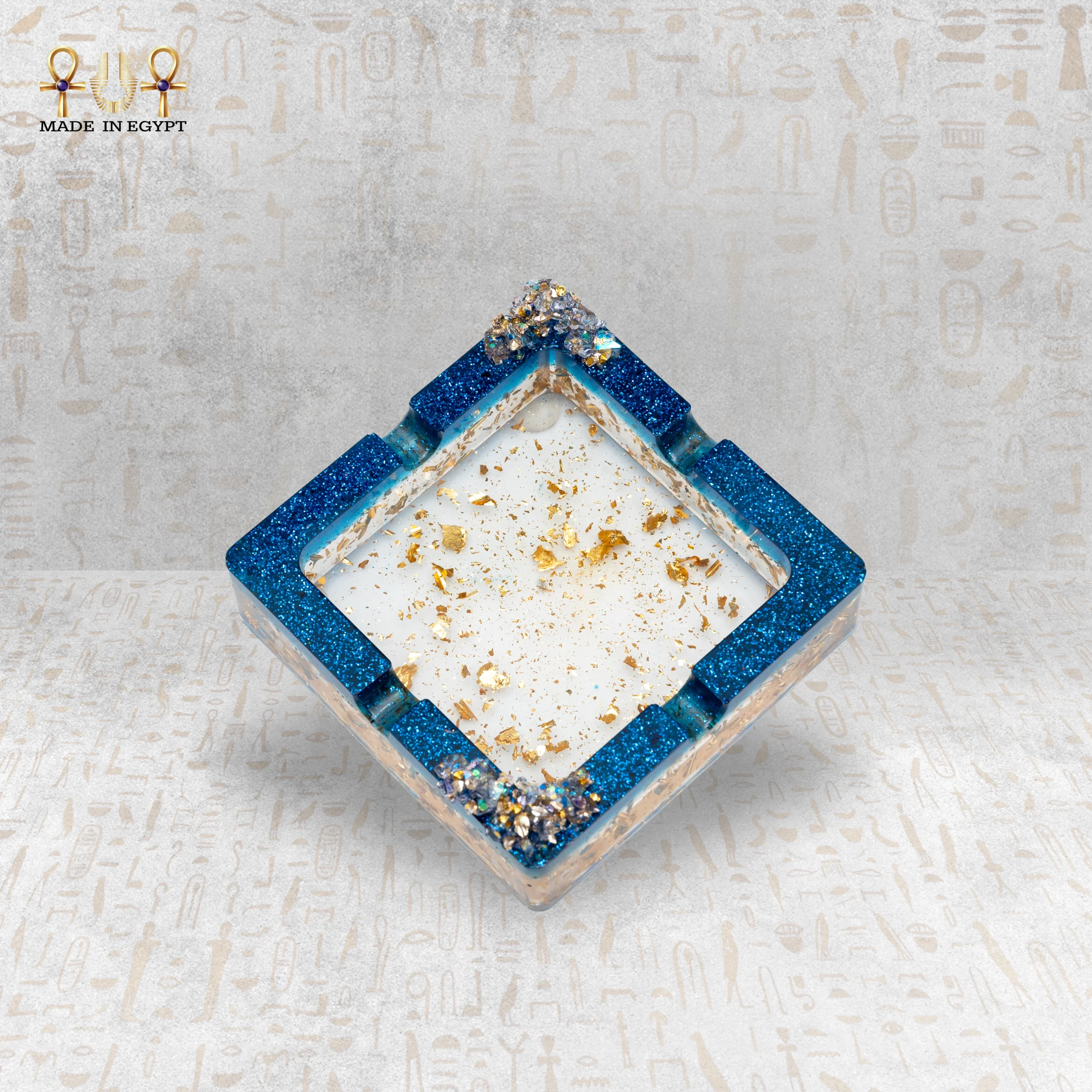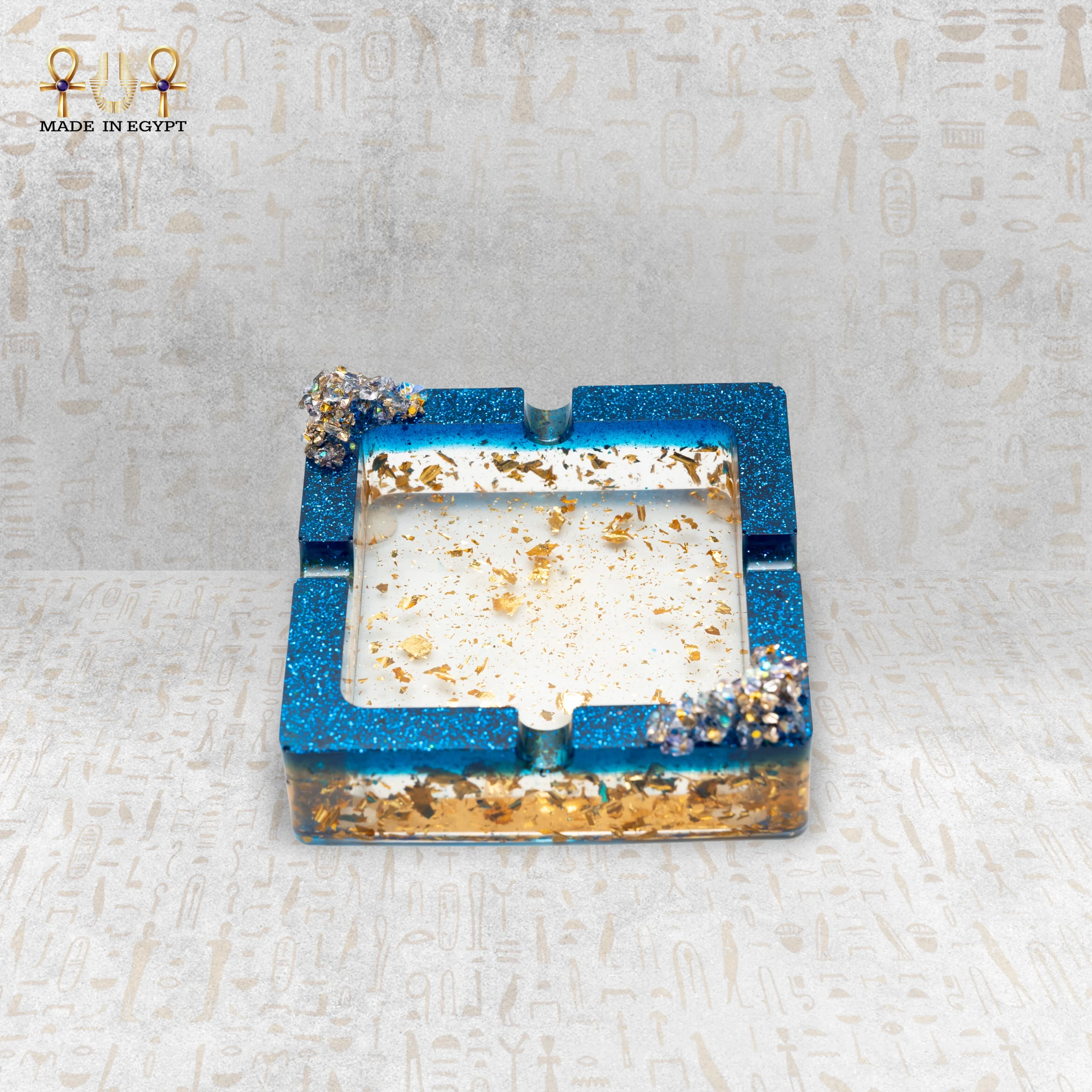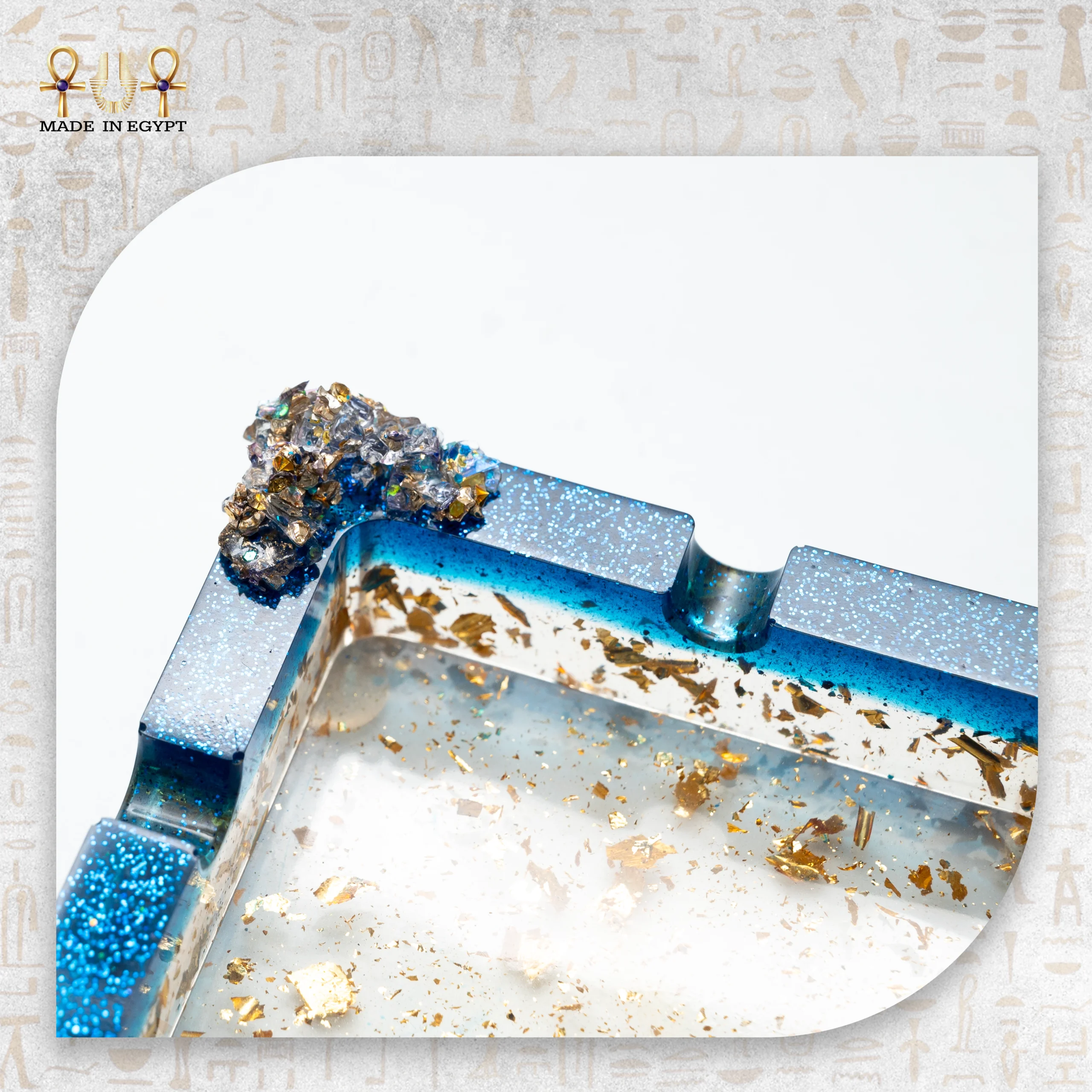 الإطار الخارجي يأتي باللون الأزرق الجليتري اللامع، مما يبرز التصميم الداخلي ويمنح القطعة حضورًا قويًا وجذابًا. كما تم تزيين الزوايا بتفاصيل كريستالية لامعة تضيف عمقًا بصريًا وإحساسًا بالرقي، لتصبح القطعة أقرب إلى عمل فني منها إلى أداة استخدام يومي.