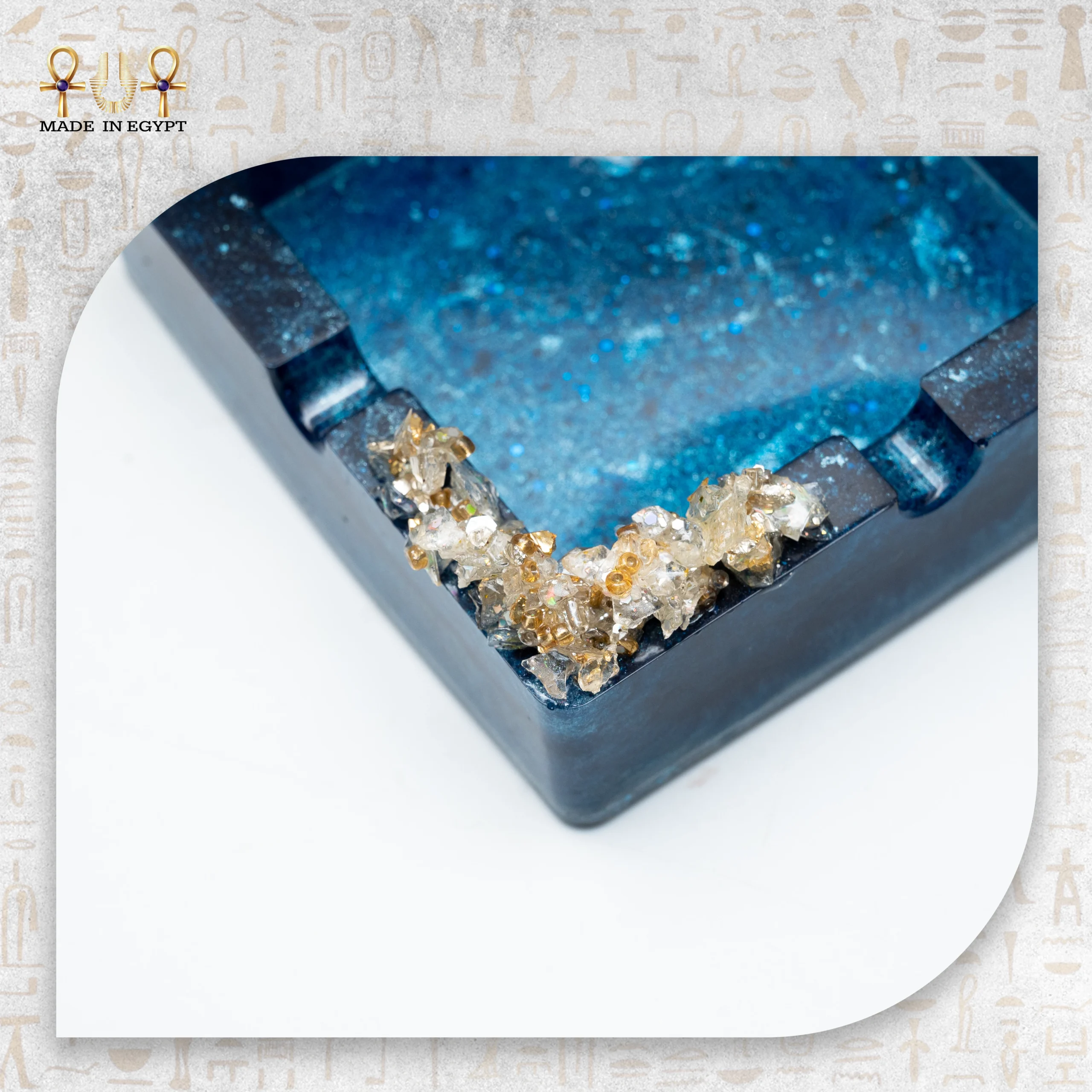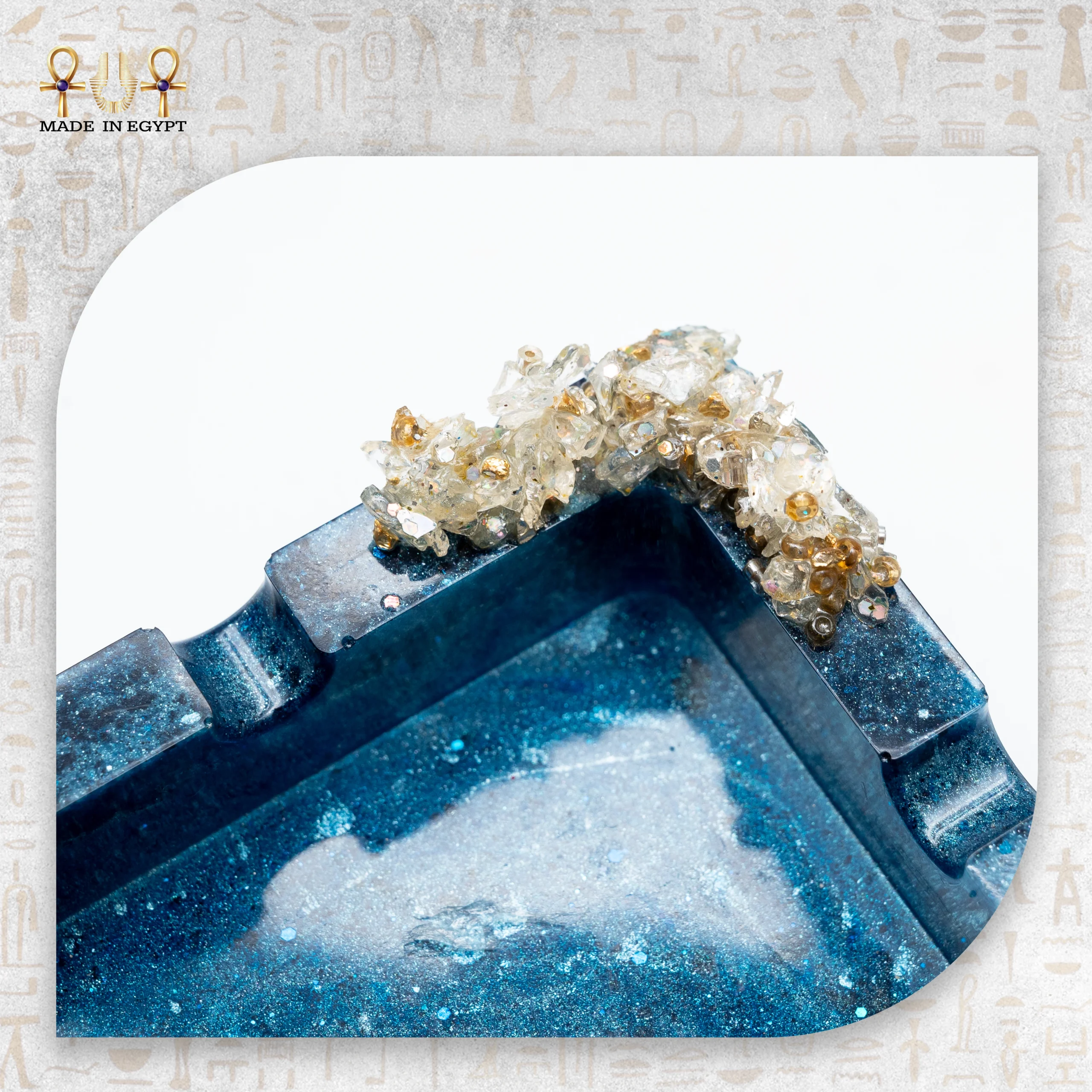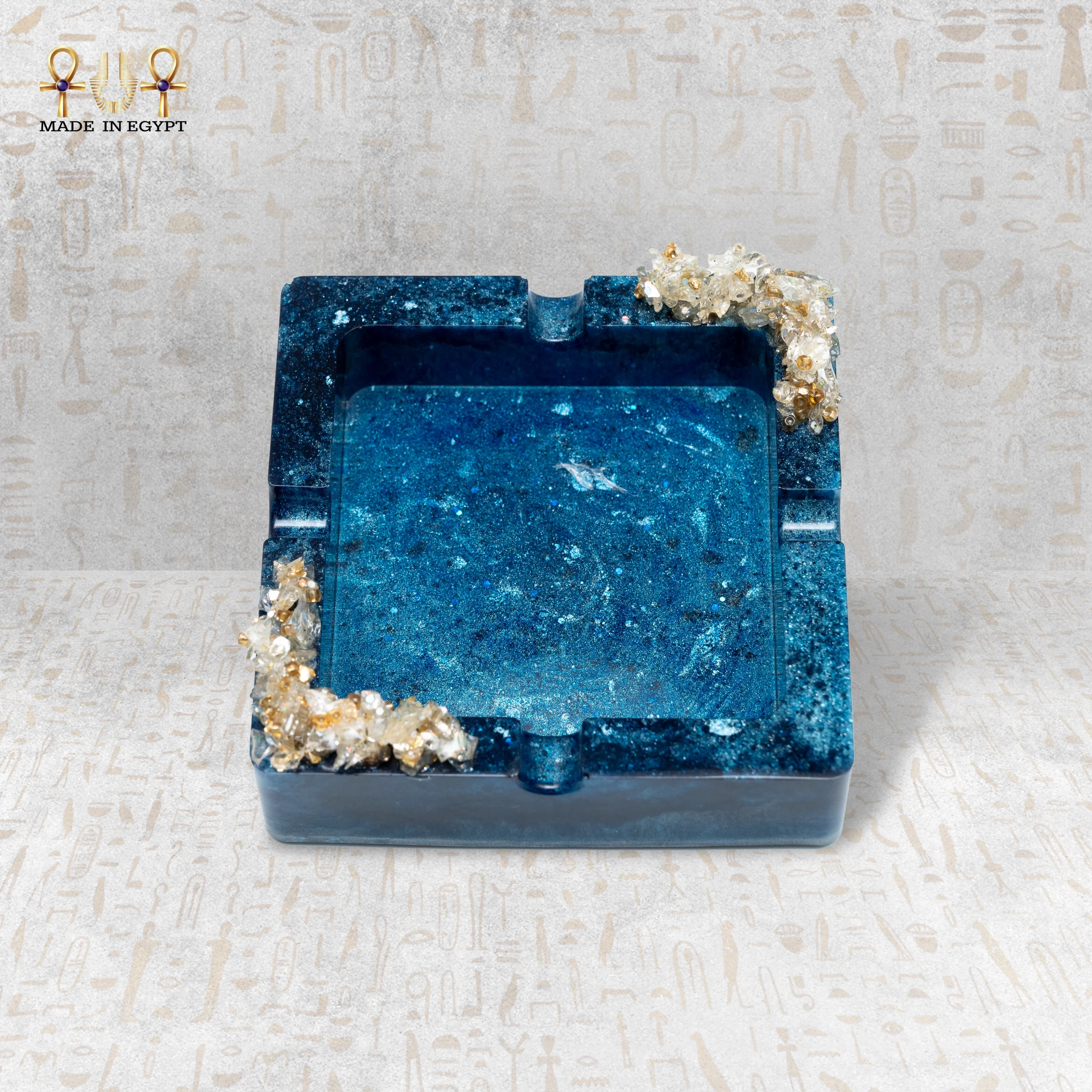 تتميز الطفاية بتصميم مربع أنيق مع حواف مرتفعة قليلاً، مما يساعد على الحفاظ على الرماد داخلها بشكل منظم. كما تحتوي على فتحات مخصصة لتثبيت السجائر، مما يجعلها عملية وسهلة الاستخدام. تضيف الزخارف الكريستالية في أحد الأركان لمسة فاخرة مستوحاة من الأحجار الطبيعية، حيث تتدرج ألوانها بين الشفاف والذهبي لتكمل جمال التصميم.