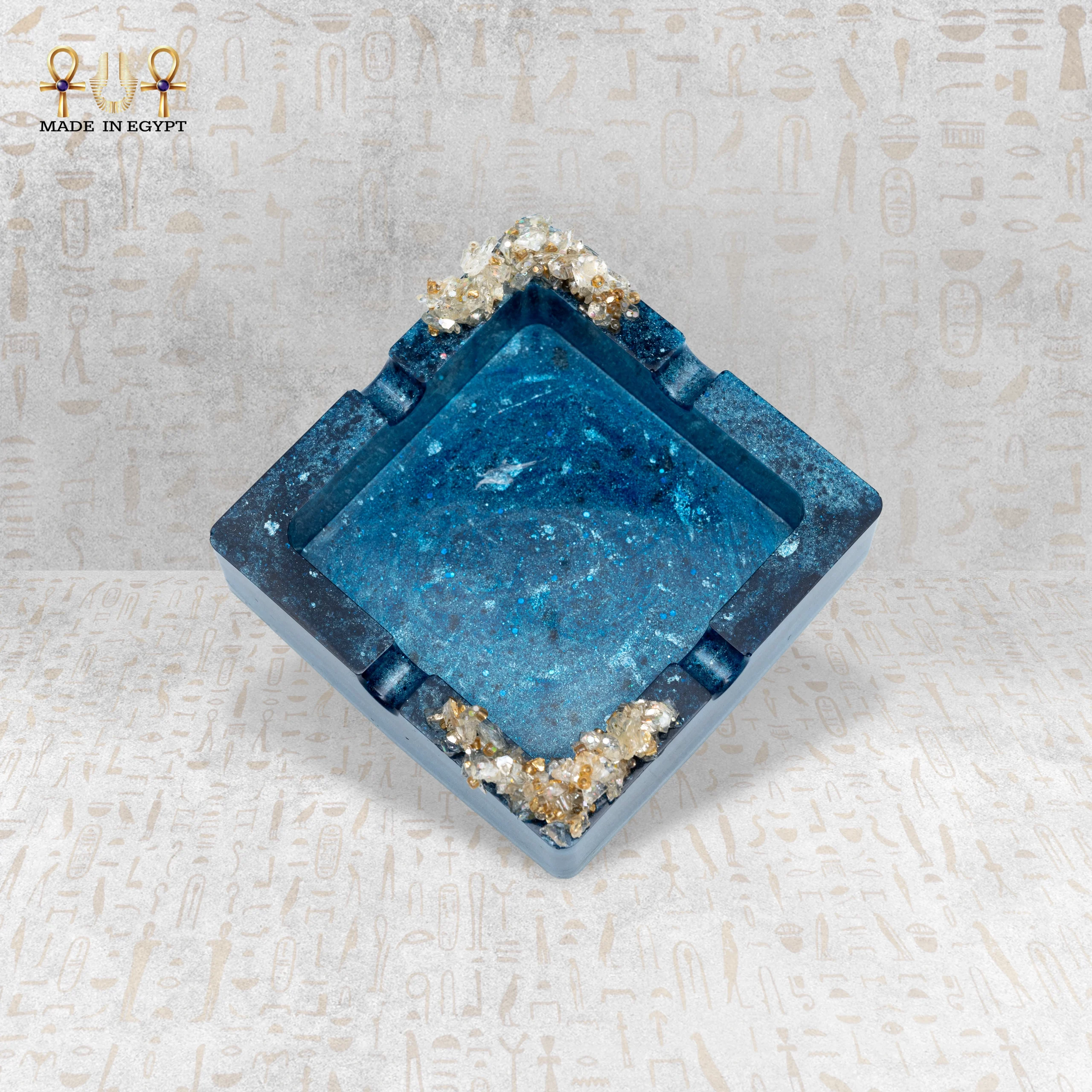 تم تصنيع الطفاية من خامة الريزن عالية الجودة، والتي توفر سطحًا أملسًا ولامعًا يعكس الضوء بطريقة جذابة، مع متانة عالية تجعلها مناسبة للاستخدام اليومي. يتداخل اللون الأزرق مع لمسات لامعة دقيقة تعطي تأثيرًا يشبه انعكاس الضوء على سطح الماء، مما يضيف عمقًا بصريًا رائعًا.