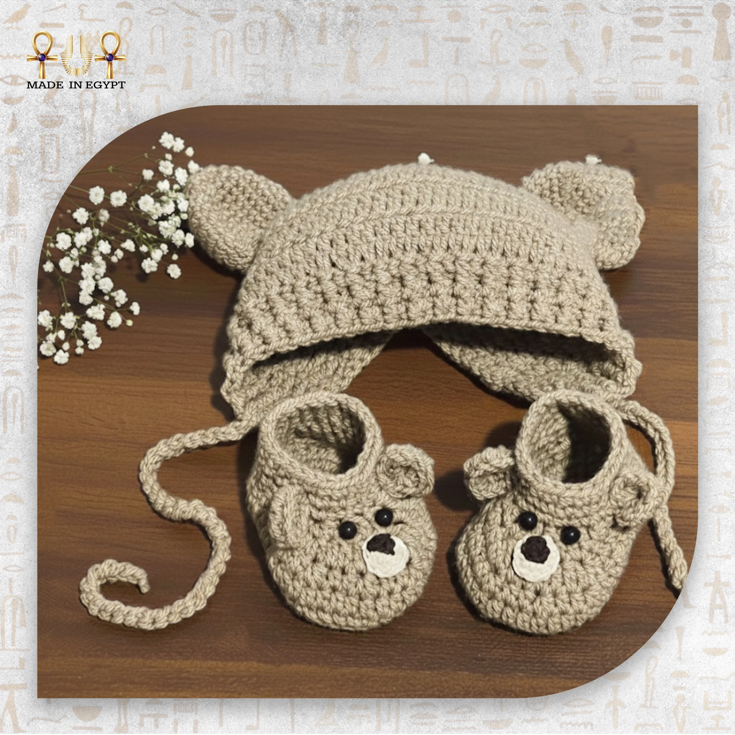 يتميز التصميم بشكل دب صغير لطيف يضفي لمسة مرحة على الإطلالة. تأتي الطاقية بأذنين بارزتين وملامح مطرزة بابتسامة ناعمة. بينما يكمل الكلوك التصميم بنفس التفاصيل ليمنح طفلك مظهرًا متناسقًا وأنيقًا.