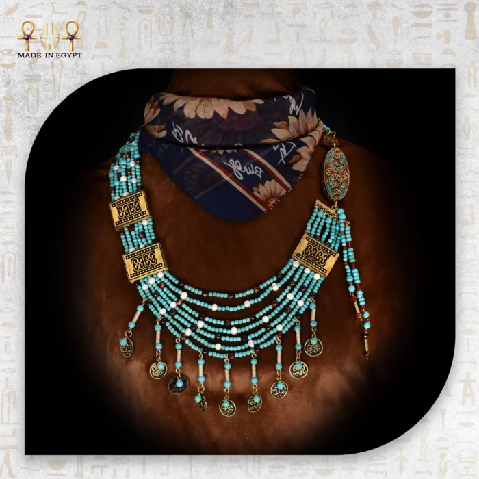 كردان تناغم الفيروز هو قطعة فنية راقية تجمع بين جمال الأحجار الطبيعية وروح الزخارف الشرقية التي تعبر عن الأصالة والهوية العربية. يعكس هذا التصميم إتقان الصياغة اليدوية التي تمتزج فيها الأحجار الكريمة مع النحاس المنقوش بطريقة فنية دقيقة، ليظهر في النهاية كقطعة ذات حضور قوي وأناقة فريدة.