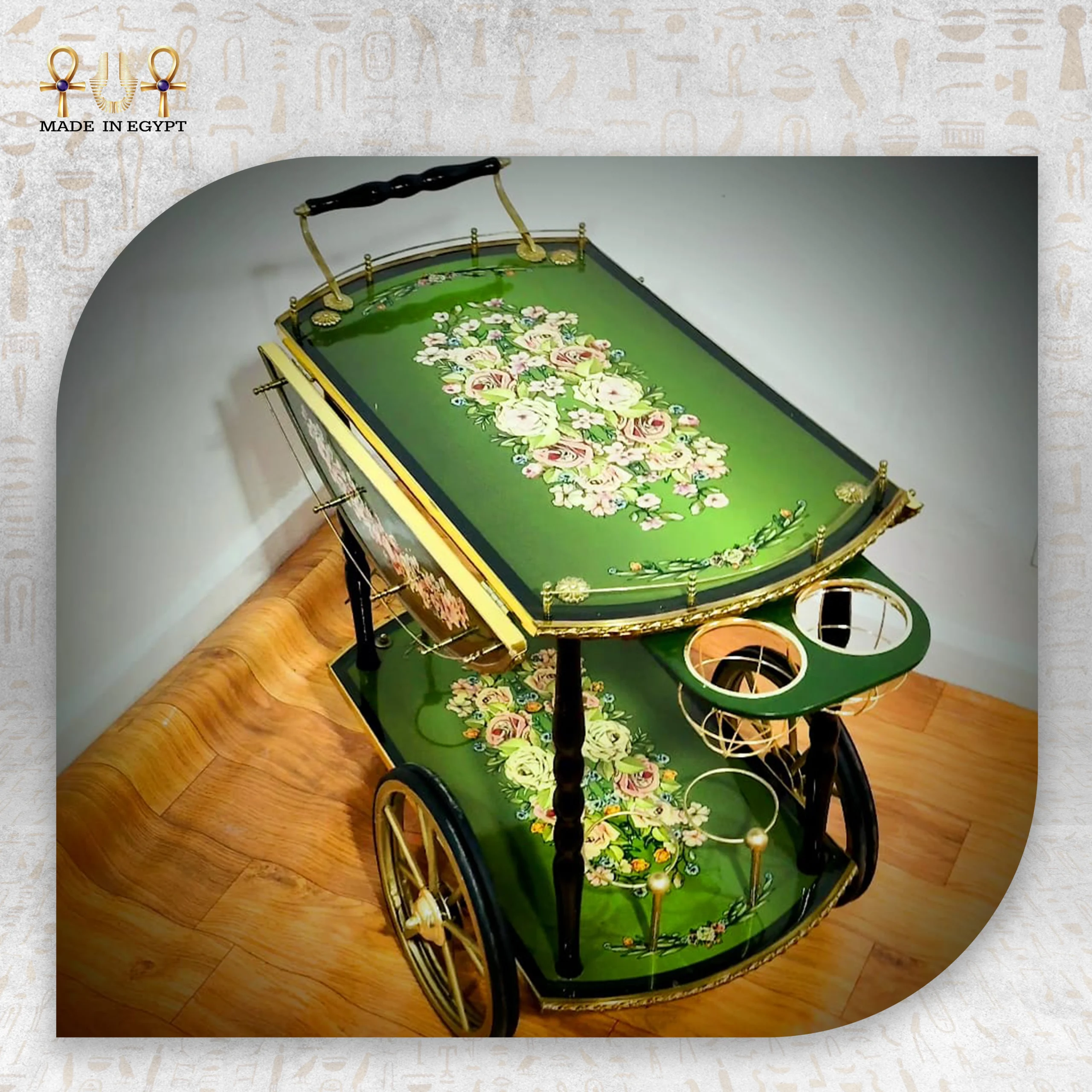 عربية تقديم فاخرة باللون الأخضر الزمردي مزينة بالمركتريه ومطعمة بالنحاس، مقاومة للمياه وسهلة الحركة، تجمع بين جمال الطبيعة والفخامة الملكية.