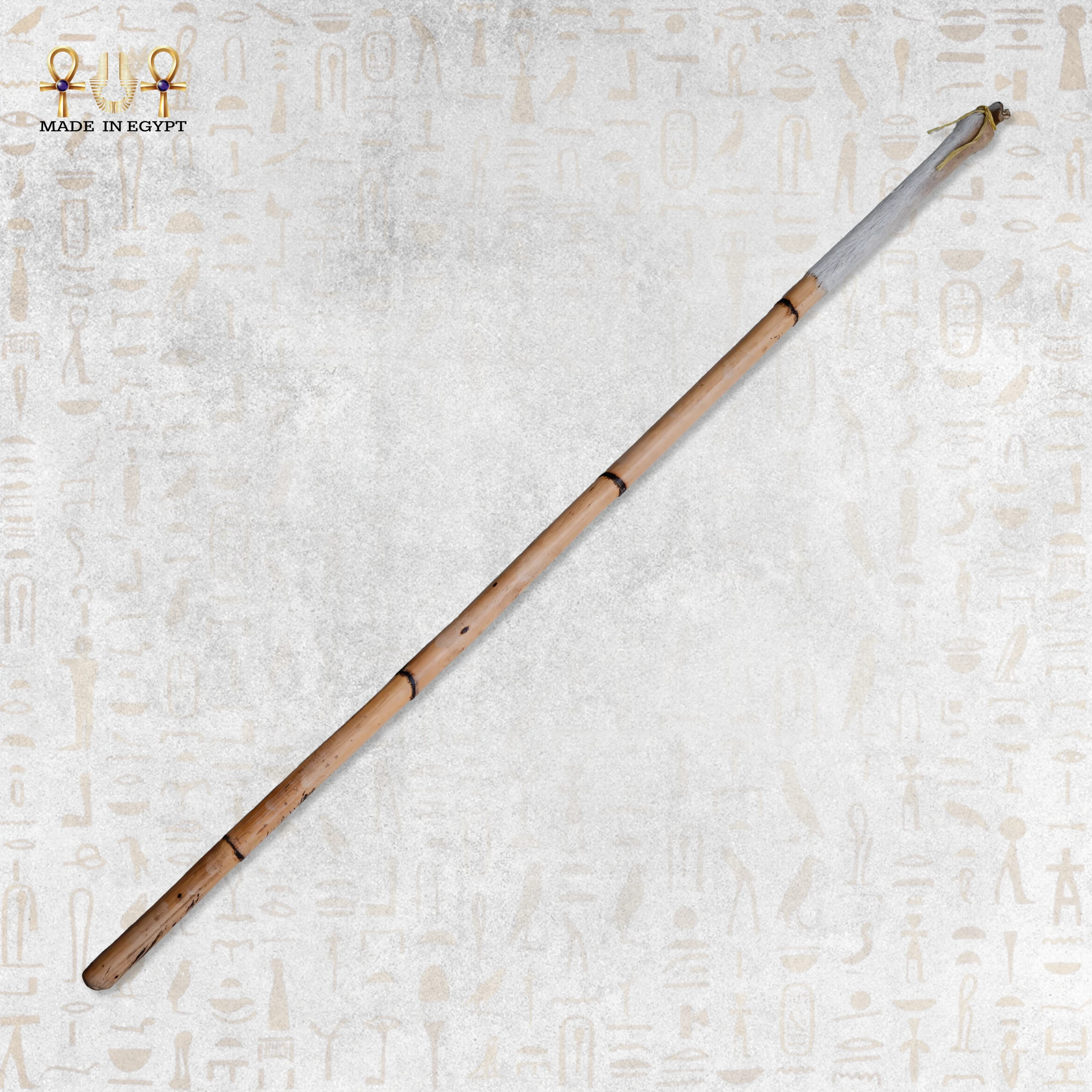 تتميز العصا بغطاء من جلد الماعز الطبيعي المغطى بالفرو الناعم، مما يوفر قبضة دافئة ومريحة. يضفي الفرو لمسة فاخرة تتناغم مع الخيزران الطبيعي، الذي يظهر ملمسه أليافه الطولية الناعمة وخطوطه المميزة التي تحكي قصة الطبيعة المصرية الأصيلة.