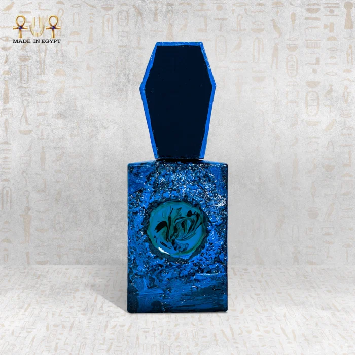 تصميم الزجاجة يحكي قصة الفن المصري الحديث. فالمزيج بين الملمس الخشن والتفاصيل اللامعة يعكس التقاء الحرفية بالتجديد. كما أن انعكاس الضوء على الأسطح الزرقاء يمنحها مظهرًا متغيرًا مع كل زاوية، مما يجعل الزجاجة قطعة ديكور فنية قبل أن تكون عبوة عطر.