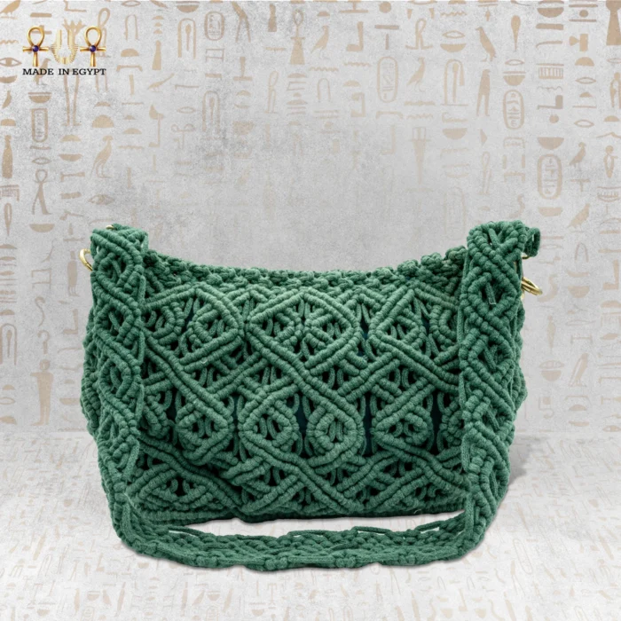علاوة على ذلك، يتميز تصميم الشنطة بنمط مكرمية متداخل بعناية فائقة. تتشابك العقد والخيوط في هندسة دقيقة تعكس مهارة الحرفي المصري واهتمامه بالتفاصيل. هذا النمط الفريد يجعل كل حقيبة من إيميرالد نوت قطعة فنية متفردة لا تتكرر أبدًا.