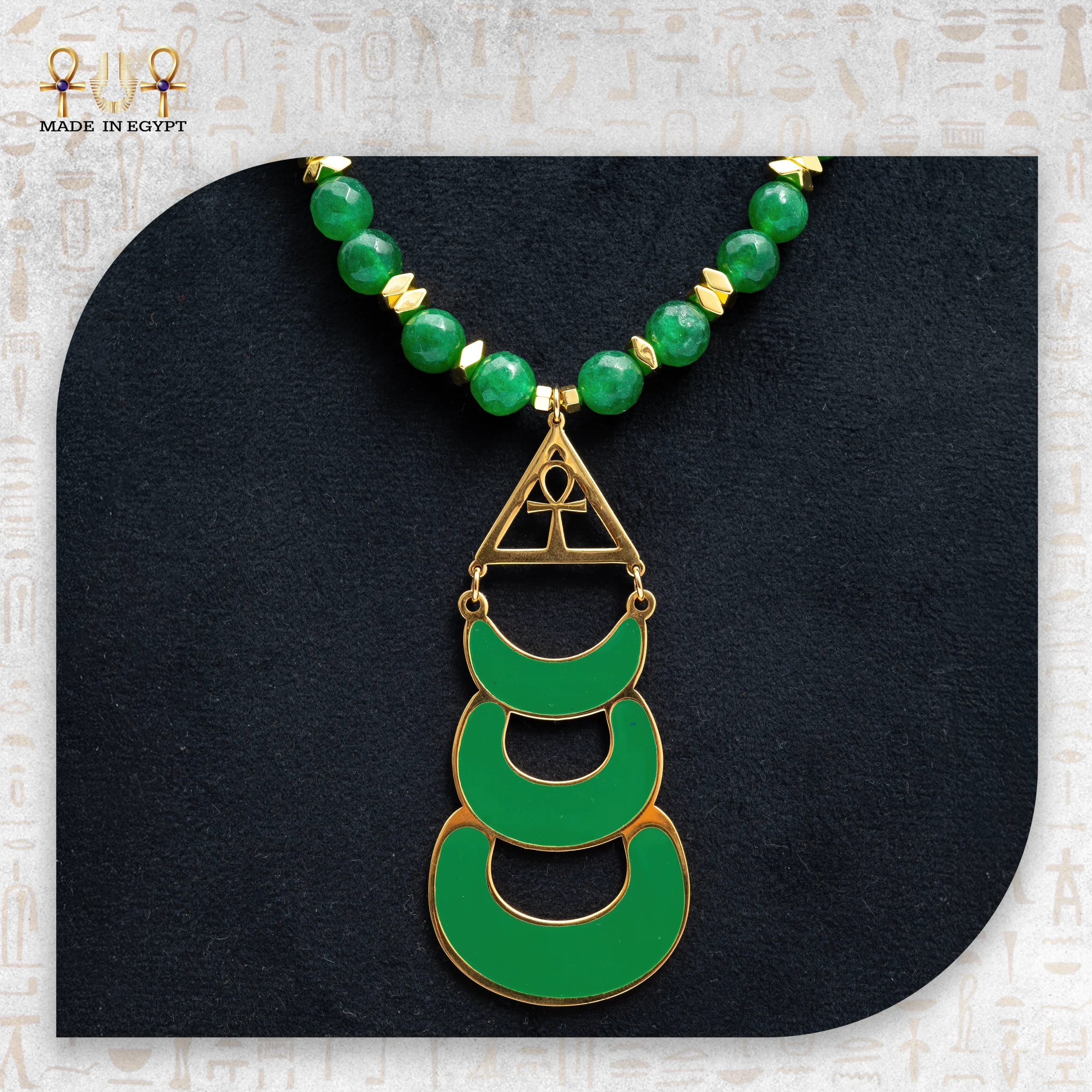 عقد فاخر من العقيق الطبيعي الأخضر مع دلاية نحاس مطلية ذهب بتصميم فرعوني ساحر. قطعة يدويّة مميزة تضيف فخامة وأناقة لأي إطلالة.