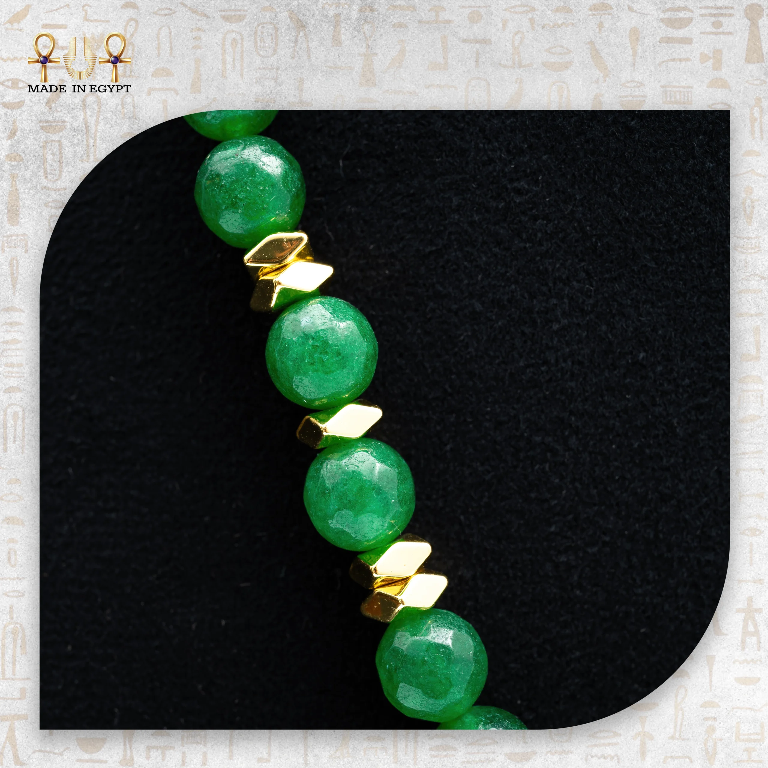 تم اختيار أحجار العقيق الطبيعي بعناية فائقة، بلون أخضر زمردي يخطف الأنظار. هذه الأحجار تعكس طاقة الهدوء والاتزان، وتُقال إنها تعزز الثقة بالنفس وتجلب الحظ والازدهار. بالإضافة إلى ذلك، صُممت كل خرزة وصُقلت بشكل احترافي لتمنح ملمسًا ناعمًا ولمعانًا طبيعيًا، بينما تضيف الفواصل المعدنية الذهبية لمسة فاخرة تزيد من جمال اللون الأخضر.