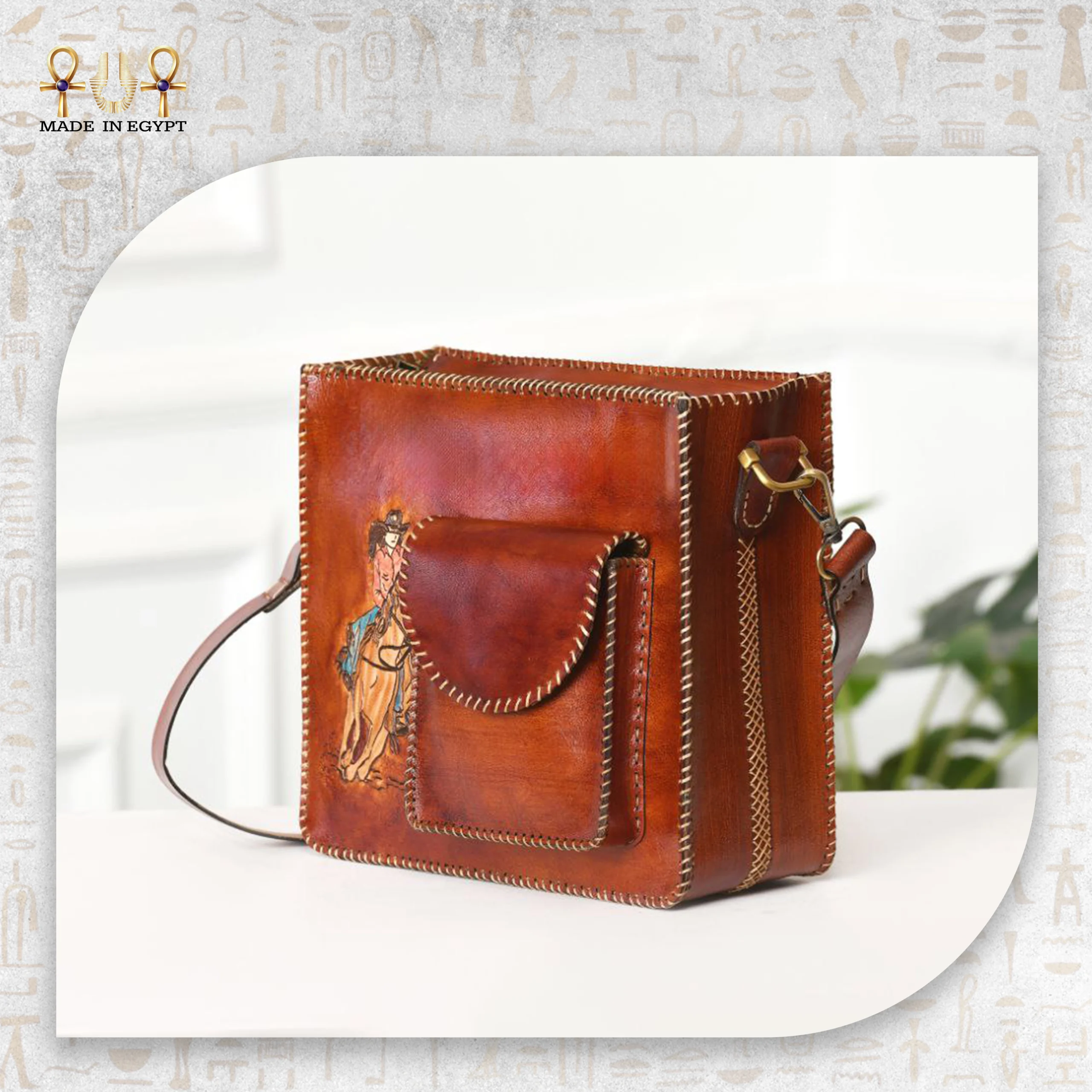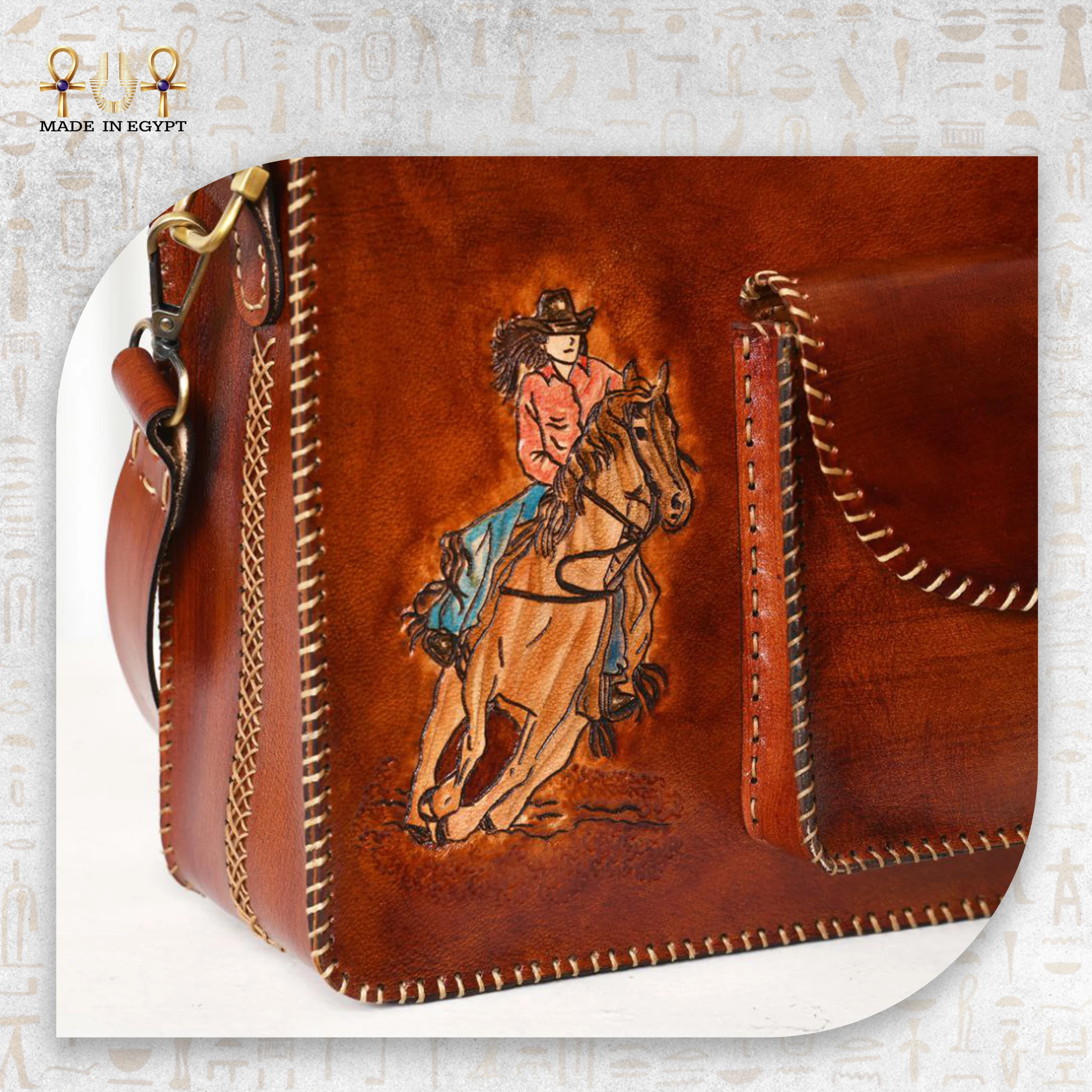 الفارس المرسوم فوق الحصان ليس مجرد زخرفة، بل رمزٌ للقوة والحرية. يربط بين الإنسان والجلد في علاقة قديمة امتدت عبر الزمن. هذه الحقيبة تذكّرك أن الفن لا يجب أن يُعلّق على الحائط ليُقدَّر، بل يمكن أن يُحمل ويُستخدم ويبقى فنًّا خالداً في الحركة والحياة.