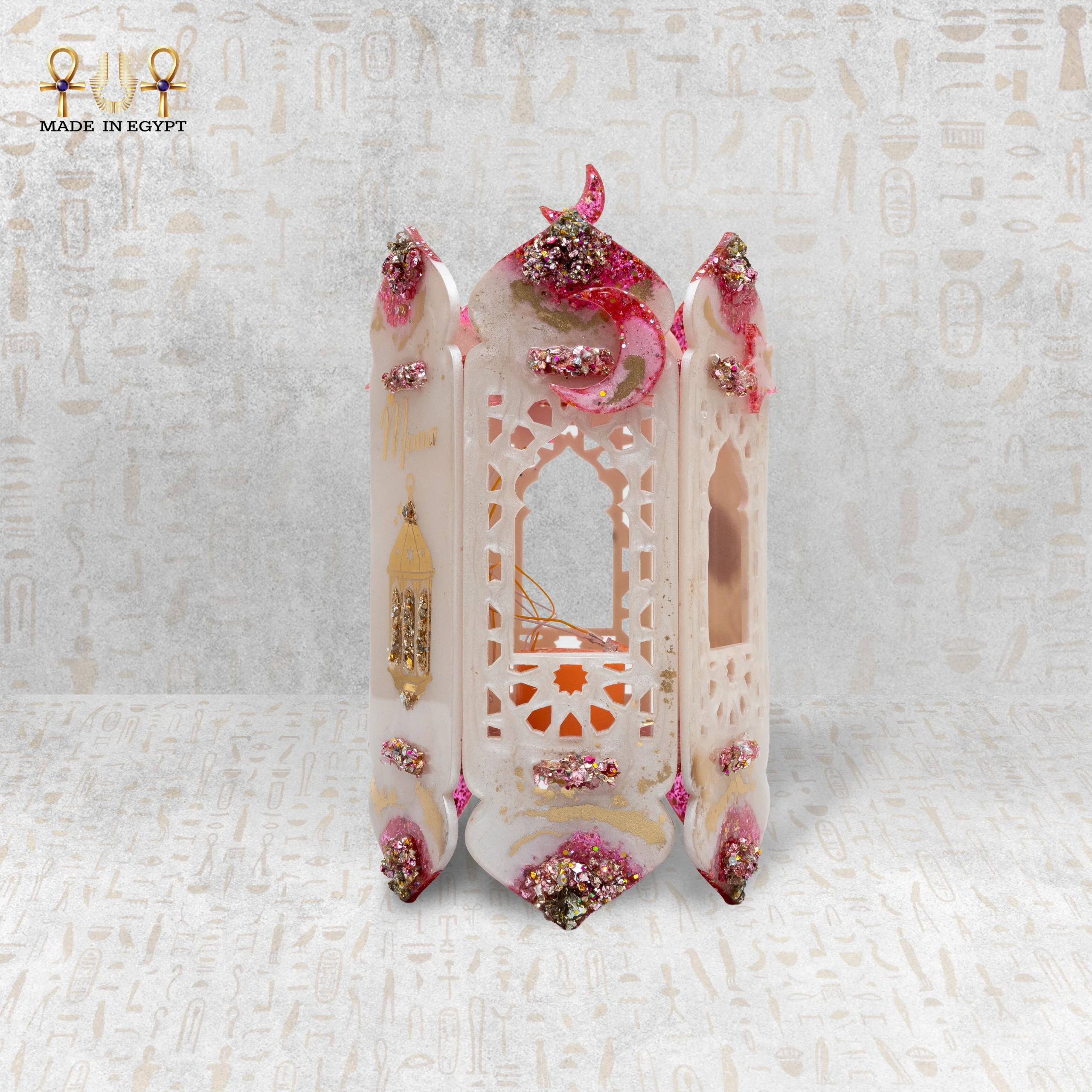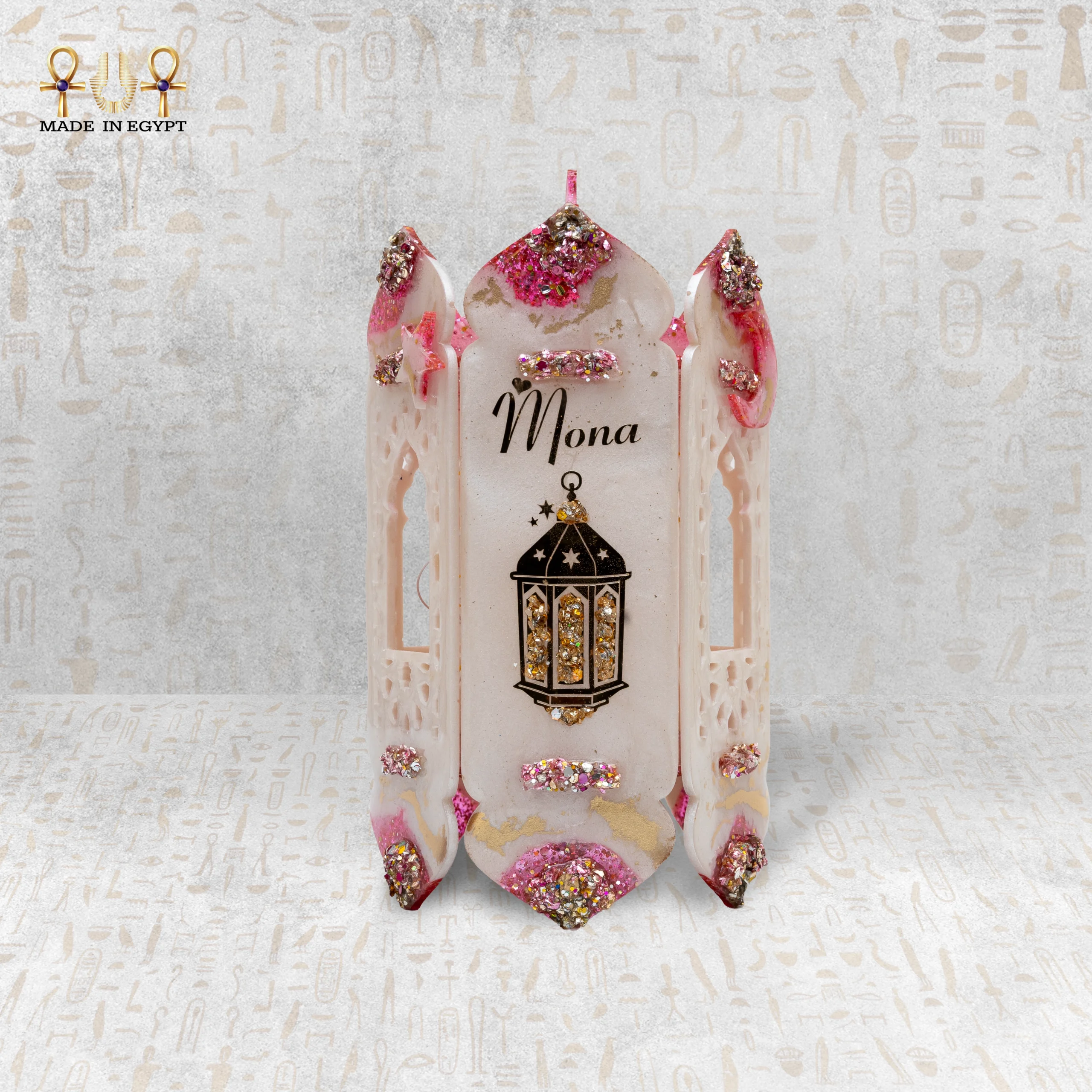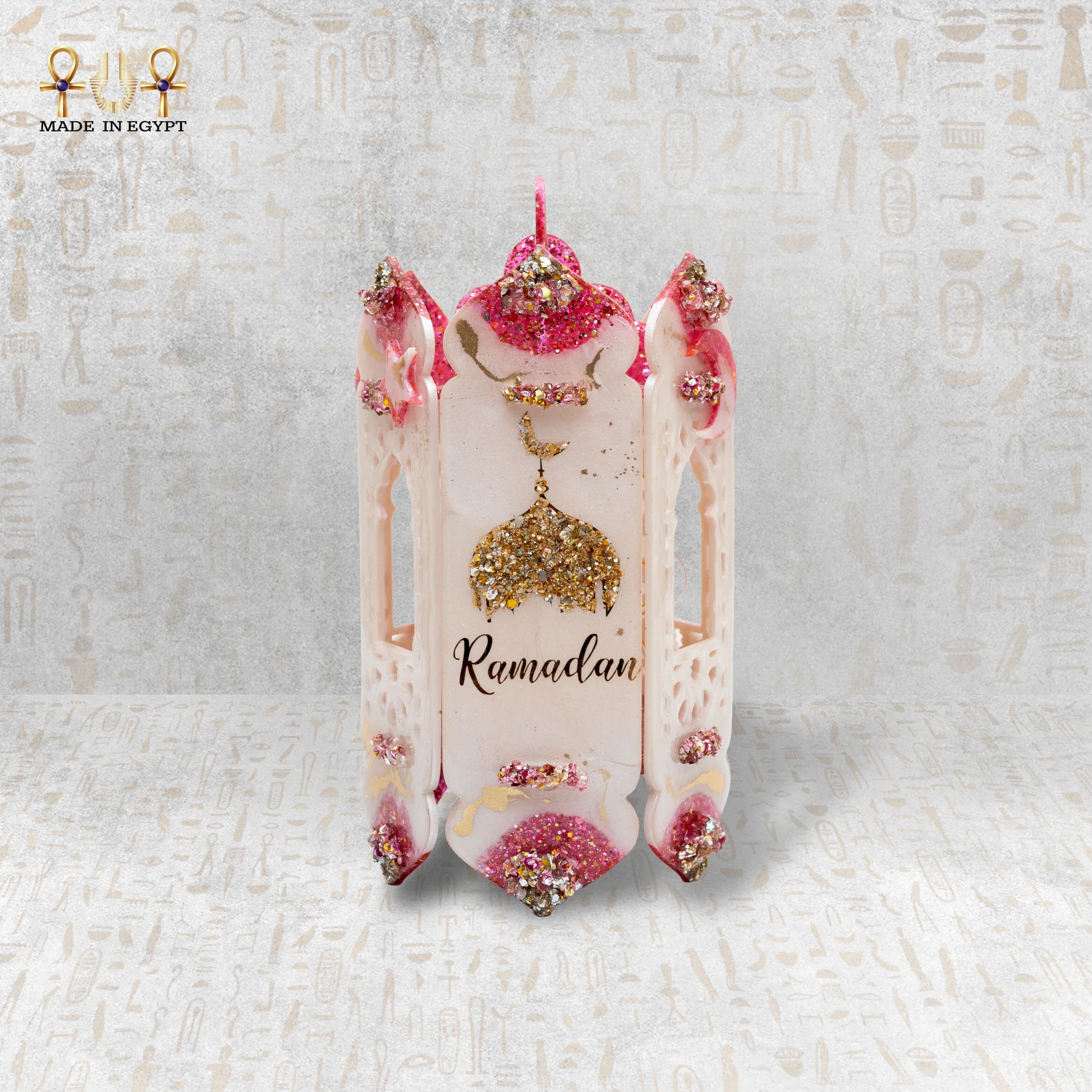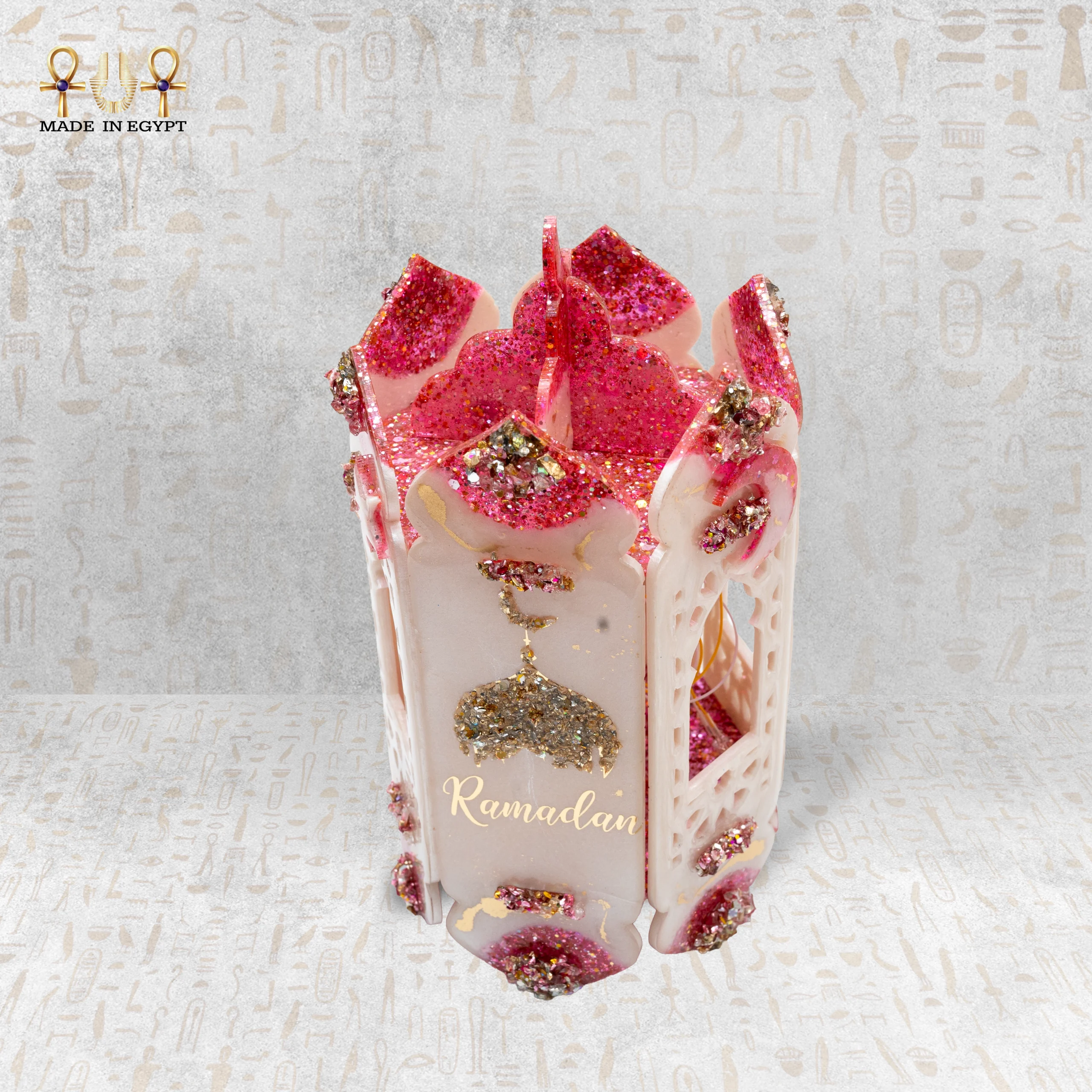 يُعد هذا الفانوس الرمضاني المصنوع من الريزن قطعة فنية تجمع بين الأناقة والروح الشرقية الأصيلة، حيث يتميز بتصميمه الفريد باللون الوردي الناعم مع لمسات ذهبية لامعة تضيف إحساسًا بالفخامة والرقي. تم تزيين الفانوس بتفاصيل دقيقة وعناصر زخرفية مستوحاة من الطابع الرمضاني، مع إمكانية تخصيص الاسم ليصبح قطعة مميزة وفريدة.