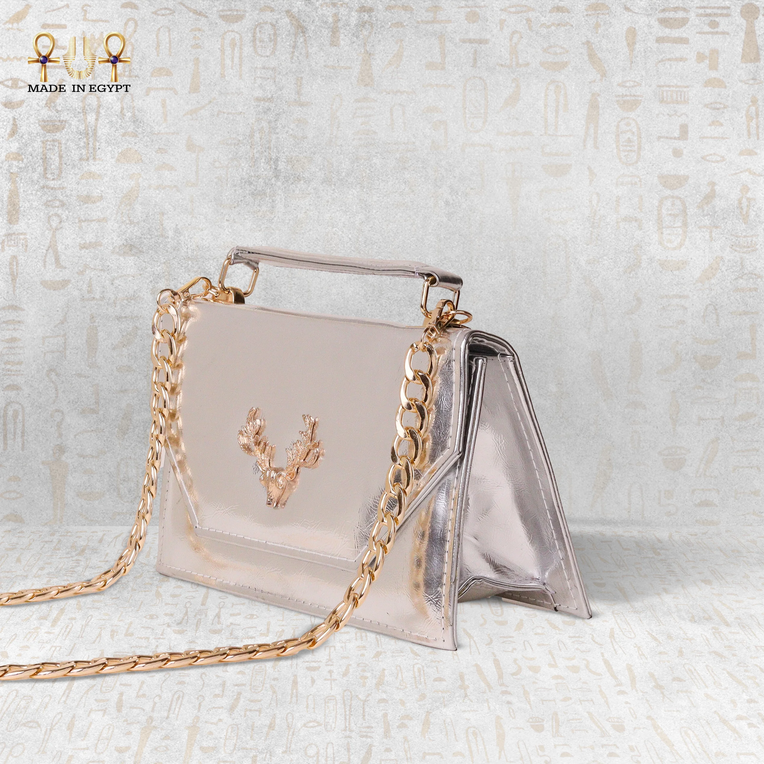 تتميز الحقيبة بهيكل هندسي أنيق يمنحها حضورًا مميزًا في جميع المناسبات، سواء كانت يومية أو رسمية. الخطوط الواضحة والخياطة المتقنة تعكس براعة الصانع المصري، بينما تمنح السلسلة الذهبية لمسة من الفخامة الراقية. علاوة على ذلك، يمكن ارتداء الحقيبة بطريقتين: كحقيبة كتف للمناسبات العملية أو كحقيبة يد أنيقة للإطلالات الرسمية.