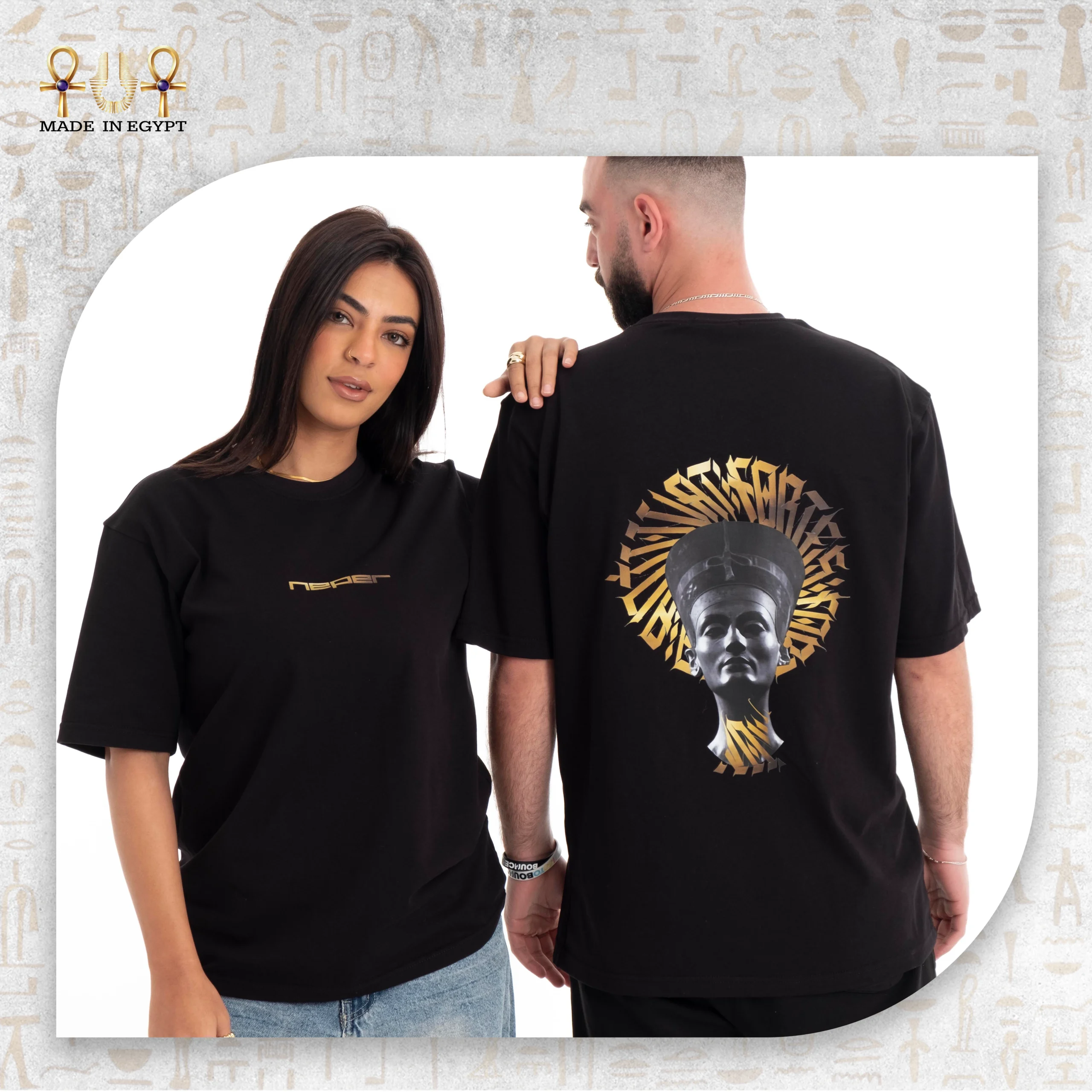 تيشيرت يجسد فخر الهوية المصرية بتصميم جريء يجمع بين الملكة نفرتيتي والخط العصري الذهبي في تناغم مذهل.