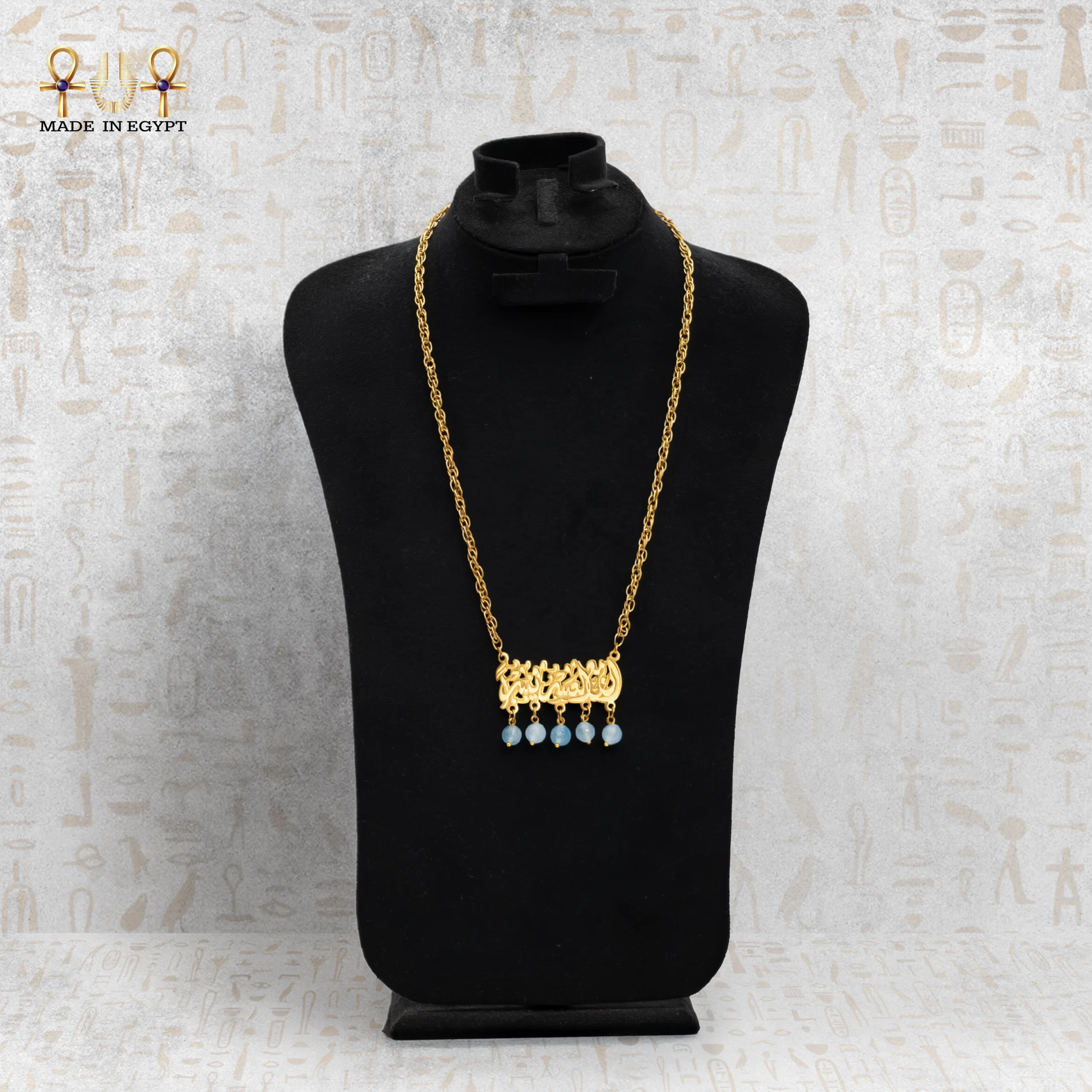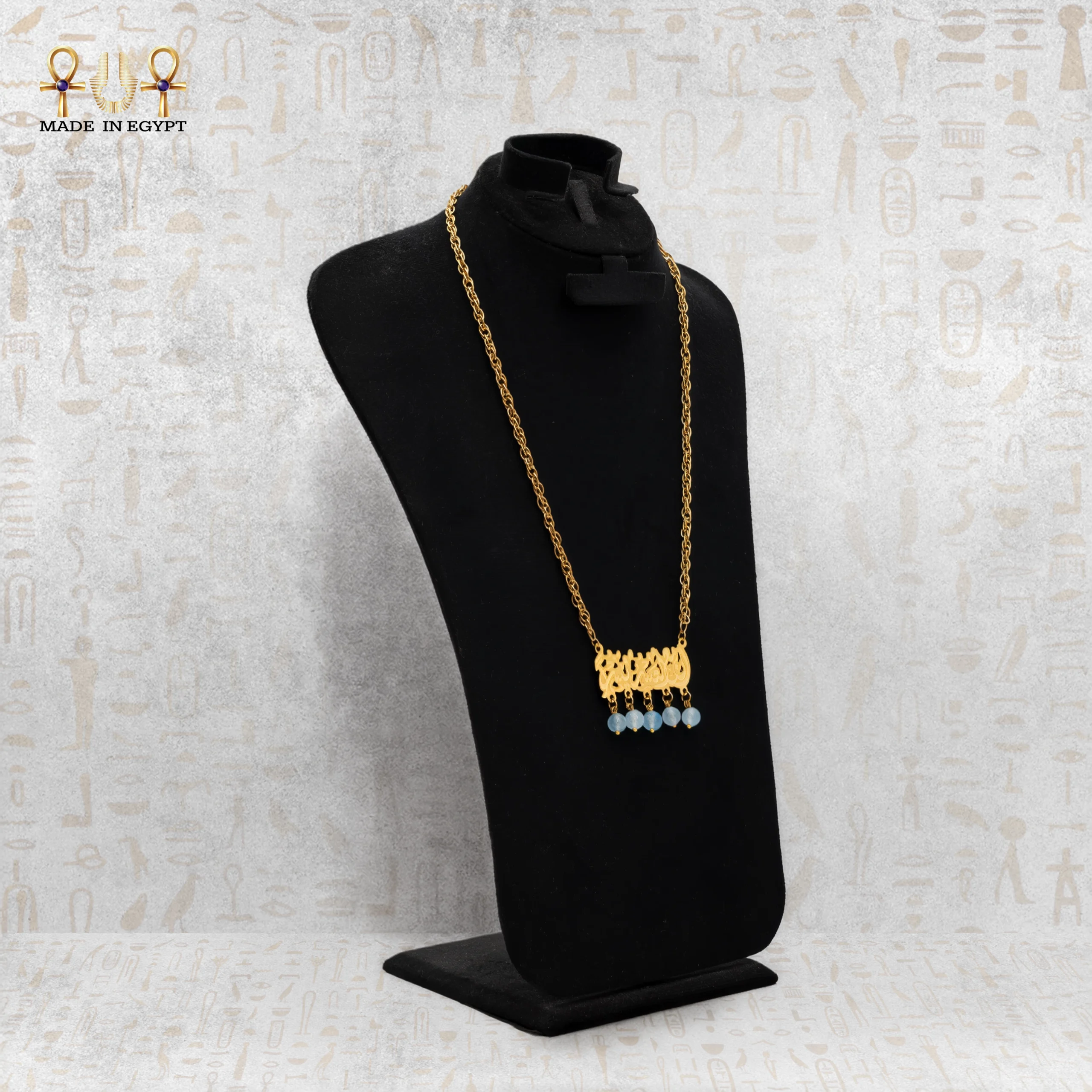قلادة راقية بسلسلة استانلس لا تغيّر لونها، مزودة بدلاية خط عربي من نحاس مطلي ذهب، تتدلى منها أحجار العقيق الأزرق الفاتح لإطلالة هادئة، أنثوية، ومميزة.