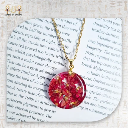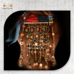 تحيط بكل فص حلية نحاسية دقيقة الصنع منقوشة بزخارف عربية هندسية متقنة، تضيف بُعدًا فنيًا وروحًا تاريخية للقطعة. أما كوينات النحاس الأحمر المنقوشة التي تتدلى برشاقة على أطراف الكردان فتمنحه لمسة شرقية مفعمة بالحركة والإشراق، وكأنها تحكي قصة من قصص الأسواق القديمة في القاهرة أو حلب، حيث كانت الحرفيات العربيات يبدعن في صناعة المجوهرات التي لا تشبه غيرها.