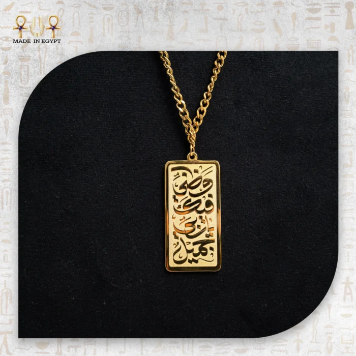 ومن هذه السلسلة تنساب دلاية مستطيلة من نحاس مطلي ذهب، منقوشة بخط عربي يجمع بين الانسيابية والجرأة. النقش على سطح الدلاية يبدو كأنه لوحة صغيرة تحمل رسالة، أو كلمات اقتُطعت من حكاية قديمة أعادت الحرف ليعيش من جديد. كل حرف محفور بدقة، يعكس الضوء بطريقة تجعل الدلاية تتلألأ مع كل حركة، وكأنها قطعة فن ترتديها على صدرك.