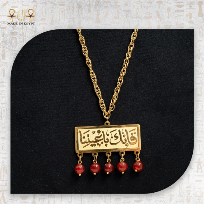 قلادة أنيقة بسلسلة استانلس لا يتغير لونها، مزودة بدلاية مستطيلة من نحاس مطلي ذهب منقوشة بالخط العربي، وتزينها أحجار العقيق الأحمر المتدلية لمنح إطلالة راقية تجمع بين التراث والجمال العصري.