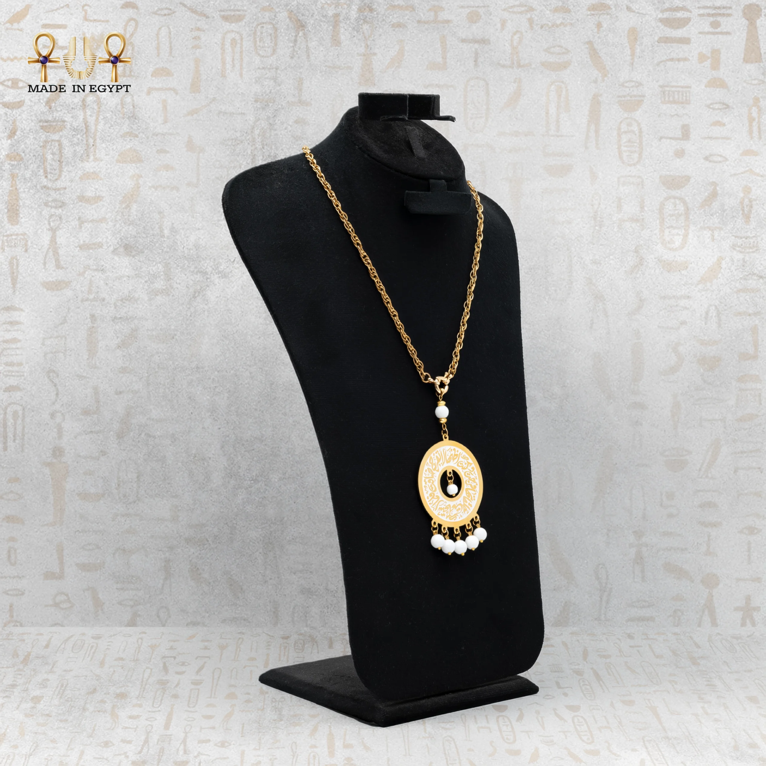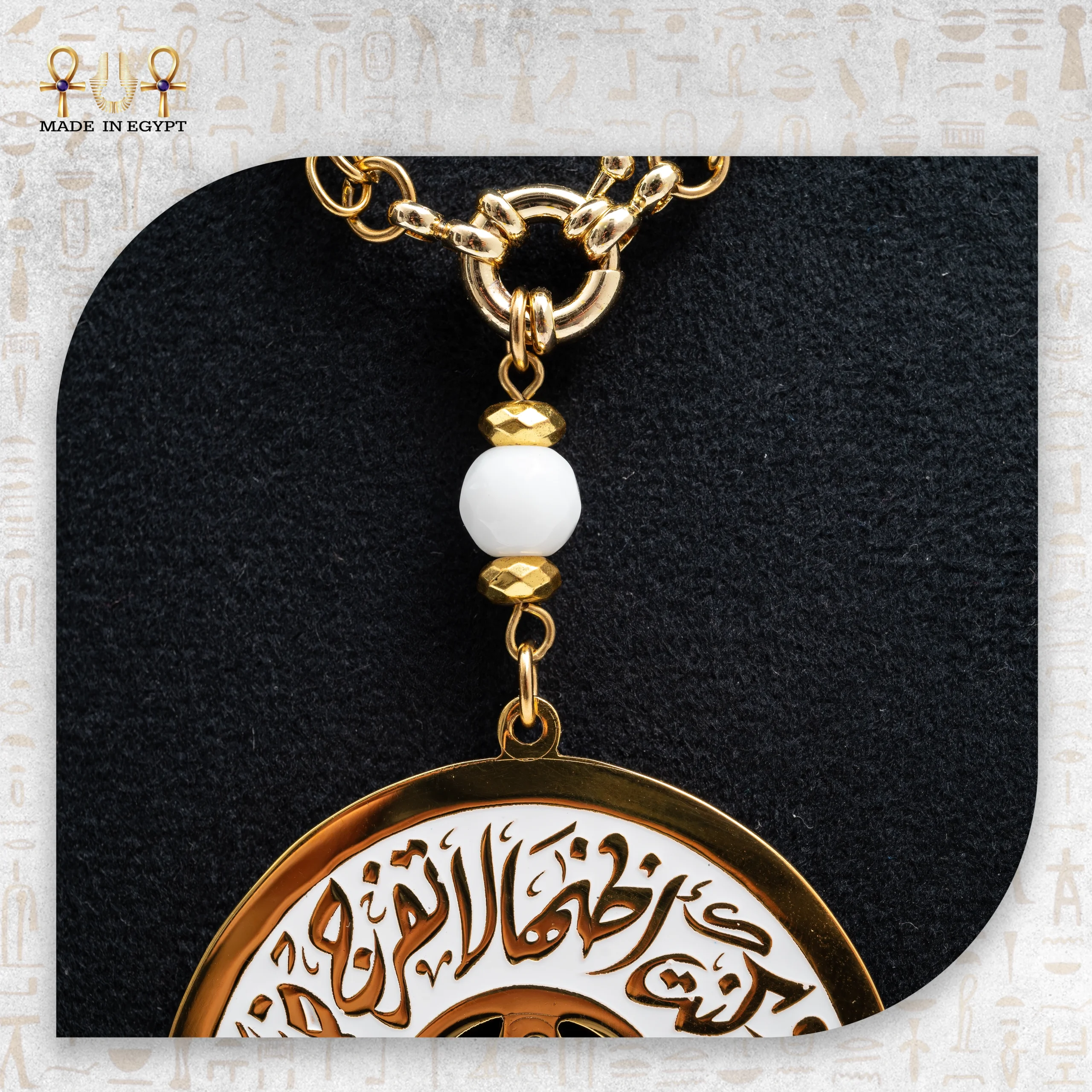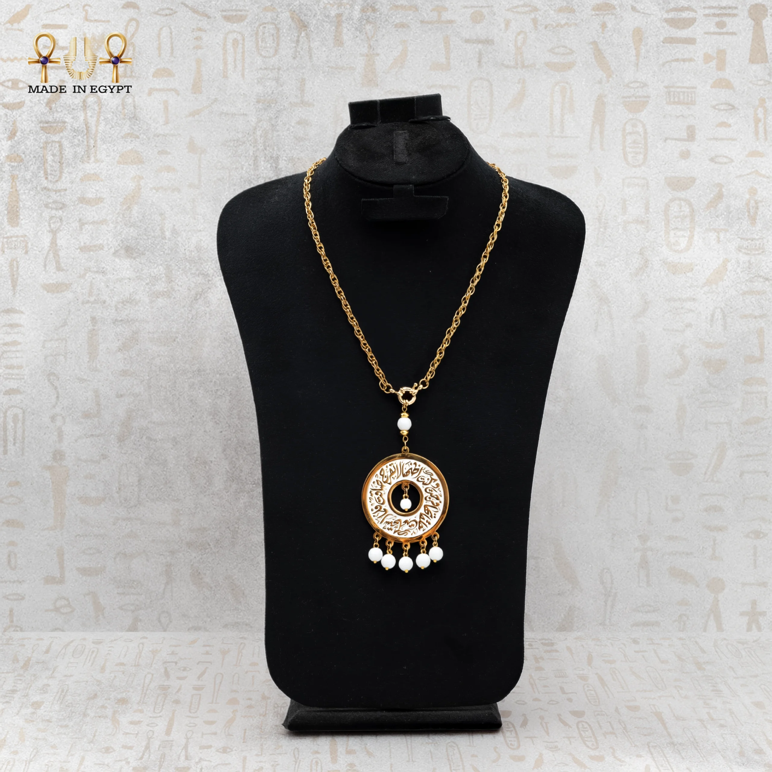 صُممت القلادة من نحاس مطلي ذهب بلمعة دافئة وأنيقة. وفي قلب التصميم، تظهر دلاية دائرية منقوشة بخط عربي راقٍ يضيف لمسة فنية مميزة. لذلك، يمنحك العقد حضورًا هادئًا لكنه لافت في الوقت نفسه.