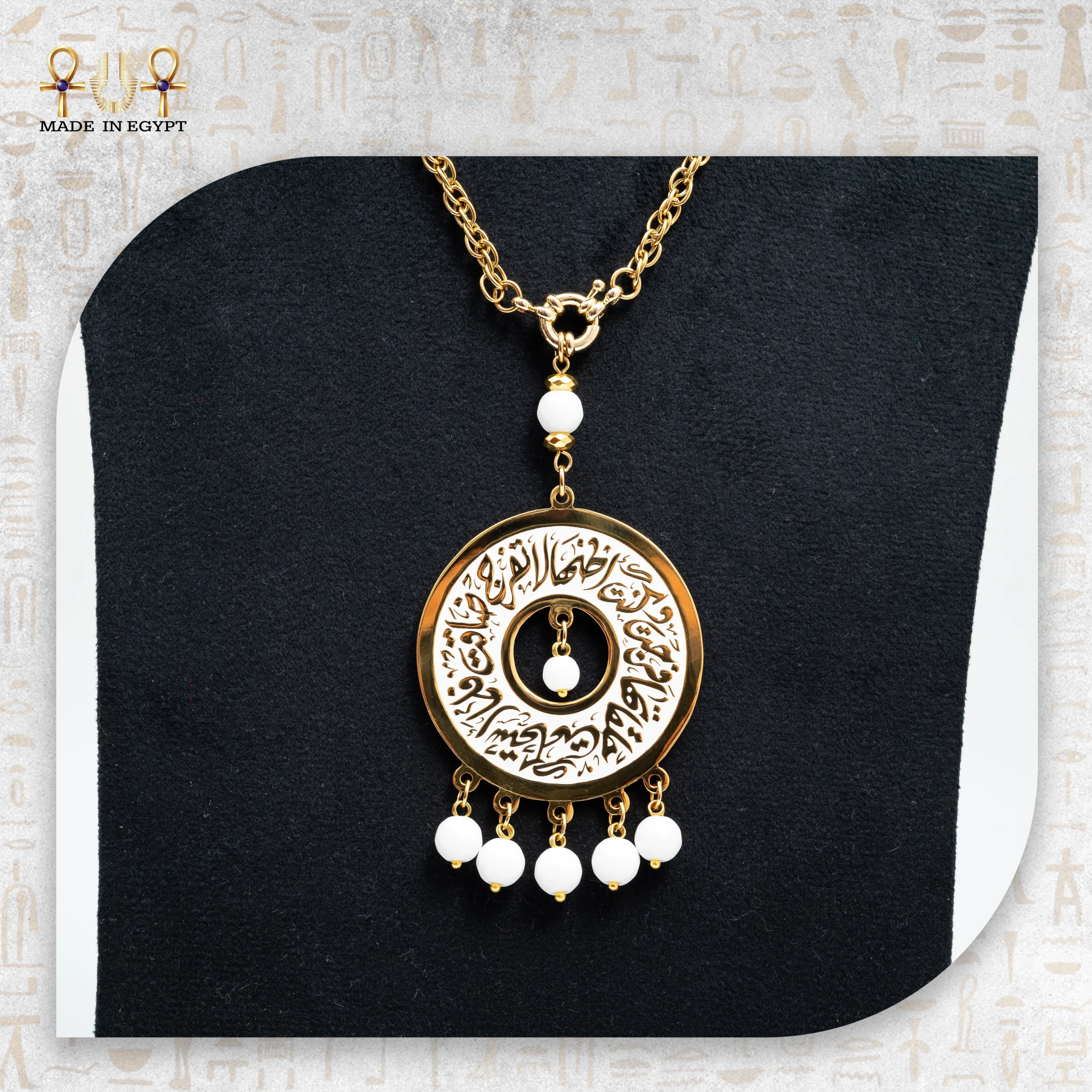 عقد نحاس مطلي ذهب بتصميم دائري مزخرف بالخط العربي، يتوسطه حجر عقيق أبيض يمنح لمسة من النقاء والرقي. قطعة أنيقة تجمع بين التراث والجمال العصري، وتناسب جميع الإطلالات اليومية والمميزة.