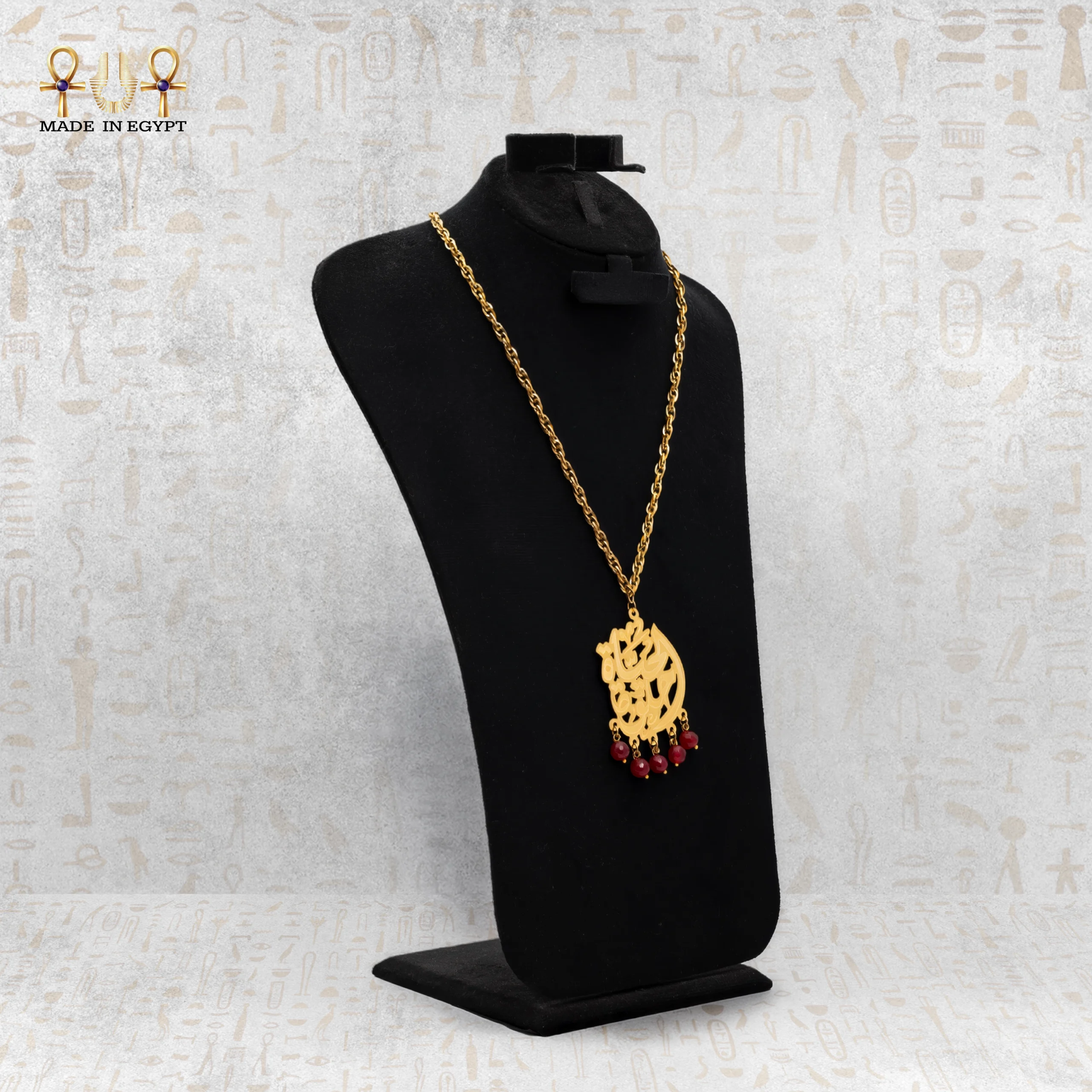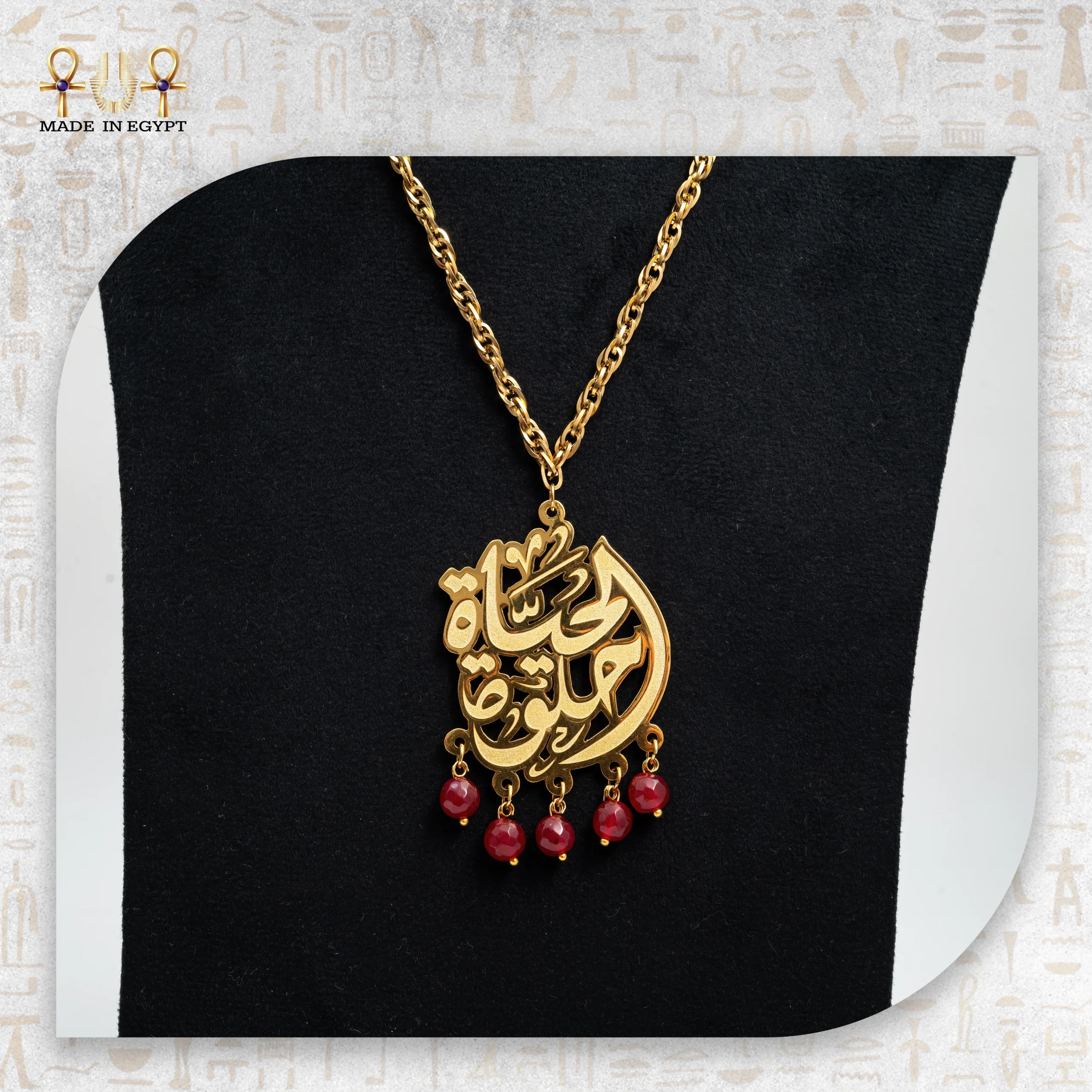 قلادة أنيقة بسلسلة استانلس لا يغيّر لونها، ودلاية خط عربي من نحاس مطلي ذهب مع أحجار عقيق أحمر تضيف لمسة فخامة وشغف. تصميم يجمع بين التراث والجمال العصري.