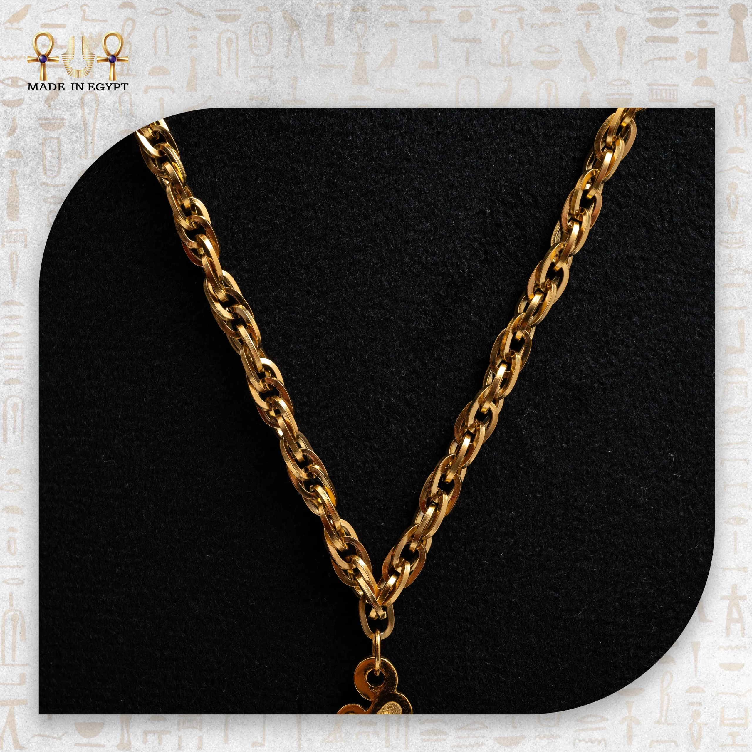 تمتد السلسلة لتحتضن دلاية مصنوعة من نحاس مطلي ذهب، صيغت بعناية لتظهر الخط العربي في أجمل صوره. الخط يلتف بانسيابية حول نفسه ليكوّن شكلًا فنيًا يعبّر عن عمق التراث وجمال الحروف. هذا التصميم ليس مجرد زخرفة، بل انعكاس لروح المدن العربية التي حملت الفن في شوارعها وأسواقها وقلوب ناسها.
