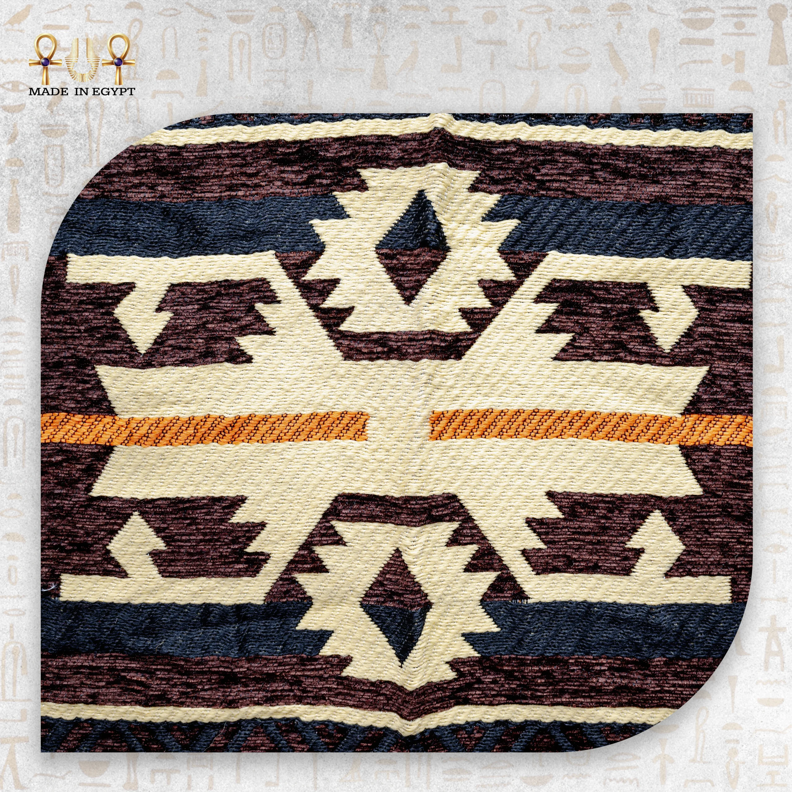 يتميز كليم التراث الأصيل بتدرجات ألوان غنية تشمل البني والنبيذي والكريمي والأزرق الداكن، مع لمسات من الأخضر والذهبي. هذه الألوان تمنح الكليم إحساسًا بالدفء والأصالة، بينما النقوش الهندسية المستوحاة من التراث البدوي والنوبي تضفي شخصية قوية وتروي حكاية كل قطعة.