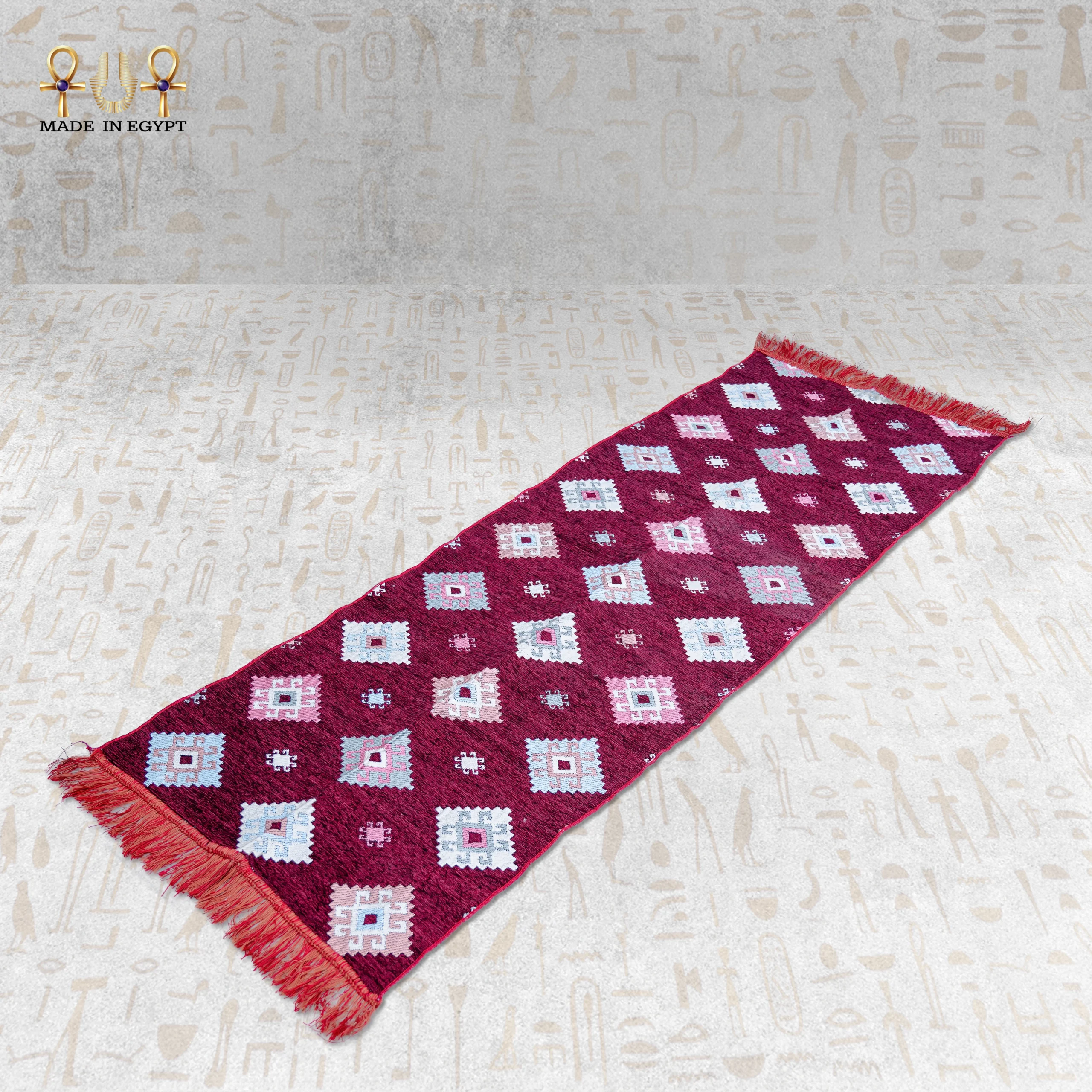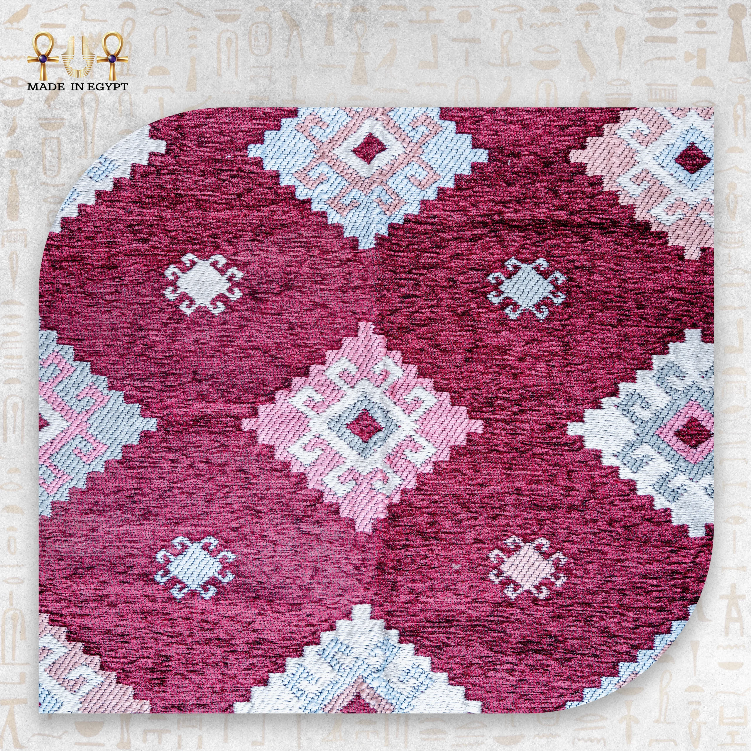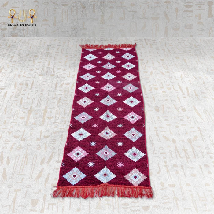 تتألق لوحة ألوان الكليم بتدرجات العنابي العميق، الوردي الناعم، الأبيض، والأزرق الفاتح، لتخلق تناغمًا بصريًا ينبض بالحياة. النقوش الهندسية المنتظمة مستوحاة من الزخارف التراثية النوبية، مما يضفي على كل قطعة لمسة فنية تجمع بين الجمال التقليدي والذوق العصري. هذا التنسيق يجعل الكليم مناسبًا لكل مساحات المنزل، سواء الممرات أو غرف الجلوس أو المداخل.