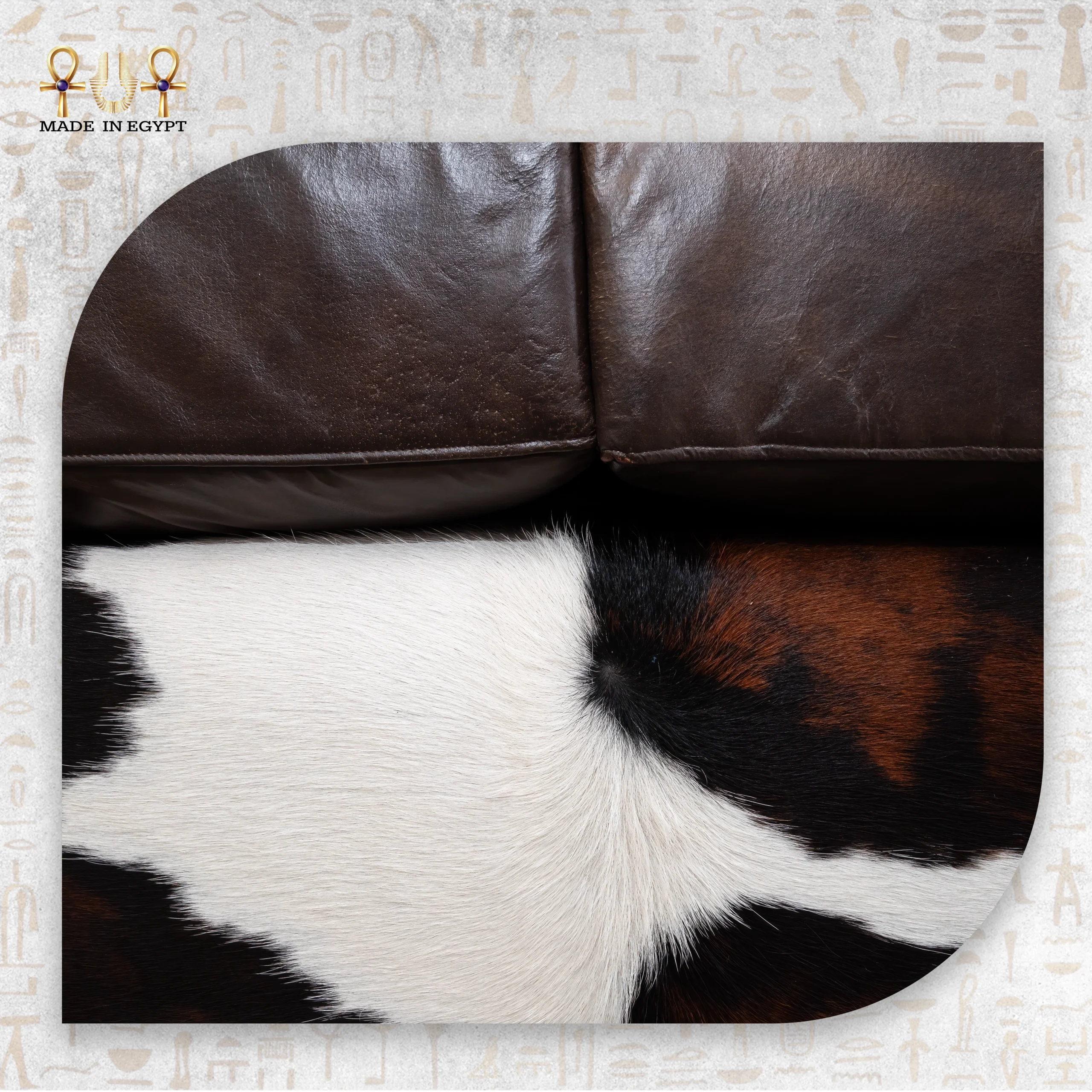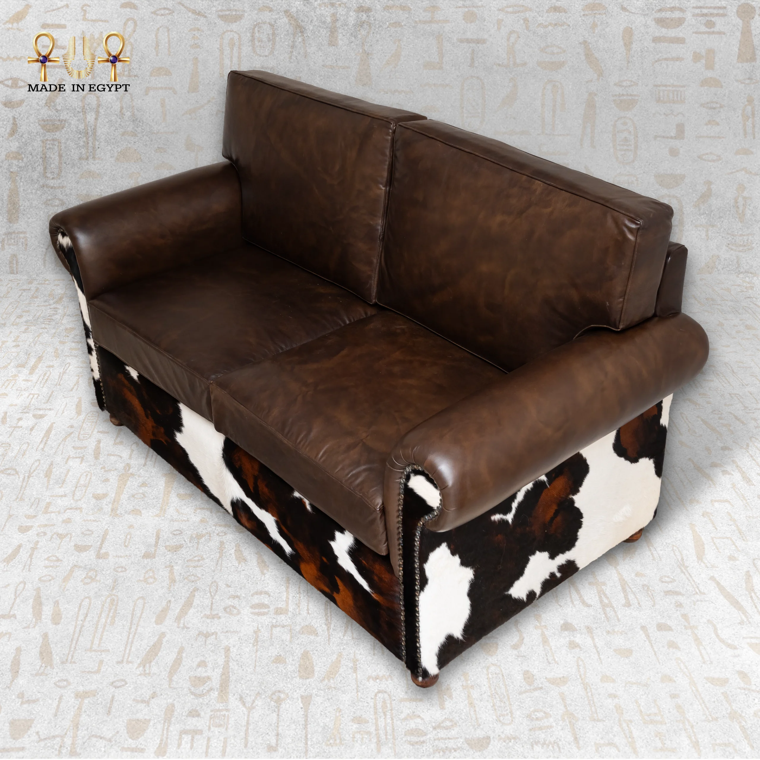علاوة على ذلك، تضيف نقشة البقري الطبيعية بدرجات البني، الأبيض، والأسود لمسة حيوية. كما تجعل كل كنبة قطعة فريدة لا تشبه غيرها.