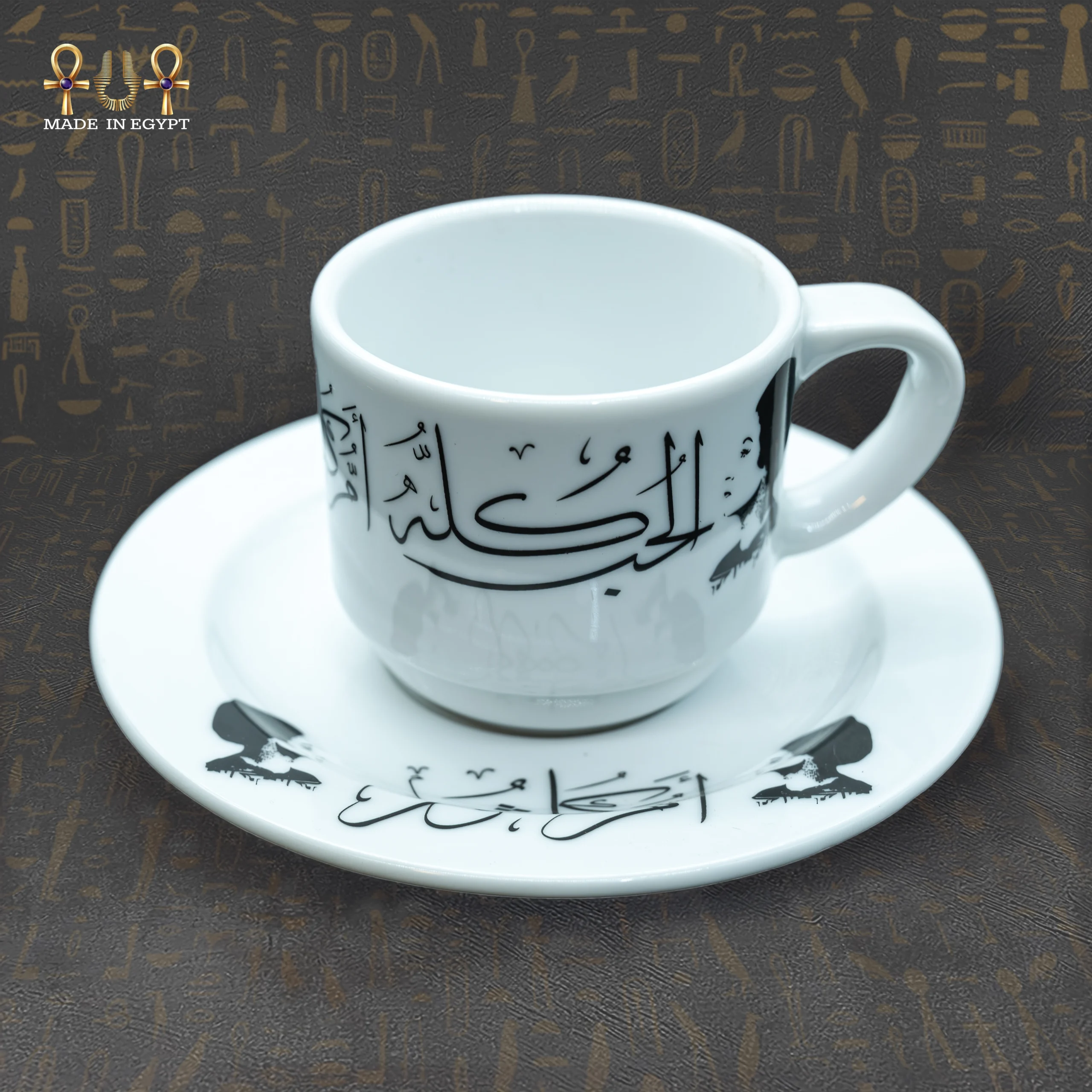 طقم بورسلين فاخر مكوّن من 6 فناجين و6 أطباق مزين بصورة أم كلثوم وكلمات أغنية “الحب كله”.