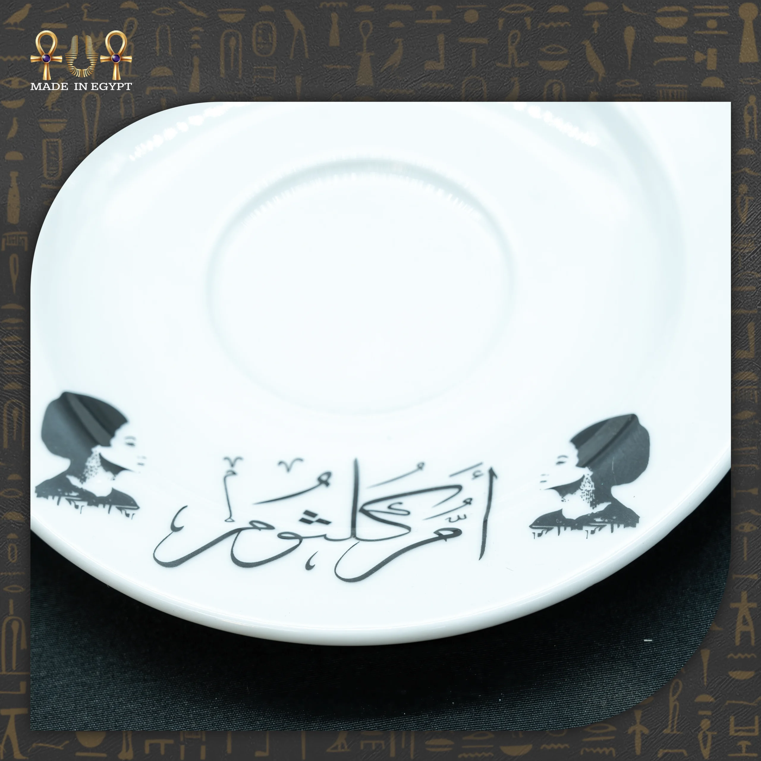 يمثل الطقم تكريمًا لأسطورة الغناء العربي أم كلثوم. يحمل كل فنجان وصحن صورتها الشهيرة مع كلمات من أغنيتها الخالدة “الحب كله” مكتوبة بخط عربي أنيق. يضفي الجمع بين الأبيض النقي والخطوط السوداء لمسة من الرقي ويذكّر بموسيقى الزمن الجميل. كما تضيف التفاصيل الذهبية حول الحواف لمسة فاخرة تزيد من أناقة الطقم.