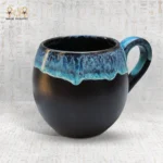 يأتي الكوب بدرجة لون أسود مطفي أنيق، يتدرج في أعلاه إلى تماوجات لونية من الأزرق البحري والسماوي تشبه تدفق الماء على جدران الفخار، ما يضفي عليه طابعًا طبيعيًا ساحرًا مستوحى من تلاقي الأرض بالماء.