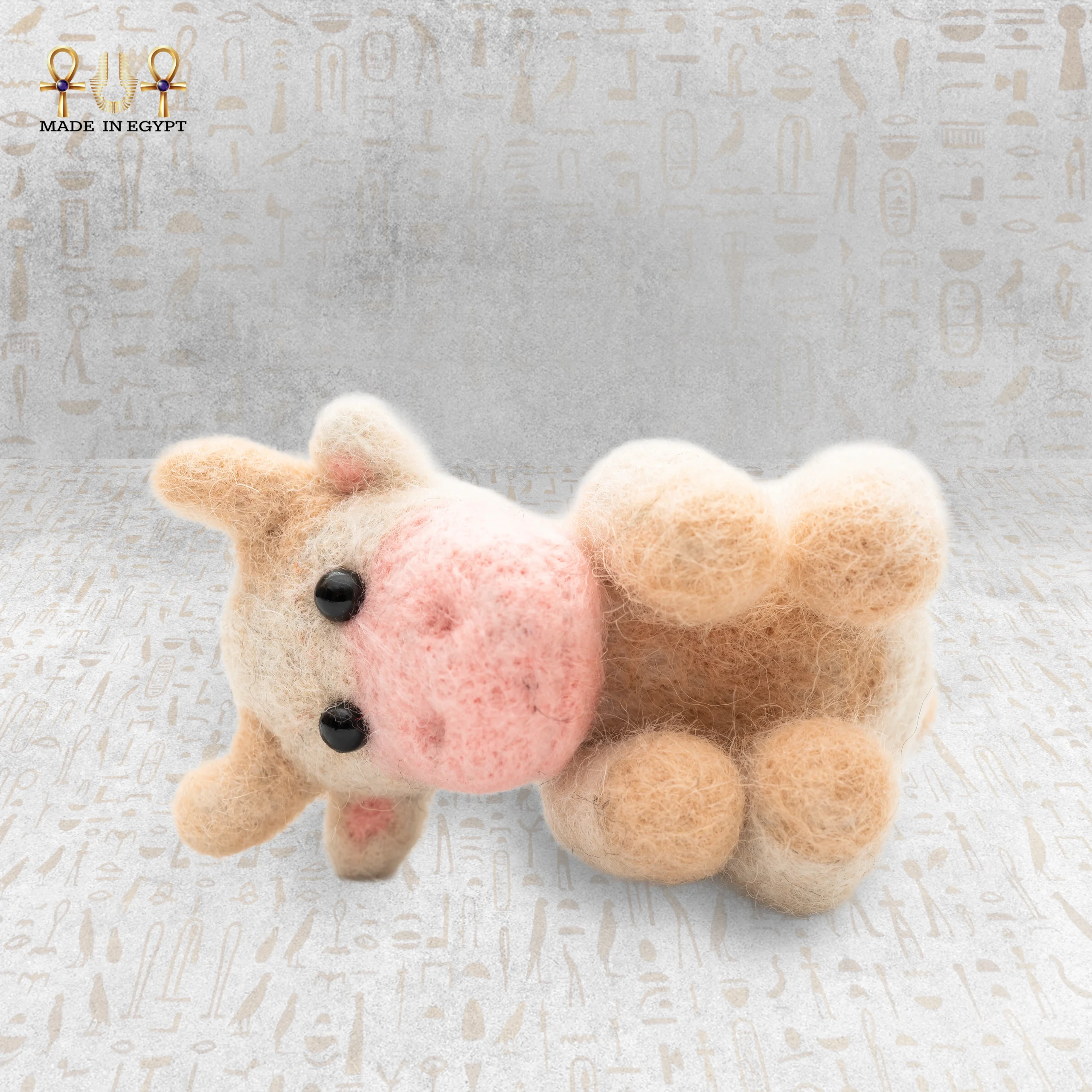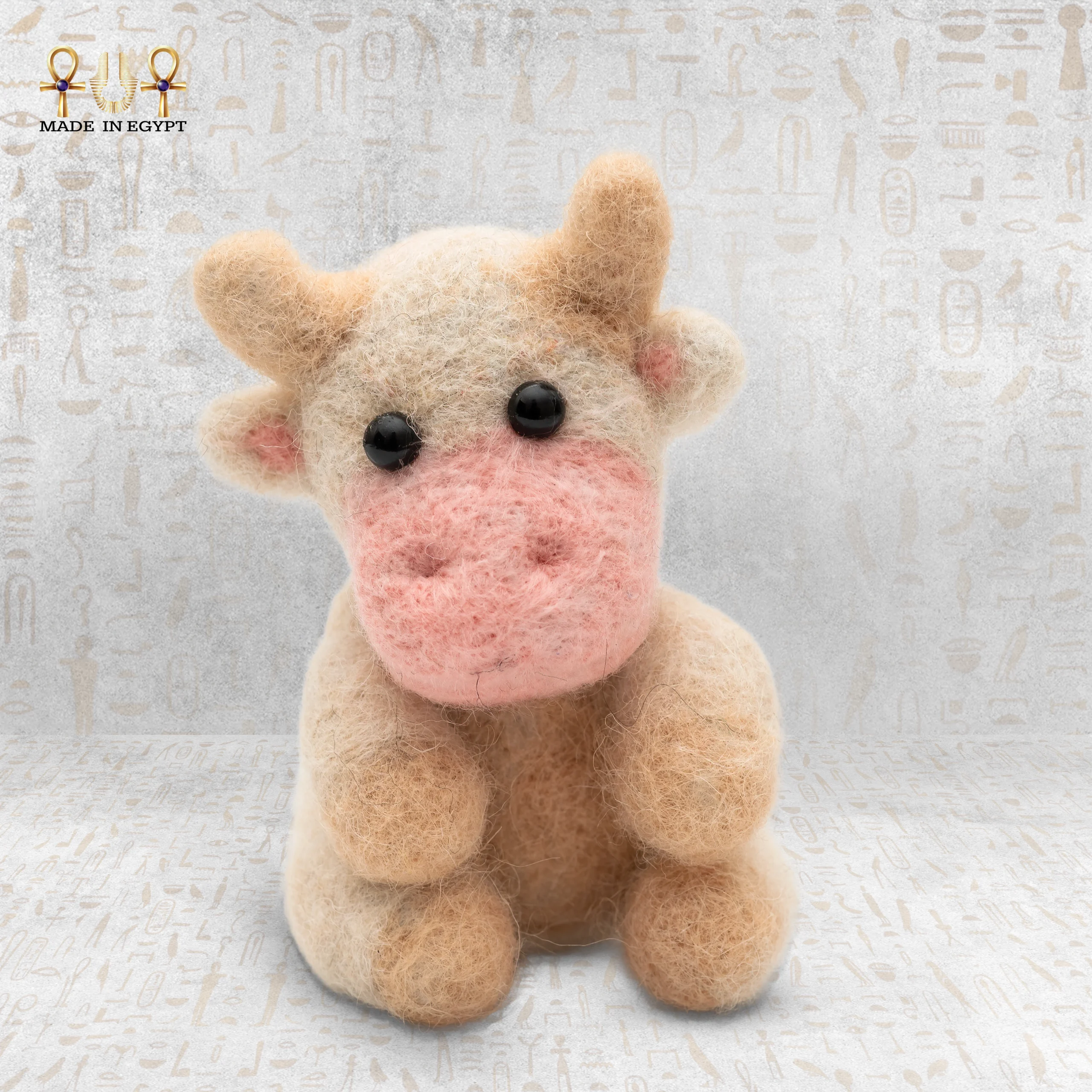 صُنعت لولو البقرة يدويًا باستخدام تقنية التلبيد (الفلت) بخامات صوف طبيعية عالية الجودة، ما يمنحها ملمسًا ناعمًا ودافئًا يختلف عن الدمى التقليدية. يظهر العمل اليدوي بوضوح في تفاصيل التشكيل الدقيقة، حيث تم الاهتمام بكل جزء بعناية ليخرج الشكل النهائي متوازنًا ولطيفًا. هذا الطابع اليدوي يجعل كل قطعة فريدة، إذ لا توجد دميتان متطابقتان تمامًا، وهو ما يضيف قيمة خاصة للمنتج.